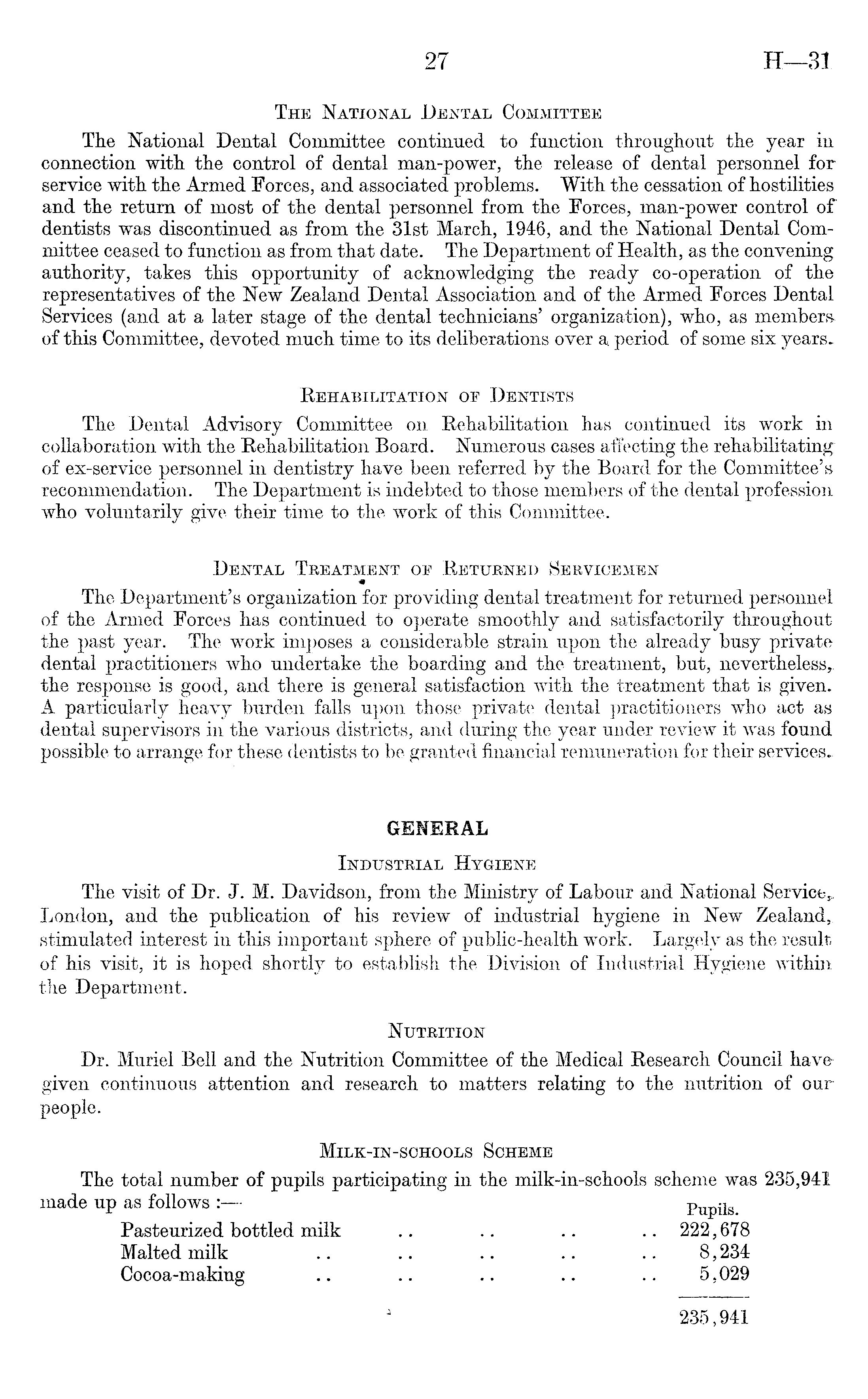 The National Dental Committee The National Dental Committee continued to function throughout the year in connection with the control of dental man-power, the release of dental personnel for service with the Armed Forces, and associated problems. With the cessation of hostilities and the return of most of the dental personnel from the Forces, man-power control of dentists was discontinued as from the 31st March, 1946, and the National Dental Committee ceased to function as from that date. The Department of Health, as the convening: authority, takes this opportunity of acknowledging the ready co-operation of the representatives of the New Zealand Dental Association and of the Armed Forces Dental Services (and at a later stage of the dental technicians' organization), who, as membersof this Committee, devoted much time to its deliberations over a period of some six years. Rehabilitation of Dentists The Dental Advisory Committee on Rehabilitation has continued its work in collaboration with the Rehabilitation Board. Numerous cases affecting the rehabilitating of ex-service personnel in dentistry have been referred by the Board for the Committee's recommendation. The Department is indebted to those members of the dental profession who voluntarily give their time to the work of this Committee. Dental Treatment op Returned Servicemen The Department's organization for providing dental treatment for returned personnel of the Armed Forces has continued to operate, smoothly and satisfactorily throughout the past year. The work imposes a considerable strain upon the already busy private dental practitioners who undertake the boarding and the treatment, but, nevertheless,, the response is good, and there is general satisfaction with the treatment that is given. A particularly heavy burden falls upon those private dental practitioners who act as dental supervisors in the various districts, and during the year under review it was found possible to arrange for these dentists to be granted financial remuneration for their services. GENERAL Industrial Hygiene The visit of Dr. J. M. Davidson, from the Ministry of Labour and National Service,. London, and the publication of his review of industrial hygiene in New Zealand* stimulated interest in this important sphere of public-health work. Largely as the resultof his visit, it is hoped shortly to establish the Division of Industrial Hygiene within the Department. Nutrition Dr. Muriel Bell and the Nutrition Committee of the Medical Research Council have given continuous attention and research to matters relating to the nutrition of our people. Milk-in-schools Scheme The total number of pupils participating in the milk-in-schools scheme was 235,941 made up as follows : Pupils Pasteurized bottled milk .. .. .. .. 222,678 Malted milk .. .. .. .. .. 8,234 Cocoa-making .. .. .. .. .. 5,029 235,941