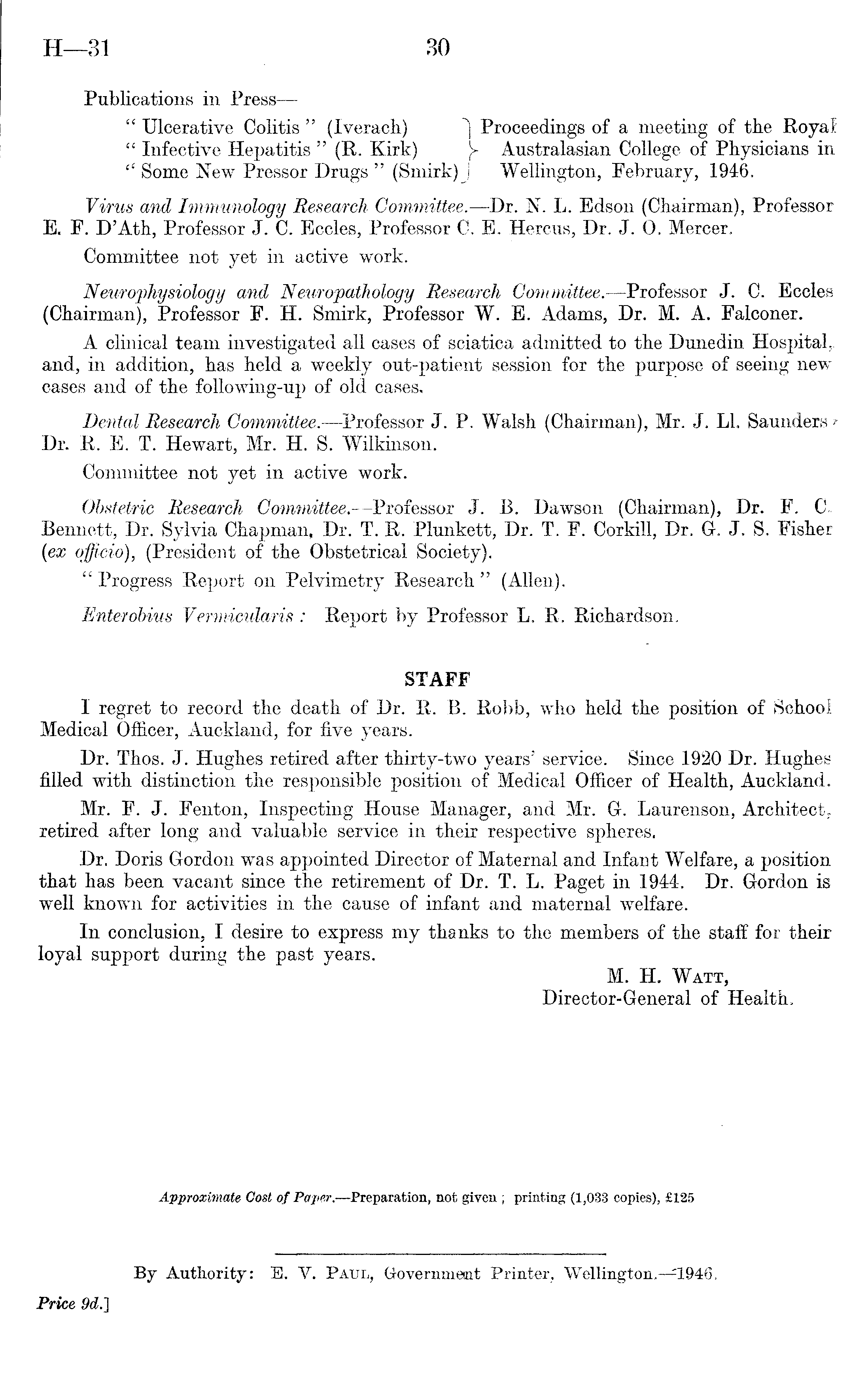 Publications in Press—- " Ulcerative Colitis " (Iverach) Proceedings of a meeting of the Royal " Infective Hepatitis " (R. Kirk) J> Australasian College of Physicians in " Some New Pressor Drugs " (Smirk) J Wellington, February, 1946. Virus and Immunology Research Committee. —Dr. N. L. Edson (Chairman), Professor E. F. D'Ath, Professor J. C. Eccles, Professor C. E. Hercus, Dr. J. 0. Mercer. Committee not yet in active work. Neurophysiology and Neuropathology Research Committee. —Professor J. C. Eccles (Chairman), Professor F. H. Smirk, Professor W. E. Adams, Dr. M. A. Falconer. A clinical team investigated all cases of sciatica admitted to the Dunedin Hospital, and, in addition, has held a weekly out-patient session for the purpose of seeing new cases and of the following-up of old cases. Dental Research Committee—Professor J. P. Walsh (Chairman), Mr. J. LI. Saunders* Dr. R. E. T. Hewart, Mr. H. S. Wilkinson. Committee not yet in active work. Obstetric Research Committee. —Professor J. B. Dawson (Chairman), Dr. F. CBennett, Dr. Sylvia Chapman, Dr. T. R. Plunkett, Dr. T. F. Corkill, Dr. G. J. S. Fisher {ex officio), (President of the Obstetrical Society). " Progress Report on Pelvimetry Research " (Allen). Enterobius Vermicularis: Report by Professor L. R. Richardson. STAFF I regret to record the death of Dr. R. B. Robb, who held the position of School Medical Officer, Auckland, for five years. Dr. Thos. J. Hughes retired after thirty-two years' service. Since 1920 Dr. Hughes filled with distinction the responsible position of Medical Officer of Health, Auckland. Mr. F. J. Fenton, Inspecting House Manager, and Mr. G. Laurenson, Architect, retired after long and valuable service in their respective spheres. Dr. Doris Gordon was appointed Director of Maternal and Infant Welfare, a position that has been vacant since the retirement of Dr. T. L. Paget in 1944. Dr. Gordon is well known for activities in the cause of infant and maternal welfare. In conclusion, I desire to express my thanks to the members of the staff for their loyal support during the past years. M. H. Watt, Director-General of Health.