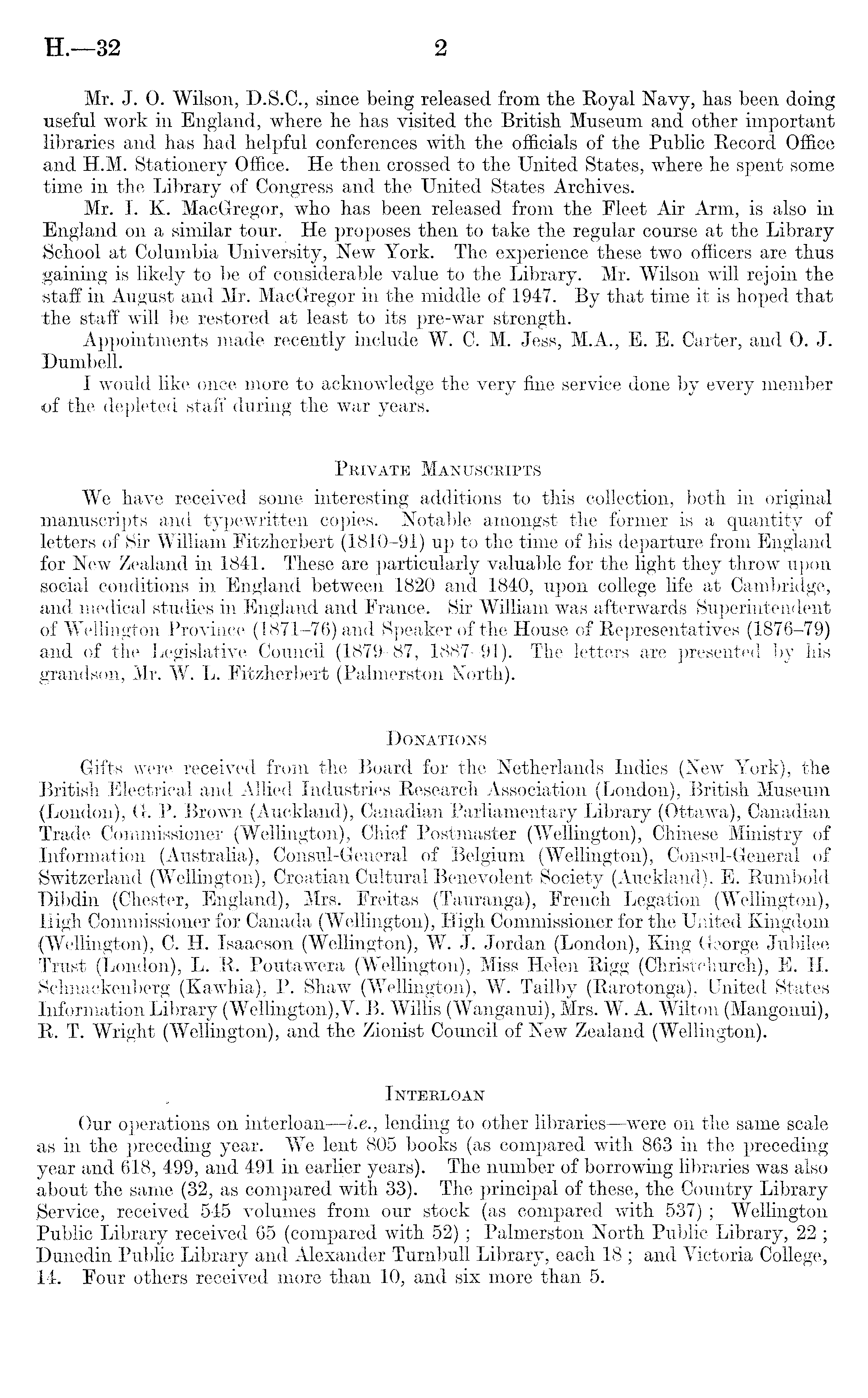 Mr. J. 0. Wilson, D.S.C., since being released from the Royal Navy, lias been doing ■useful work in England, where he has visited the British Museum and other important libraries and has had helpful conferences with the officials of the Public Record Office and H.M. Stationery Office. He then crossed to the United States, where he spent some time in the Library of Congress and the United States Archives. Mr. I. K. MacGregor, who has been released from the Fleet Air Arm, is also in England on a similar tour. He proposes then to take the regular course at the Library School at Columbia University, New York. The experience these two officers are thus gaining is likely to be of considerable value to the Library. Mr. Wilson will rejoin the staff in August and Mr. MacGregor in the middle of 1947. By that time it is hoped that the staff will be restored at least to its pre-war strength. Appointments made recently include W. C. M. Jess, M.A., E. E. Carter, and 0. J. Dumbell. I would like once more to acknowledge the very fine service done by every member of the depleted staff during the war years. Private Manuscripts We have received some interesting additions to this collection, both in original manuscripts and typewritten copies. Notable amongst the former is a quantity of letters of Sir William Fitzherbert (1810-91) up to the time of his departure from England for New Zealand in 1841. These are particularly valuable for the light they throw upon social conditions in England between 1820 and 1840, upon college life at Cambridge, and medical studies in England and France. Sir William was afterwards Superintendent of Wellington Province (1871-76) and Speaker of the House of Representatives (1876-79) and of the Legislative Council (1879-87, 1887-91). The letters are presented by his grandson, Mr. W. L. Fitzherbert (Palmerston North). Donations Gifts were received from the Board for the Netherlands Indies (New York), the British Electrical and Allied Industries Research Association (London), British Museum (London), G. P. Brown (Auckland), Canadian Parliamentary Library (Ottawa), Canadian Trade Commissioner (Wellington), Chief Postmaster (Wellington), Chinese Ministry of Information (Australia), Consul-General of Belgium (Wellington), Consul-General of Switzerland (Wellington), Croatian Cultural Benevolent Society (Auckland), E. Rumbold Dibdin (Chester, England), Mrs. Freitas (Tauranga), French Legation (Wellington), High Commissioner for Canada (Wellington), High Commissioner for the United Kingdom (Wellington), C. H. Isaacson (Wellington), W. J. Jordan (London), King George Jubilee Trust (London), L. R. Poutawera (Wellington), Miss Helen Rigg (Christchurch), E. H. Schnackenberg (Kawhia), P. Shaw (Wellington), W. Tailby (Rarotonga), United States Information Library (Wellington),V. B. Willis (Wanganui), Mrs. W. A. Wilton (Mangonui), R. T. Wright (Wellington), and the Zionist Council of New Zealand (Wellington). Interloan Our operations on interloan —i.e., lending to other libraries—were on the same scale as in the preceding year. We lent 805 books (as compared with 863 in the preceding year and 618, 499, and 491 in earlier years). The number of borrowing libraries was also about the same (32, as compared with 33). The principal of these, the Country Library Service, received 545 volumes from our stock (as compared with 537) ; Wellington Public Library received 65 (compared with 52); Palmerston North Public Library, 22 ; Dunedin Public Library and Alexander Turnbull Library, each 18 ; and Victoria College, 14. Four others received more than 10, and six more than 5.