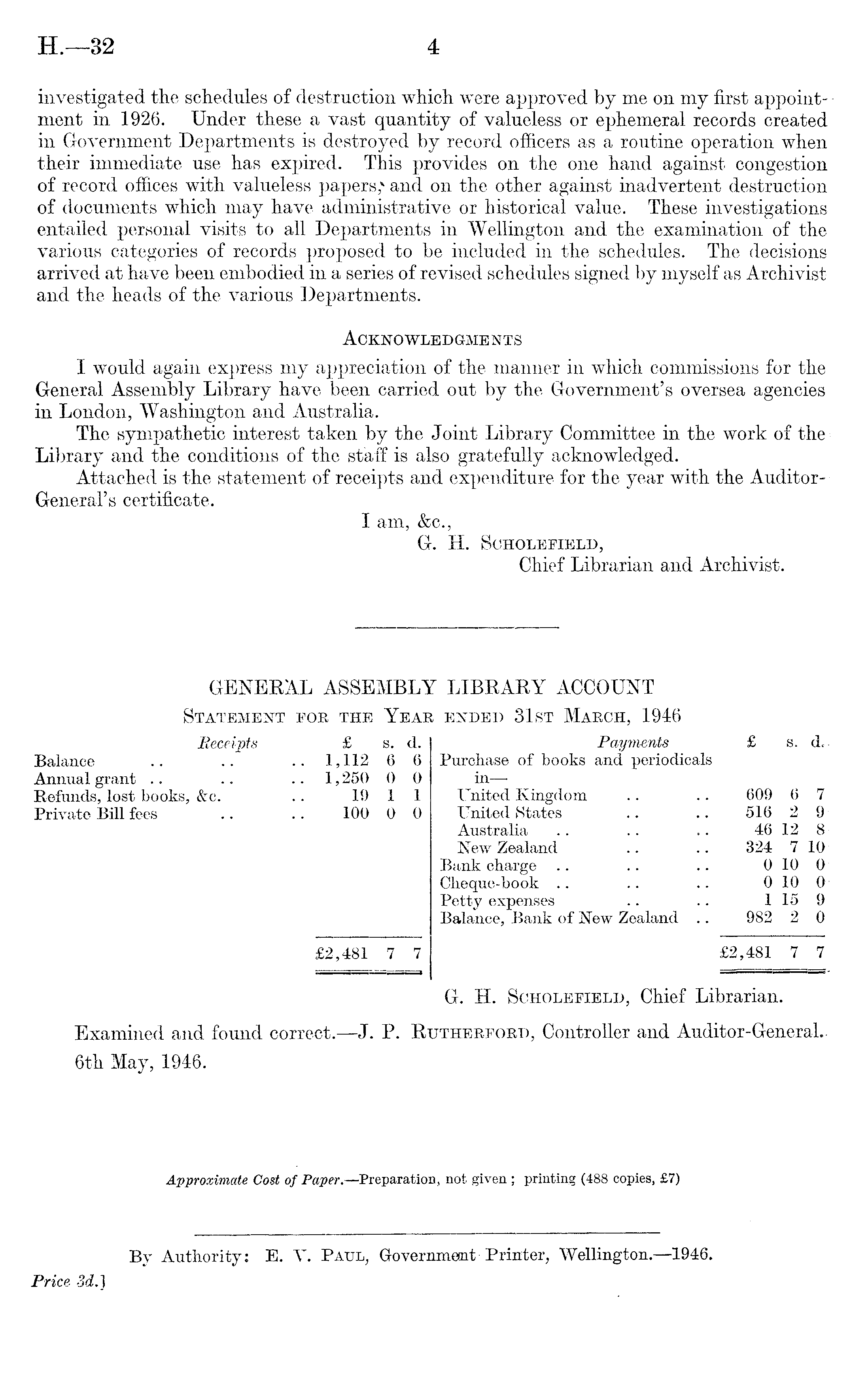 investigated the schedules of destruction which were approved by me on my first appointment in 1926. Under these a vast quantity of valueless or ephemeral records created in Government Departments is destroyed by record officers as a routine operation when their immediate use has expired. This provides on the one hand against congestion of record offices with valueless papers," and on the other against inadvertent destruction of documents which may have administrative or historical value. These investigations entailed personal visits to all Departments in Wellington and the examination of the various categories of records proposed to be included in the schedules. The decisions arrived at have been embodied in a series of revised schedules signed by myself as Archivist and the heads of the various Departments. Acknowledgments I would again express my appreciation of the manner in which commissions for the General Assembly Library have been carried out by the Government's oversea agencies in London, Washington and Australia. The sympathetic interest taken by the Joint Library Committee in the work of the Library and the conditions of the staff is also gratefully acknowledged. Attached is the statement of receipts and expenditure for the year with the AuditorGeneral's certificate. I am, &c., G. H. SCHOLEFIELD, Chief Librarian and Archivist.