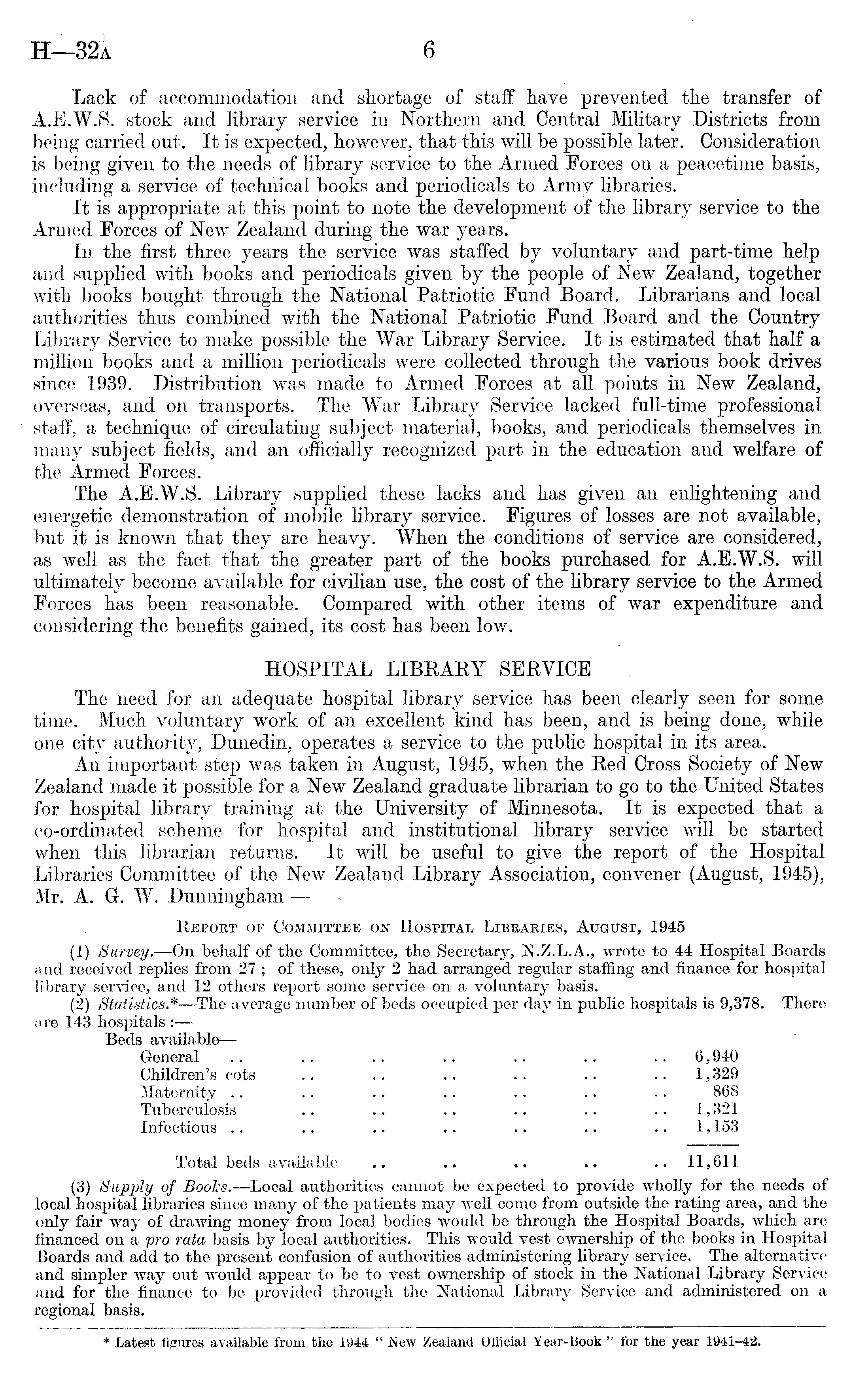 Lack of accommodation and shortage of staff have prevented the transfer of A.E.W.S. stock and library service in Northern and Central Military Districts from being carried out. It is expected, however, that this will be possible later. Consideration is being given to the needs of library service to the Armed Forces on a peacetime basis, including a service of technical books and periodicals to Army libraries. It is appropriate at this point to note the development of the library service to the Armed Forces of New Zealand during the war years. In the first three years the service was staffed by voluntary and part-time help and supplied with books and periodicals given by the people of New Zealand, together with books bought through the National Patriotic Fund Board. Librarians and local authorities thus combined with the National Patriotic Fund Board and the Country Library Service to make possible the War Library Service. It is estimated that half a million books and a million periodicals were collected through the various book drives since 1939. Distribution was made to Armed Forces at all points in New Zealand, overseas, and on transports. The War Library Service lacked full-time professional staff, a technique of circulating subject material, books, and periodicals themselves in many subject fields, and an officially recognized part in the education and welfare of the Armed Forces. The A.E.W.S. Library supplied these lacks and has given an enlightening and energetic demonstration of mobile library service. Figures of losses are not available, but it is known that they are heavy. When the conditions of service are considered, as well as the fact that the greater part of the books purchased for A.E.W.S. will ultimately become available for civilian use, the cost of the library service to the Armed Forces has been reasonable. Compared with other items of war expenditure and considering the benefits gained, its cost has been low. HOSPITAL LIBRARY SERVICE The need for an adequate hospital library service has been clearly seen for some time. Much voluntary work of an excellent kind has been, and is being done, while one city authority, Dunedin, operates a service to the public hospital in its area. An important step was taken in August, 1945, when the Red Cross Society of New Zealand made it possible for a New Zealand graduate librarian to go to the United States for hospital library training at the University of Minnesota. It is expected that a co-ordinated scheme for hospital and institutional library service will be started when this librarian returns. It will be useful to give the report of the Hospital Libraries Committee of the New Zealand Library Association, convener (August, 1945), Mr. A. Gr. W. Dunningham Report of Committee on Hospital Libraries, August, 1945 (1) Survey.—On behalf of the Committee, the Secretary, N.Z.L.A., wrote to 44 Hospital Boards and received replies from 27 ; of these, only 2 had arranged regular staffing and finance for hospital library service, and 12 others report some service on a voluntary basis. (2) Statistics.* —The average number of beds occupied per day in public hospitals is 9,378. There are 143 hospitals : Beds available — General .. .. .. .. .. .. .. 6,940 Children's cots .. .. .. .. .. .. 1,329 Maternity .. .. .. .. .. .. .. 868 Tuberculosis .. .. .. .. .. .. 1,321 Infectious .. .. .. .. .. .. .. 1,153 Total beds available .. .. .. .. ..11,611 (3) Supply of Books. —Local authorities cannot be expected to provide wholly for the needs of local hospital libraries since many of the patients may well come from outside the rating area, and the only fair way of drawing money from local bodies would be through the Hospital Boards, which are financed on a pro rata basis by local authorities. This would vest ownership of the books in Hospital Boards and add to the present confusion of authorities administering library service. The alternative and simpler way out would appear to be to vest ownership of stock in the National Library Service and for the finance to be provided through the National Library Service and administered on a regional basis.