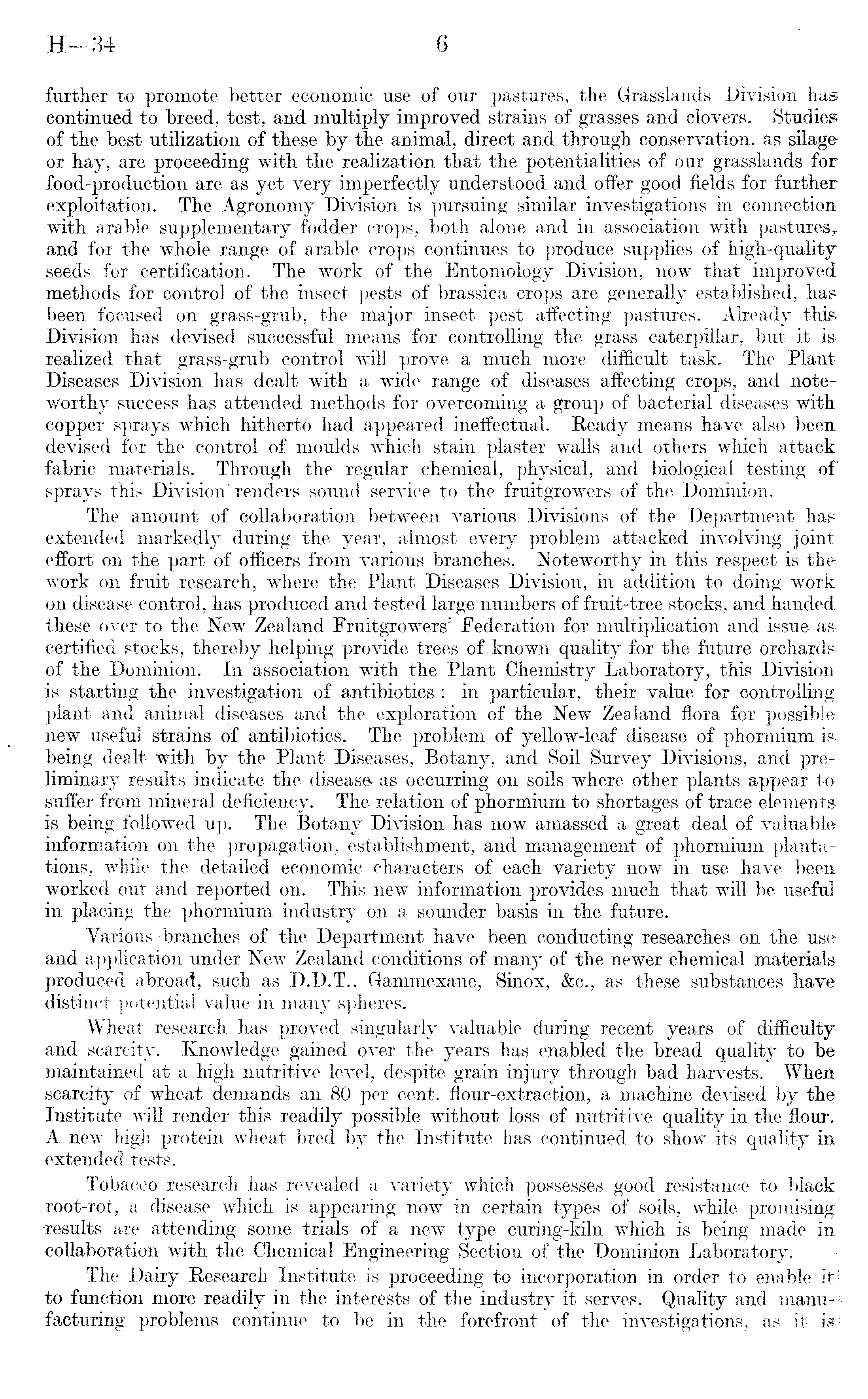 further to promote better economic use of our pastures, the Grasslands Division has continued to breed, test, and multiply improved strains of grasses and clovers. Studies of the best utilization of these by the animal, direct and through conservation, as silage or hay, are proceeding with the realization that the potentialities of our grasslands for food-production are as yet very imperfectly understood and offer good fields for further exploitation. The Agronomy Division is pursuing similar investigations in connection with arable supplementary fodder crops, both alone and in association with pastures, and for the whole range of arable crops continues to produce supplies of high-quality seeds for certification. The work of the Entomology Division, now that improved methods for control of the insect pests of brassica crops are generally established, has been focused on grass-grub, the major insect pest affecting pastures. Already this Division has devised successful means for controlling the grass caterpillar, but it is realized that grass-grub control will prove a much more difficult task. The Plant Diseases Division has dealt with a wide range of diseases affecting crops, and noteworthy success has attended methods for overcoming a group of bacterial diseases with copper sprays which hitherto had appeared ineffectual. Ready means have also been devised for the control of moulds which stain plaster walls and others which attack fabric materials. Through the regular chemical, physical, and biological testing of sprays this Division" renders sound service to the fruitgrowers of the Dominion. The amount of collaboration between various Divisions of the Department has extended markedly during the year, almost every problem attacked involving joint effort on the part of officers from various branches. Noteworthy in this respect is the work on fruit research, where the Plant Diseases Division, in addition to doing work on disease control, has produced and tested large numbers of fruit-tree stocks, and handed these over to the New Zealand Fruitgrowers' Federation for multiplication and issue as certified stocks, thereby helping provide trees of known quality for the future orchards of the Dominion. In association with the Plant Chemistry Laboratory, this Division is starting the investigation of antibiotics ; in particular, their value for controlling plant and animal diseases and the exploration of the New Zealand flora for possible new useful strains of antibiotics. The problem of yellow-leaf disease of phormium is being dealt with by the Plant Diseases, Botany, and Soil Survey Divisions, and preliminary results indicate the disease* as occurring on soils where other plants appear to suffer from mineral deficiency. The relation of phormium to shortages of trace elements is being followed up. The Botany Division has now amassed a great deal of valuable information on the propagation, establishment, and management of phormium plantations, while the detailed economic characters of each variety now in use have been worked out and reported on. This new information provides much that will be useful in placing" the phormium industry on a sounder basis in the future. Various branches of the Department have been conducting researches on the use and application under New Zealand conditions of many of the newer chemical materials produced abroad, such as D.D.T., Gammexane, Sinox, &c, as these substances have distinct potential value in many spheres. Wheat research has proved singularly valuable during recent years of difficulty and scarcity. Knowledge gained over the years has enabled the bread quality to be maintained at a high nutritive level, despite grain injury through bad harvests. When scarcity of wheat demands an 80 per cent. Hour-extraction, a machine devised by the Institute will render this readily possible without loss of nutritive quality in the flour. A new high protein Avheat bred by the Institute has continued to show its quality in extended tests. Tobacco research has revealed a variety which possesses good resistance to black root-rot, a disease which is appearing now in certain types of soils, while promising' ■results are attending some trials of a new type curing-kiln which is being made in collaboration with the Chemical Engineering Section of the Dominion Laboratory. The Dairy Research Institute is proceeding to incorporation in order to enable it'to function more readily in the interests of the industry it serves. Quality and manu- 1 facturing problems continue to be in the forefront of the investigations, as it is ;