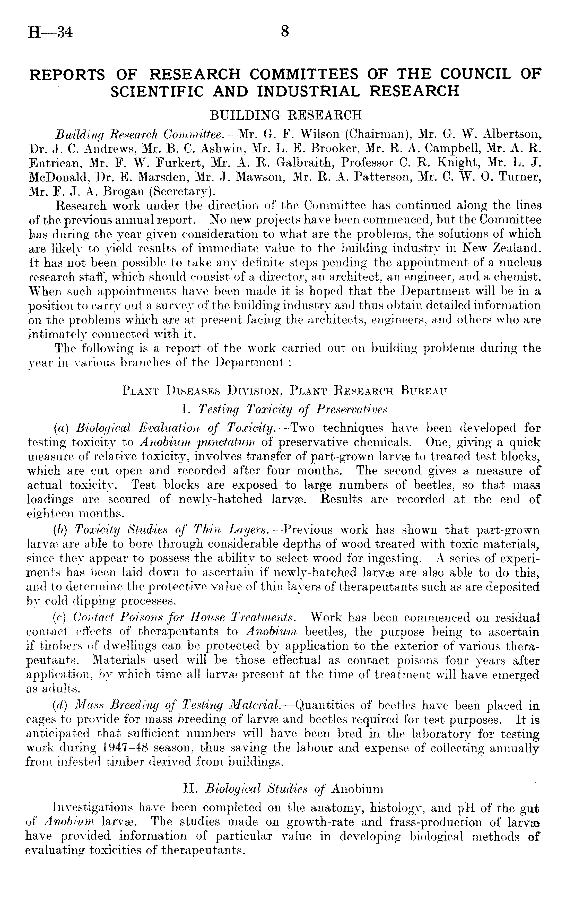 REPORTS OF RESEARCH COMMITTEES OF THE COUNCIL OF SCIENTIFIC AND INDUSTRIAL RESEARCH BUILDING RESEARCH Building Research Committee. —Mr. G. F. Wilson (Chairman), Mr. G. W. Albertson, Dr. J. C. Andrews, Mr. B. C. Ashwin, Mr. L. E. Brooker, Mr. R. A. Campbell, Mr. A. R. Entrican, Mr. F. W. Furkert, Mr. A. R. Galbraith, Professor C. R. Knight, Mr. L. J. McDonald, Dr. E. Marsden, Mr. J. Mawson, Mr. R. A. Patterson, Mr. C. W. 0. Turner, Mr. F. J. A. Brogan (Secretary). Research work under the direction of the Committee has continued along the lines of the previous annual report. No new projects have been commenced, but the Committee has during the year given consideration to what are the problems, the solutions of which are likely to yield results of immediate value to the building industry in New Zealand. It has not been possible to take any definite steps pending the appointment of a nucleus research staff, which should consist of a director, an architect, an engineer, and a chemist. When such appointments have been made it is hoped that the Department will be in a position to carry out a survey of the building industry and thus obtain detailed information on the problems which are at present facing the architects, engineers, and others who are intimately connected with it. The following is a report of the work carried out on building problems during the year in various branches of the Department : Plant Diseases Division, Plant Research Bureau I. Testing Toxicity of Preservatives (a) Biological Evaluation of Toxicity. —Two techniques have been developed for testing toxicity to Anobium punctatum of preservative chemicals. One, giving a quick measure of relative toxicity, involves transfer of part-grown larvae to treated test blocks, which are cut open and recorded after four months. The second gives a measure of actual toxicity. Test blocks are exposed to large numbers of beetles, so that mass loadings are secured of newly-hatched larvae. Results are recorded at the end of eighteen months. (b) Toxicity Studies of Thin Layers. —Previous work has shown that part-grown larvae are able to bore through considerable depths of wood treated with toxic materials, since they appear to possess the ability to select wood for ingesting. A series of experiments has been laid down to ascertain if newly-hatched larvae are also able to do this, and to determine the protective value of thin layers of therapeutants such as are deposited by cold dipping processes. (c) Contact Poisons for House Treatments. —Work has been commenced on residual contact" effects of therapeutants to Anobium beetles, the purpose being to ascertain if timbers of dwellings can be protected by application to the exterior of various therapeutants. Materials used will be those effectual as contact poisons four years after application, by which time all larvae present at the time of treatment will have emerged as adults. (d) Mass Breeding of Testing Material. —Quantities of beetles have been placed in cages to provide for mass breeding of larvae and beetles required for test purposes. It is anticipated that sufficient numbers will have been bred in the laboratory for testing work during 1947-48 season, thus saving the labour and expense of collecting annually from infested timber derived from buildings. 11. Biological Studies of Anobium Investigations have been completed on the anatomy, histology, and pH of the gut of Anobium larvae. The studies made on growth-rate and frass-production of larvse have provided information of particular value in developing biological methods of evaluating toxicities of therapeutants.