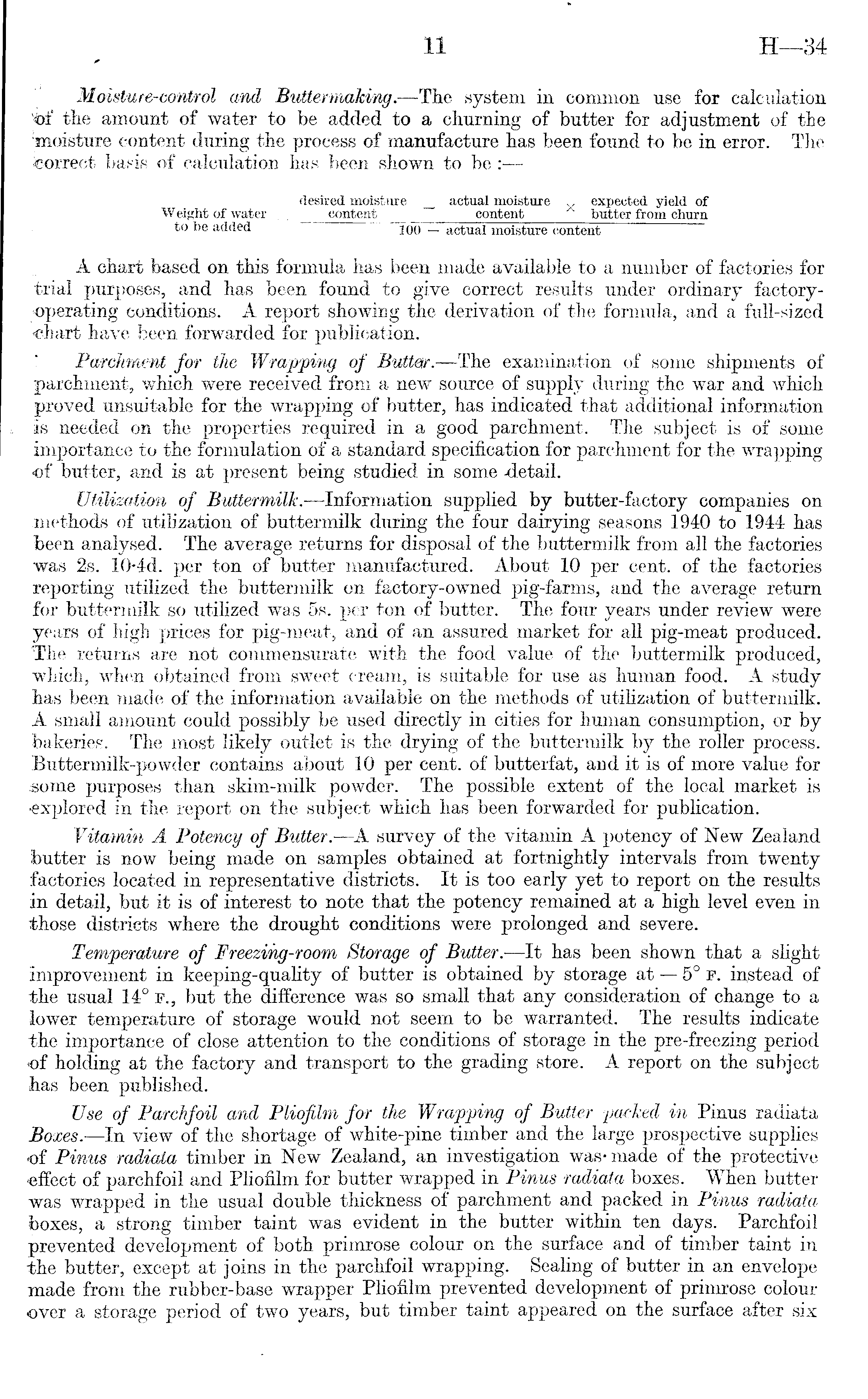 Moisture-control and Butter making. —The system in common use for calculation of the amount of water to be added to a churning of butter for adjustment of the •moisture content during the process of manufacture has been found to be in error. The correct basis of calculation has been shown to be : desired moisture _ actual moisture x expected yield of Weight of water . content content butter from churn to be added - 10 0 - actual moisture content A chart based on this formula has been made available to a number of factories for trial purposes, and has been found to give correct results under ordinary factoryoperating conditions. A report showing the derivation of the formula, and a full-sized •chart have been forwarded for publication. Parchment for the Wrapping of Butteff. —The examination of some shipments of parchment, which were received from a new source of supply during the war and which proved unsuitable for the wrapping of butter, has indicated that additional information is needed on the properties required in a good parchment. The subject is of some importance to the formulation of a standard specification for parchment for the wrapping of butter, and is at present being studied in some detail. Utilization of Buttermilk. —Information supplied by butter-factory companies on methods of utilization of buttermilk during the four dairying seasons 1940 to 1944 has been analysed. The average returns for disposal of the buttermilk from all the factories was 2s. 10-4 d. per ton of butter manufactured. About 10 per cent, of the factories reporting utilized the buttermilk on factory-owned pig-farms, and the average return for buttermilk so utilized was ss. per ton of butter. The four years under review were years of high prices for pig-meat, and of an assured market for all pig-meat produced. The returns are not commensurate with the food value of the buttermilk produced, which, when obtained from sweet cream, is suitable for use as human food. A study has been made of the information available on the methods of utilization of buttermilk. A small amount could possibly be used directly in cities for human consumption, or by bakeries. The most likely outlet is the drying of the buttermilk by the roller process. Bxittermilk-powder contains about 10 per cent, of butterfat, and it is of more value for some purposes than skim-milk powder. The possible extent of the local market is ■explored in the report on the subject which has been forwarded for publication. Vitamin A Potency of Butter. —A survey of the vitamin A potency of New Zealand butter is now being made on samples obtained at fortnightly intervals from twenty factories located in representative districts. It is too early yet to report on the results in detail, but it is of interest to note that the potency remained at a high level even in those districts where the drought conditions were prolonged and severe. Temperature of Freezing-room Storage of Butter.- —lt has been shown that a slight improvement in keeping-quality of butter is obtained by storage at 5° F. instead of the usual 14° f., but the difference was so small that any consideration of change to a lower temperature of storage would not seem to be warranted. The results indicate the importance of close attention to the conditions of storage in the pre-freezing period of holding at the factory and transport to the grading store. A report on the subject has been published. Use of Parchfoil and Pliofilm for the Wrapping of Butter 'packed in Pinus radiata Boxes.' —In view of the shortage of white-pine timber and the large prospective supplies of Pinus radiata timber in New Zealand, an investigation was- made of the protective effect of parchfoil and Pliofilm for butter wrapped in Pinus radiata boxes. When butter was wrapped in the usual double thickness of parchment and packed in Pinus radiata boxes, a strong timber taint was evident in the butter within ten days. Parchfoil prevented development of both primrose colour on the surface and of timber taint in the butter, except at joins in the parchfoil wrapping. Sealing of butter in an envelope made from the rubber-base wrapper Pliofilm prevented development of primrose colour over a storage period of two years, but timber taint appeared on the surface after six