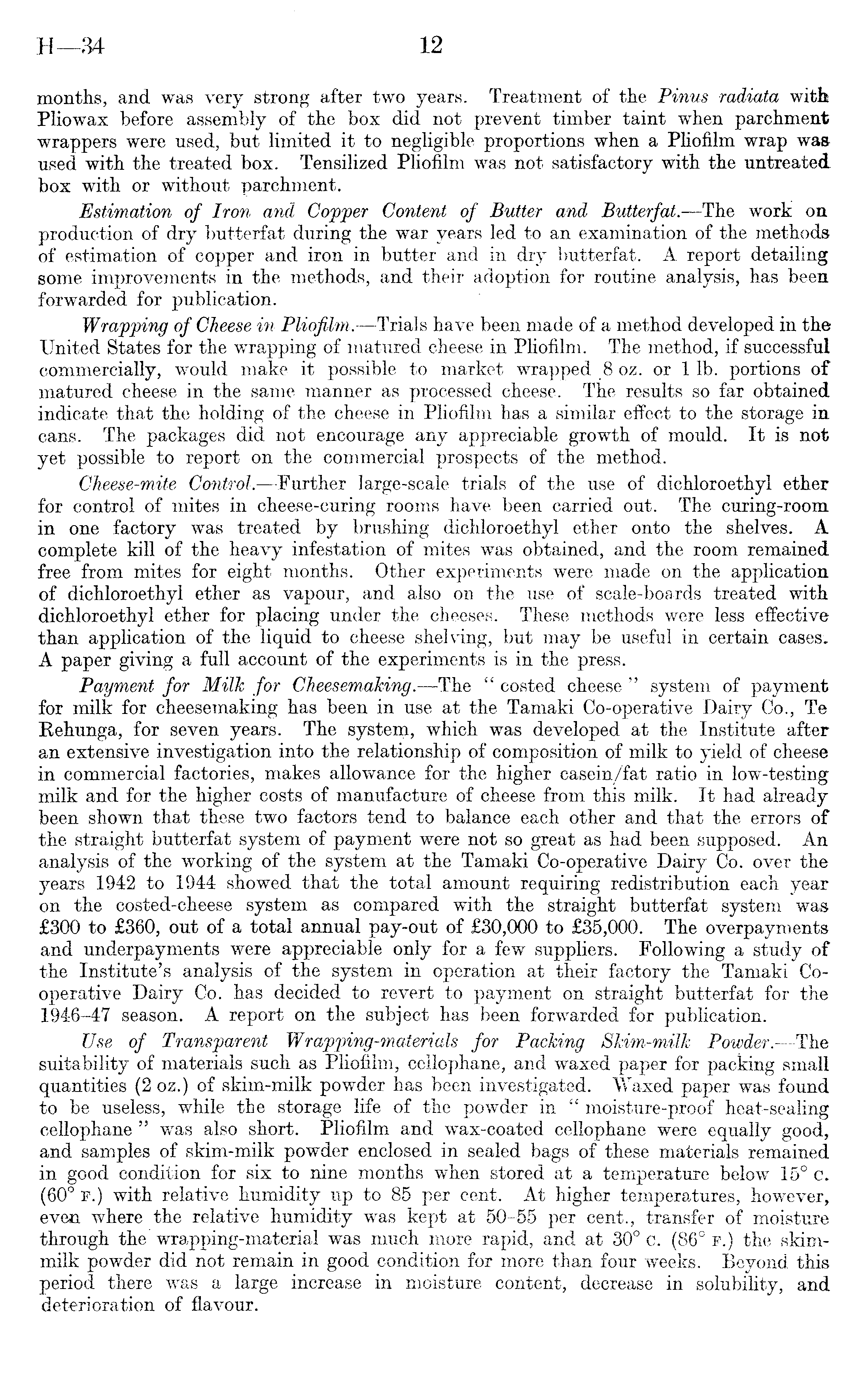 months, and was very strong after two years. Treatment of the Pinus radiata with Pliowax before assembly of the box did not prevent timber taint when parchment wrappers were used, but limited it to negligible proportions when a Pliofilm wrap was used with the treated box. Tensilized Pliofilm was not satisfactory with the untreated box with or without parchment. Estimation of Iron and Copper Content of Butter and Butterfat. —The work on production of dry butterfat during the war years led to an examination of the methods of estimation of copper and iron in butter and in dry butterfat. A report detailing some improvements in the methods, and their adoption for routine analysis, has been forwarded for publication. Wrapping of Cheese in Pliofilm. —Trials have been made of a method developed in the United States for the wrapping of matured cheese in Pliofilm. The method, if successful commercially, would make it possible to market wrapped 8 oz. or 1 lb. portions of matured cheese in the same manner as processed cheese. The results so far obtained indicate that the holding of the cheese in Pliofilm has a similar effect to the storage in cans. The packages did not encourage any appreciable growth of mould. It is not yet possible to report on the commercial prospects of the method. Cheese-mite Control. —Further large-scale trials of the use of dichloroethyl ether for control of mites in cheese-curing rooms been carried out. The curing-room in one factory was treated by brushing dichloroethyl ether onto the shelves. A complete kill of the heavy infestation of mites was obtained, and the room remained free from mites for eight months. Other experiments were made on the application of dichloroethyl ether as vapour, and also on the use of scale-boards treated with dichloroethyl ether for placing under the cheeses. These methods were less effective than application of the liquid to cheese shelving, but may be useful in certain cases. A paper giving a full account of the experiments is in the press. Payment for Milk for Cheesemaking . —The " costed cheese " system of payment for milk for cheesemaking has been in use at the Tamaki Co-operative Dairy Co., Te Eehunga, for seven years. The system, which was developed at the Institute after an extensive investigation into the relationship of composition of milk to yield of cheese in commercial factories, makes allowance for the higher casein/fat ratio in low-testing milk and for the higher costs of manufacture of cheese from this milk. It had already been shown that these two factors tend to balance each other and that the errors of the straight butterfat system of payment were not so great as had been supposed. An analysis of the working of the system at the Tamaki Co-operative Dairy Co. over the years 1942 to 1944 showed that the total amount requiring redistribution each year on the costed-cheese system as compared with the straight butterfat system was £3OO to £360, out of a total annual pay-out of £30,000 to £35,000. The overpayments and underpayments were appreciable only for a few suppliers. Following a study of the Institute's analysis of the system in operation at their factory the Tamaki Cooperative Dairy Co. has decided to revert to payment on straight butterfat for the 1946-47 season. A report on the subject has been forwarded for publication. Use of Transparent Wrapping-materials for Packing Skim-milk Powder. —The suitability of materials such as Pliofilm, cellophane, and waxed paper for packing small quantities (20z.) of skim-milk powder has been investigated. Waxed paper was found to be useless, while the storage life of the powder in " moisture-proof heat-sealing cellophane " was also short. Pliofilm and wax-coated cellophane were equally good, and samples of skim-milk powder enclosed in sealed bags of these materials remained in good condition for six to nine months when stored at a temperature below 15° c. (60° F.) with relative humidity up to 85 per cent. At higher temperatures, however, even where the relative humidity was kept at 50-55 per cent., transfer of moisture through the wrapping-material was much more rapid, and at 30° c. (86° F.) the skimmilk powder did not remain in good condition for more than four weeks. Beyond this period there was a large increase in moisture content, decrease in solubility, and deterioration of flavour.