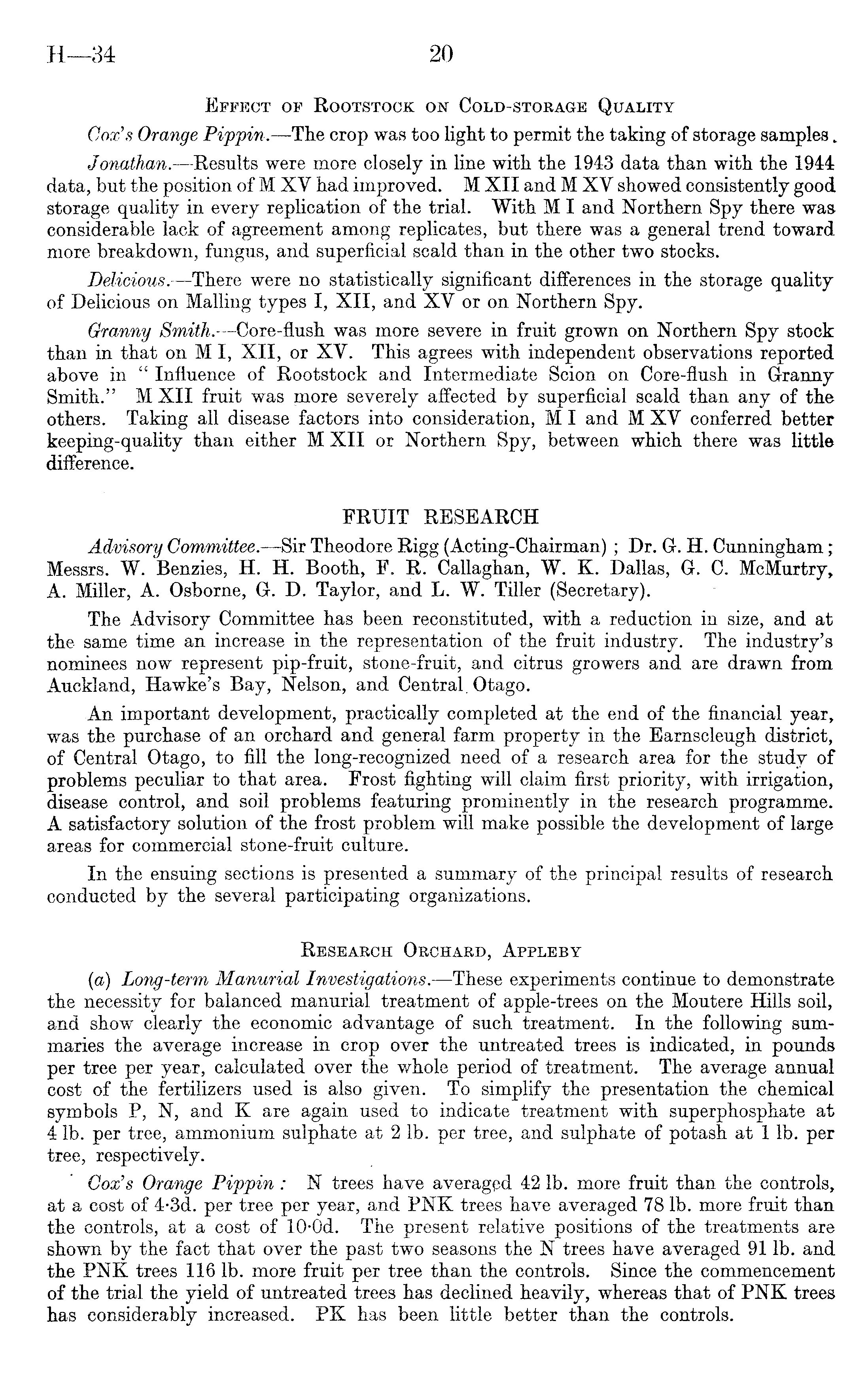 Effect of Rootstock on Cold-storage Quality Cox's Orange Pippin. —The crop was too light to permit the taking of storage samples. Jonathan. —Results were more closely in line with the 1943 data than with the 1944 data, but the position of MXV had improved. M XII and MXV showed consistently good storage quality in every replication of the trial. With M I and Northern Spy there was considerable lack of agreement among replicates, but there was a general trend toward more breakdown, fungus, and superficial scald than in the other two stocks. Delicious. —There were no statistically significant differences in the storage quality of Delicious on Mailing types I, XII, and XV or on Northern Spy. Granny Smith. —Core-flush was more severe in fruit grown on Northern Spy stock than in that on MI, XII, or XV. This agrees with independent observations reported above in " Influence of Rootstock and Intermediate Scion on Core-flush in Granny Smith." M XII fruit was more severely affected by superficial scald than any of the others. Taking all disease factors into consideration, M I and MXV conferred better keeping-quality than either M XII or Northern Spy, between which there was little difference. FRUIT RESEARCH Advisory Committee. —Sir Theodore Rigg (Acting-Chairman) ; Dr. G. H. Cunningham; Messrs. W. Benzies, H. H. Booth, F. R. Callaghan, W. K. Dallas, G. C. McMurtry, A. Miller, A. Osborne, G. D. Taylor, and L. W. Tiller (Secretary). The Advisory Committee has been reconstituted, with a reduction in size, and at the same time an increase in the representation of the fruit industry. The industry's nominees now represent pip-fruit, stone-fruit, and citrus growers and are drawn from Auckland, Hawke's Bay, Nelson, and Central. Otago. An important development, practically completed at the end of the financial year, was the purchase of an orchard and general farm property in the Earnscleugh district, of Central Otago, to fill the long-recognized need of a research area for the study of problems peculiar to that area. Frost fighting will claim first priority, with irrigation, disease control, and soil problems featuring prominently in the research programme. A satisfactory solution of the frost problem will make possible the development of large areas for commercial stone-fruit culture. In the ensuing sections is presented a summary of the principal results of research conducted by the several participating organizations. Research Orchard, Appleby (a) Long-term Manurial Investigations. —These experiments continue to demonstrate the necessity for balanced manurial treatment of apple-trees on the Moutere Hills soil, and show clearly the economic advantage of such treatment. In the following summaries the average increase in crop over the untreated trees is indicated, in pounds per tree per year, calculated over the whole period of treatment. The average annual cost of the fertilizers used is also given. To simplify the presentation the chemical symbols P, N, and K are again used to indicate treatment with superphosphate at 4 lb. per tree, ammonium sulphate at 2 lb. per tree, and sulphate of potash at 1 lb. per tree, respectively. Cox's Orange Pippin : N trees have averaged 42 lb. more fruit than the controls, at a cost of 4-3 d. per tree per year, and PNK trees have averaged 78 lb. more fruit than the controls, at a cost of 10-od. The present relative positions of the treatments are shown by the fact that over the past two seasons the N trees have averaged 91 lb. and the PNK trees 116 lb. more fruit per tree than the controls. Since the commencement of the trial the yield of untreated trees has declined heavily, whereas that of PNK trees has considerably increased. PK has been little better than the controls.