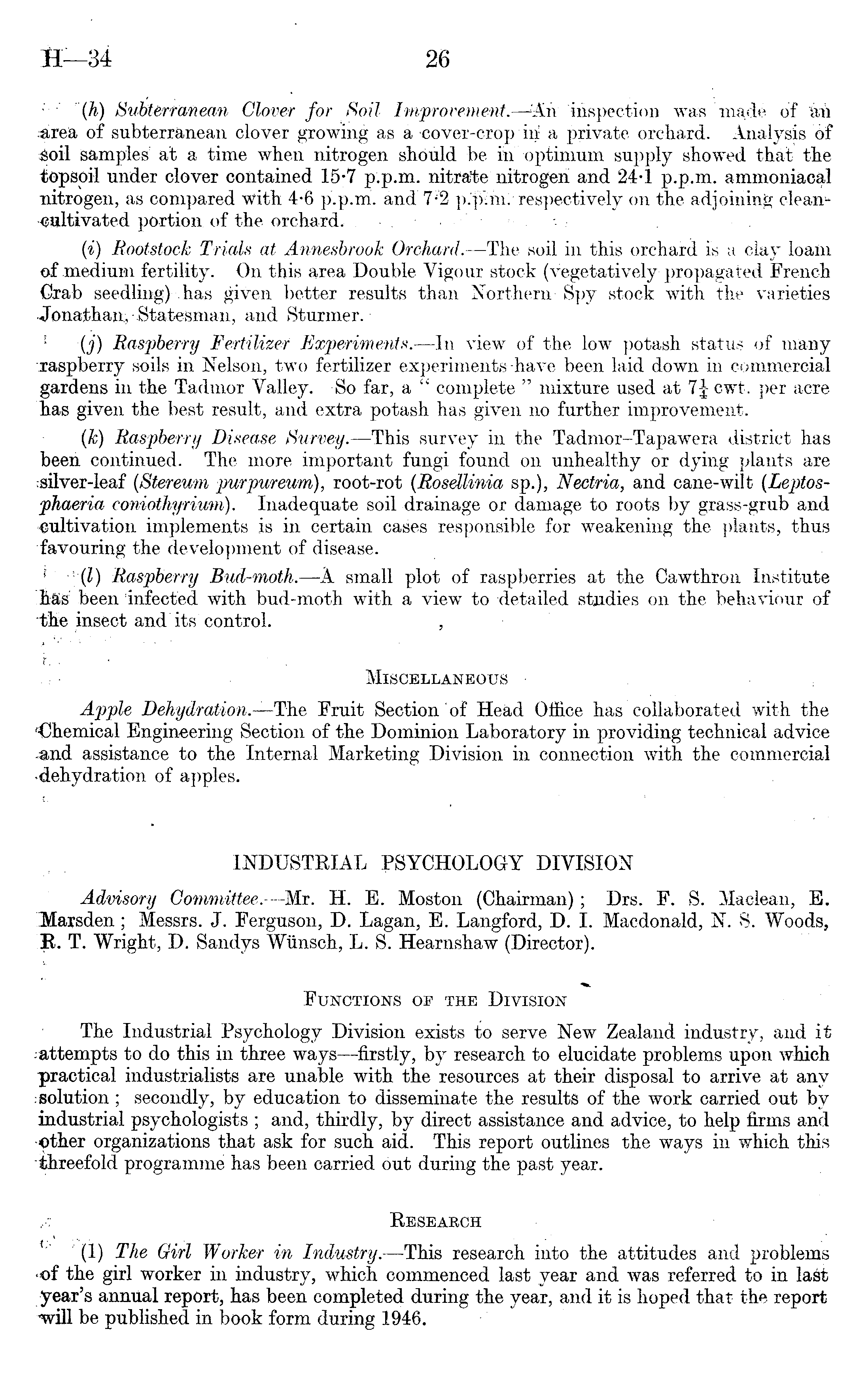 (h) Subterranean Clover for Soil Improvement. —An inspection was made of ail :area of subterranean clover growing as a cover-crop in a private orchard. Analysis of Soil samples at a time when nitrogen should be in optimum supply showed that the topsoil under clover contained 15-7 p.p.m. nitrate nitrogen and 24-1 p.p.m. ammoniacal nitrogen, as compared with 4-6 p.p.m. and 7-2 p.'pmi. respectively on the adjoining clean* -cultivated portion of the orchard. • (i) Rootstock Trials at Annesbrook Orchard. —The soil in this orchard is a clay loam of medium fertility. On this area Double Vigour stock (vegetatively propagated French Cxab seedling) has given better results than Northern Spy stock with the varieties Jonathan, Statesman, and Stunner. ■ (j) Raspberry Fertilizer Experiments. —ln view of the low potash status of many raspberry soils in Nelson, two fertilizer experiments have been laid down in commercial gardens in the Tadmor Valley. So far, a " complete " mixture used at 1\ cwt. per acre has given the best result, and extra potash has given no further improvement. (k) Raspberry Disease Survey. —This survey in the Tadmor-Tapawera district has been continued. The more important fungi found on unhealthy or dying plants are ;silver-leaf (Stereum purpureum), root-rot (Rosellinia sp.), Nectria, and cane-wilt (Leptosphaeria eoniothyrium). Inadequate soil drainage or damage to roots by grass-grub and -cultivation implements is in certain cases responsible for weakening the plants, thus favouring the development of disease. * (I) Raspberry Bud-moth. —A small plot of raspberries at the Cawthron Institute has been infected with bud-moth with a view to detailed studies on the behaviour of the insect audits control. , Miscellaneous Apple Dehydration.—The Fruit Section of Head Office has collaborated with the 'Chemical Engineering Section of the Dominion Laboratory in providing technical advice -and assistance to the Internal Marketing Division in connection with the commercial •dehydration of apples. INDUSTRIAL PSYCHOLOGY DIVISION Advisory Committee. —Mr. H. E. Moston (Chairman) ; Drs. F. S. Maclean, E. Marsden ; Messrs. J. Ferguson, D. Lagan, E. Langford, D. I. Macdonald, N. S. Woods, B. T. Wright, D. Sandys Wiinsch, L. S. Hearnshaw (Director). Functions oe the Division The Industrial Psychology Division exists to serve New Zealand industry, and it to do this in three ways —firstly, by research to elucidate problems upon which practical industrialists are unable with the resources at their disposal to arrive at any solution ; secondly, by education to disseminate the results of the work carried out by industrial psychologists ; and, thirdly, by direct assistance and advice, to help firms and •other organizations that ask for such aid. This report outlines the ways in which this threefold programme has been carried out during the past year. Research (1) The Girl Worker in Industry. —This research into the attitudes and problems ■of the girl worker in industry, which commenced last year and was referred to in last year's annual report, has been completed during the year, and it is hoped that the report -will be published in book form during 1946.