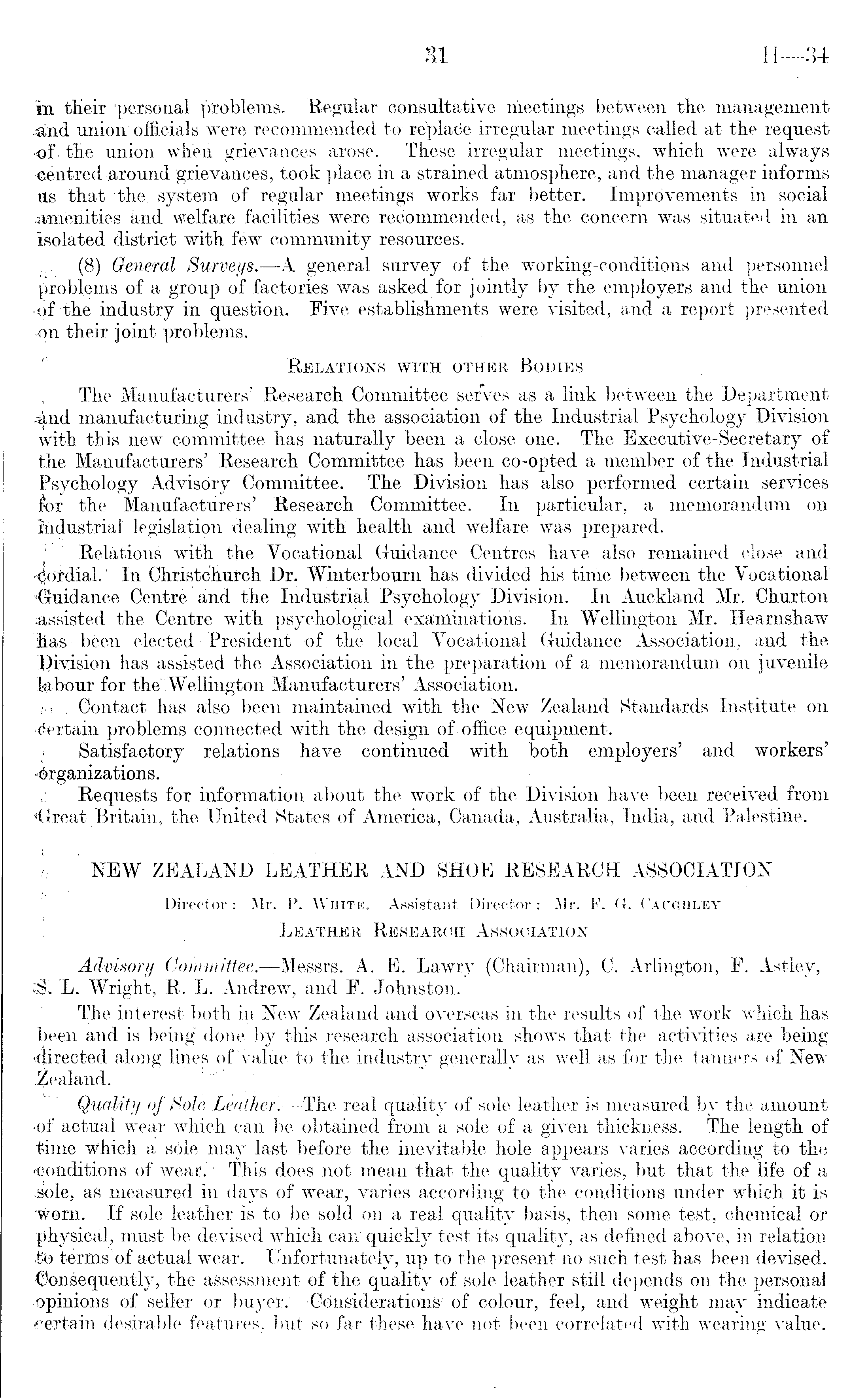 in their personal problems. Regular consultative meetings between the management -and union officials were recommended to replace irregular meetings called at the request of. the union when. grievances arose. These irregular meetings, which were always •centred around grievances, took place in a strained atmosphere, and the manager informs us that the system of regular meetings works far better. Improvements in social amenities and welfare facilities were recommended, as the concern was situated in an isolated district with few community resources. (8) General Surveys. —A general survey of the working-conditions and personnel problems of a group of factories was asked for jointly by the employers and the union of the industry in question. Five establishments were visited, and a report presented •on their joint problems. Relations with other Bodies The Manufacturers' Research Committee serves as a link between the Department 4nd manufacturing industry, and the association of the Industrial Psychology Division with this new committee has naturally been a close one. The Executive-Secretary of the Manufacturers' Research Committee has been co-opted a member of the Industrial Psychology Advisory Committee. The Division has also performed certain services lor the Manufacturers' Research Committee. In particular, a memorandum on industrial legislation dealing with health and welfare was prepared. Relations with the Vocational Guidance Centres have also remained close and •exordial.' In Christchurch Dr. Winterbourn has divided his time between the Vocational -Guidance Centre and the Industrial Psychology Division. In Auckland Mr. Churton assisted the Centre with psychological examinations. In Wellington Mr. Hearnshaw Mas been elected i President of the local Vocational Guidance Association, and the Division has assisted the Association in the preparation of a memorandum on juvenile labour for the Wellington Manufacturers' Association. ei . Contact has also been maintained with the New Zealand Standards Institute on Certain problems connected with the design of office equipment. Satisfactory relations have continued with both employers' and workers' organizations. i Requests for information about the work of the Division have been received from <Great Britain, the United States of America, Canada, Australia, India, and Palestine. ,': NEW ZEALAND LEATHER AND SHOE RESEARCH ASSOCIATION Director : Mr. P. White. Assistant Director : Mr. F. (it. Cattgiiley Leather Research Association Advisory Committee. —Messrs. A. E. Lawry (Chairman), C. Arlington, F. Astiey, :S. L. Wright, R. L. Andrew, and F. Johnston. The interest both in New Zealand and overseas in the results of the work which has been and is being done by this research association shows that the activities are being 'directed along lines of value to the industry generally as well as for the tanners of New .Zealand. Quality of Sole Leather. —The real quality of sole leather is measured by the amount of actual wear which can be obtained from a sole of a given thickness. The length of time which a sole may last before the inevitable hole appears varies according to the 'Conditions of wear.' This does not mean that the quality varies, but that the life of a sole, as measured in days of wear, varies according to the conditions under which it is 'Worn. If sole leather is to be sold on a real quality basis, then some test, chemical or physical, must be devised which can quickly test its quality, as defined above, in relation t® terms of actual wear. Unfortunately, up to the present no such test has been devised. •Consequently, the assessment of the quality of sole leather still depends on the personal opinions of seller or buyer.' of colour, feel, and weight may indicate certain desirable features, but so far these have not been correlated with wearing value.