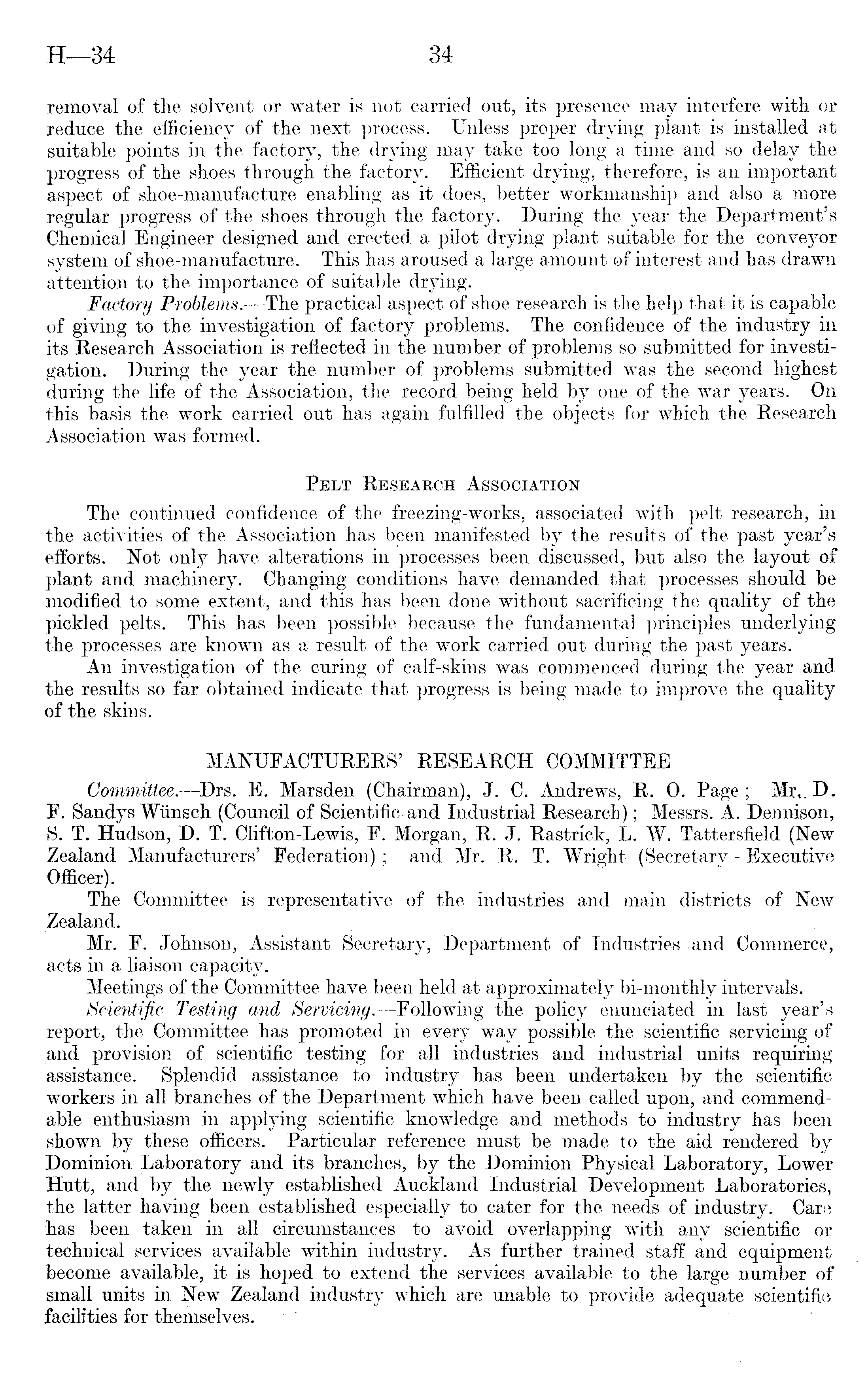 removal of the solvent or water is not carried out, its presence may interfere with or reduce the efficiency of the next process. Unless proper drying plant is installed at suitable points in the factory, the drying may take too long a time and so delay the progress of the shoes through the factory. Efficient drying, therefore, is an important aspect of shoe-manufacture enabling as it does, better workmanship and also a more regular progress of the shoes through the factory. During the year the Department's Chemical Engineer designed and erected a pilot drying plant suitable for the conveyor system of shoe-manufacture. This has aroused a large amount of interest and has drawn attention to the importance of suitable drying. Factory Problems. —The practical aspect of shoe research is the help that it is capable of giving to the investigation of factory problems. The confidence of the industry in its Research Association is reflected in the number of problems so submitted for investigation. During the year the number of problems submitted was the second highest during the life of the Association, the record being held by one of the war years. On this basis the work carried out has again fulfilled the objects for which the Research Association was formed. Pelt Research Association The continued confidence of the freezing-works, associated with pelt research, in the activities of the Association has been manifested by the results of the past year's efforts. Not only have alterations in processes been discussed, but also the layout of plant and machinery. Changing conditions have demanded that processes should be modified to some extent, and this has been done without sacrificing the quality of the pickled pelts. This has been possible because the fundamental principles underlying the processes are known as a result of the work carried out during the past years. An investigation of the curing of calf-skins was commenced during the year and the results so far obtained indicate that progress is being made to improve the quality of the skins. MANUFACTURERS' RESEARCH COMMITTEE Committee. —Drs. E. Marsden (Chairman), J. C. Andrews, R. 0. Page; Mr,.D. F. Sandys Wiinsch (Council of Scientific-and Industrial Research); Messrs. A. Dennison, S. T. Hudson, D. T. Clifton-Lewis, F. Morgan, R. J. Rastrick, L. W. Tattersfield (New Zealand Manufacturers' Federation) ; and Mr. R. T. Wright (Secretary - Executive Officer). The Committee is representative of the industries and main districts of New Zealand. Mr. F. Johnson, Assistant Secretary, Department of Industries and Commerce, acts in a liaison capacity. Meetings of the Committee have been held at approximately bi-monthly intervals. Scientific Testing and Servicing. —Following the policy enunciated in last year's report, the Committee has promoted in every way possible the scientific servicing of and provision of scientific testing for all industries and industrial units requiring assistance. Splendid assistance to industry has been undertaken by the scientific workers in all branches of the Department which have been called upon, and commendable enthusiasm in applying scientific knowledge and methods to industry has been shown by these officers. Particular reference must be made to the aid rendered by Dominion Laboratory and its branches, by the Dominion Physical Laboratory, Lower Hutt, and by the newly established Auckland Industrial Development Laboratories, the latter having been established especially to cater for the needs of industry. Care has been taken in all circumstances to avoid overlapping with any scientific or technical services available within industry. As further trained staff and equipment become available, it is hoped to extend the services available to the large number of small units in New Zealand industry which are unable to provide adequate scientifio facilities for themselves.