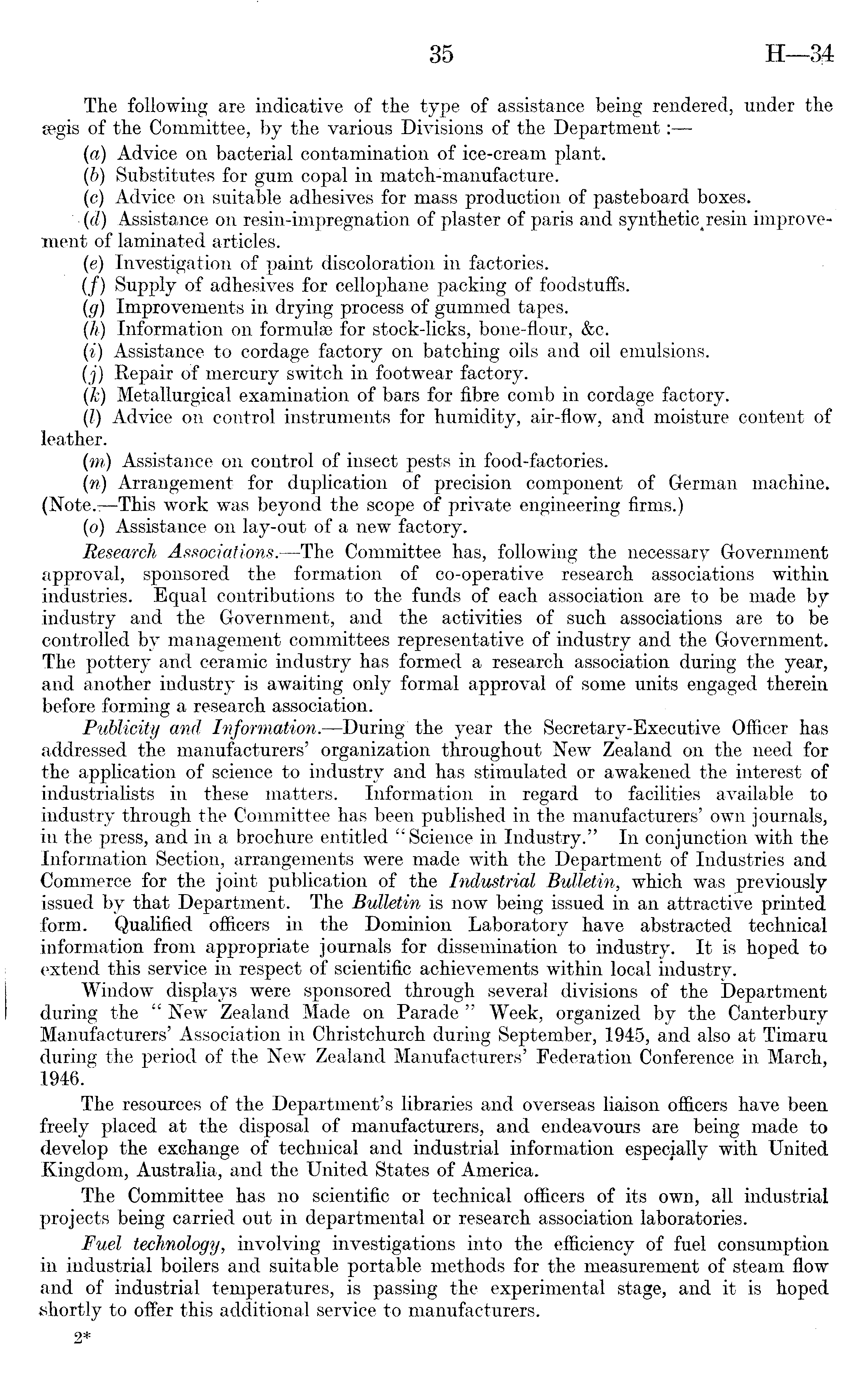 The following are indicative of the type of assistance being rendered, under the segis of the Committee, by the various Divisions of the Department:— (a) Advice on bacterial contamination of ice-cream plant. (b) Substitutes for gum copal in match-manufacture. (c) Advice on suitable adhesives for mass production of pasteboard boxes. (d) Assistance on resin-impregnation of plaster of paris and resin improvement of laminated articles. (e) Investigation of paint discoloration in factories. (/) Supply of adhesives for cellophane packing of foodstuffs. (g) Improvements in drying process of gummed tapes. (h) Information on formulae for stock-licks, bone-flour, &c. (i) Assistance to cordage factory on batching oils and oil emulsions. (j) Eepair of mercury switch in footwear factory. (k) Metallurgical examination of bars for fibre comb in cordage factory. (I) Advice on control instruments for humidity, air-flow, and moisture content of leather. (m) Assistance on control of insect pests in food-factories. (n) Arrangement for duplication of precision component of German machine. (Note.—This work was beyond the scope of private engineering firms.) (o) Assistance on lay-out of a new factory. Research Associations. —-The Committee has, following the necessary Government approval, sponsored the formation of co-operative research associations within industries. Equal contributions to the funds of each association are to be made by industry and the Government, and the activities of such associations are to be controlled by management committees representative of industry and the Government. The pottery and ceramic industry has formed a research association during the year, and another industry is awaiting only formal approval of some units engaged therein before forming a research association. Publicity and Information. —During" the year the Secretary-Executive Officer has addressed the manufacturers' organization throughout New Zealand on the need for the application of science to industry and has stimulated or awakened the interest of industrialists in these matters. Information in regard to facilities available to industry through the Committee has been published in the manufacturers' own journals, in the press, and in a brochure entitled " Science in Industry." In conjunction with the Information Section, arrangements were made with the Department of Industries and Commerce for the joint publication of the Industrial Bulletin, which was previously issued by that Department. The Bulletin is now being issued in an attractive printed form. Qualified officers in the Dominion Laboratory have abstracted technical information from appropriate journals for dissemination to industry. It is hoped to extend this service in respect of scientific achievements within local industry. Window displays were sponsored through several divisions of the Department during the " New Zealand Made on Parade " Week, organized by the Canterbury Manufacturers' Association in Christchurch during September, 1945, and also at Timaru during the period of the New Zealand Manufacturers' Federation Conference in March, 1946. The resources of the Department's libraries and overseas liaison officers have been freely placed at the disposal of manufacturers, and endeavours are being made to develop the exchange of technical and industrial information especially with United Kingdom, Australia, and the United States of America. The Committee has no scientific or technical officers of its own, all industrial projects being carried out in departmental or research association laboratories. Fuel technology, involving investigations into the efficiency of fuel consumption in industrial boilers and suitable portable methods for the measurement of steam flow and of industrial temperatures, is passing the experimental stage, and it is hoped shortly to offer this additional service to manufacturers.
