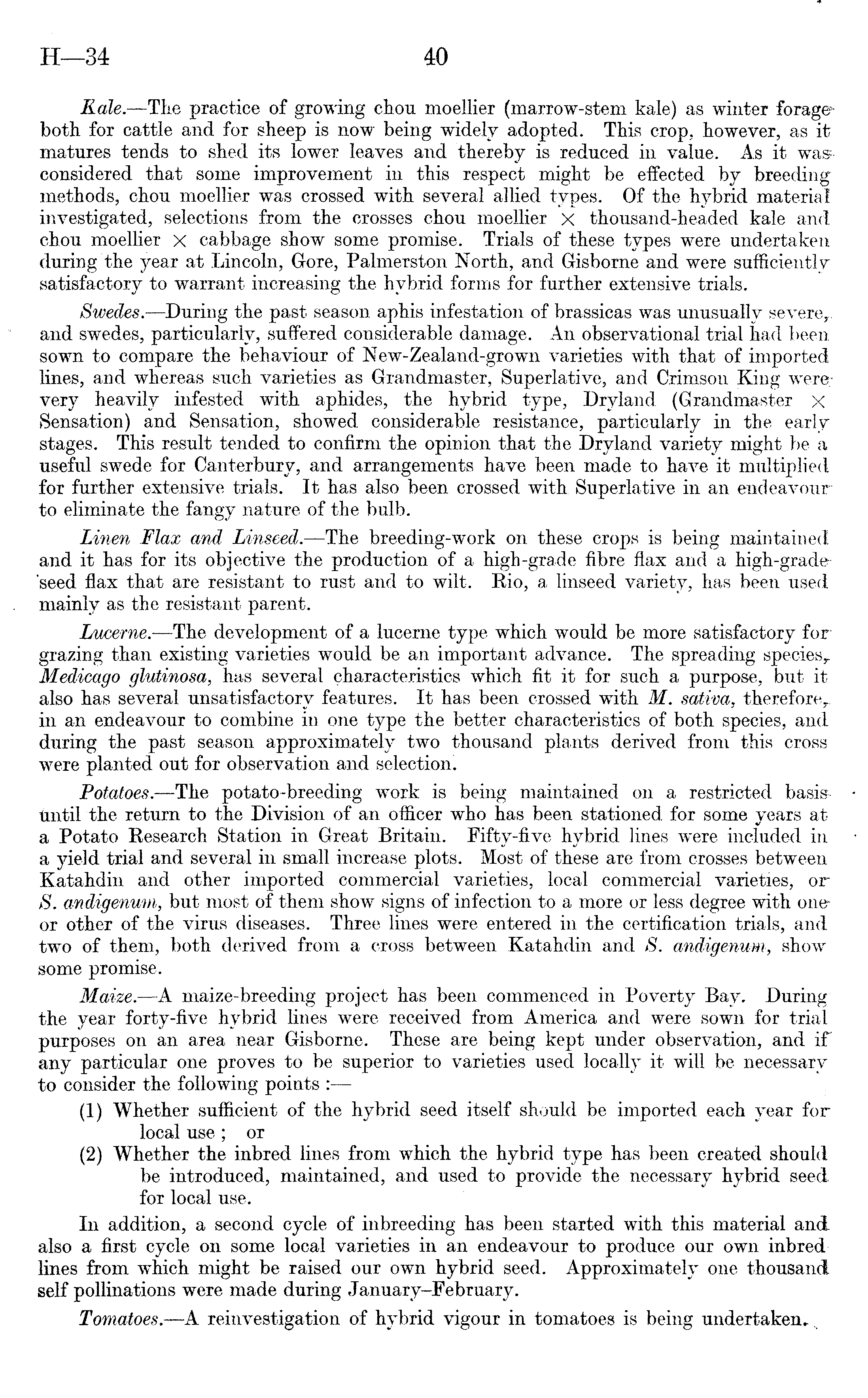 Kale. —The practice of growing chou moellier (marrow-stem kale) as winter forage*both for cattle and for sheep is now being widely adopted. This crop, however, as it matures tends to shed its lower leaves and thereby is reduced in value. As it wasconsidered that some improvement in this respect might be effected by breeding methods, chou moellier was crossed with several allied types. Of the hybrid material investigated, selections from the crosses chou moellier X thousand-headed kale and chou moellier X cabbage show some promise. Trials of these types were undertaken during the year at Lincoln, Gore, Palmerston North, and Gisborne and were sufficiently satisfactory to warrant increasing the. hybrid forms for further extensive trials. Swedes. —During the past season aphis infestation of brassicas was unusually severe,.. and swedes, particularly, suffered considerable damage. An observational trial had been sown to compare the behaviour of New-Zealand-grown varieties with that of imported lines, and whereas such varieties as Grandmaster, Superlative, and Crimson King werevery heavily infested with aphides, the hybrid type, Dryland (Grandmaster x Sensation) and Sensation, showed considerable resistance, particularly in the early stages. This result tended to confirm the opinion that the Dryland variety might be auseful swede for Canterbury, and arrangements have been made to have it multiplied for further extensive trials. It has also been crossed with. Superlative in an endeavour to eliminate the fangy nature of the bulb. Linen Flax and Linseed. —The breeding-work on these crops is being maintained and it has for its objective the production of a high-grade fibre flax and a high-grade-'seed flax that are resistant to rust and to wilt. Kio, a linseed variety, has been used mainly as the resistant parent. Lucerne. —The development of a lucerne type which would be more satisfactory for grazing than existing varieties would be an important advance. The spreading species r Medicago glutinosa, has several characteristics which fit it for such a purpose, but it also has several unsatisfactory features. It has been crossed with M. sativa, therefore,in an endeavour to combine in one type the better characteristics of both species, and during the past season approximately two thousand plants derived from this cross were planted out for observation and selection. Potatoes. —The potato-breeding work is being maintained on a restricted basisUntil the return to the Division of an officer who has been stationed for some years at a Potato Research Station in Great Britain. Fifty-five hybrid lines were included in a yield trial and several in small increase plots. Most of these are from crosses between Katahdin and other imported commercial varieties, local commercial varieties, or S. andigenum, but most of them show signs of infection to a more or less degree with oneor other of the virus diseases. Three lines were entered in the certification trials, and two of them, both derived from a cross between Katahdin and S. andigenum, show some promise. Maize. —A maize-breeding project has been commenced in Poverty Bay. During the year forty-five hybrid lines were received from America and were sown for trial purposes on an area near Gisborne. These are being kept under observation, and if any particular one proves to be superior to varieties used locally it will be necessary to consider the following points : (1) Whether sufficient of the hybrid seed itself should be imported each year for local use; or (2) Whether the inbred lines from which the hybrid type has been created should be introduced, maintained, and used to provide the necessary hybrid seed. for local use. In addition, a second cycle of inbreeding has been started with this material and also a first cycle on some local varieties in an endeavour to produce our own inbred lines from which might be raised our own hybrid seed. Approximately one thousand self pollinations were made during January-February. Tomatoes. —A reinvestigation of hybrid vigour in tomatoes is being undertaken,.