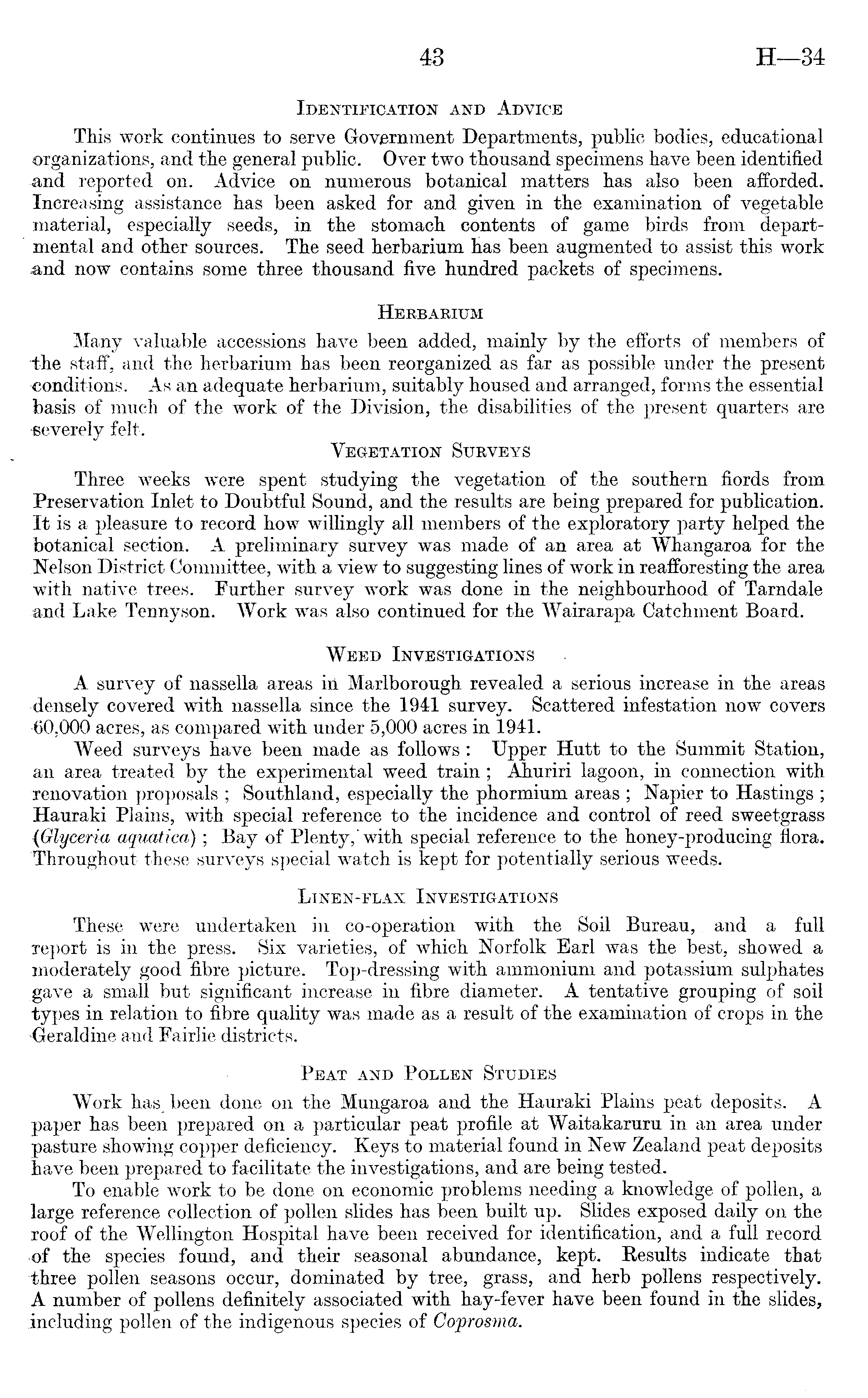 Identification and Advice This work continues to serve Government Departments, public bodies, educational organizations, and the general public. Over two thousand specimens have been identified and reported on. Advice on numerous botanical matters has also been afforded. Increasing assistance has been asked for and given in the examination of vegetable material, especially seeds, in the stomach contents of game birds from departmental and other sources. The seed herbarium has been augmented to assist this work and now contains some three thousand five hundred packets of specimens. Herbarium Many valuable accessions have been added, mainly by the efforts of members of "the staff, and the herbarium has been reorganized as far as possible under the present conditions. As an adequate herbarium, suitably housed and arranged, forms the essential basis of much of the work of the Division, the disabilities of the present quarters are severely felt. Vegetation Surveys Three weeks were spent studying the vegetation of the southern fiords from Preservation Inlet to Doubtful Sound, and the results are being prepared for publication. It is a pleasure to record how willingly all members of the exploratory party helped the botanical section. A preliminary survey was made of an area at Whangaroa for the Nelson District Committee, with a view to suggesting lines of work in reafforesting the area with native trees. Further survey work was done in the neighbourhood of Tarndale and Lake Tennyson. Work was also continued for the Wairarapa Catchment Board. Weed Investigations A survey of nassella areas in Marlborough revealed a serious increase in the areas densely covered with nassella since the 1941 survey. Scattered infestation now covers ■60,000 acres, as compared with under 5,000 acres in 1941. Weed surveys have been made as follows: Upper Hutt to the Summit Station, an area treated by the experimental weed train; Ahuriri lagoon, in connection with renovation proposals ; Southland, especially the phormium areas ; Napier to Hastings ; Hauraki Plains, with special reference to the incidence and control of reed sweetgrass (Glyceric, aquatica) ; Bay of Plenty,'with special reference to the honey-producing flora. Throughout these surveys special watch is kept for potentially serious weeds. Linen-flax Investigations These were undertaken in co-operation with the Soil Bureau,, and a full report is in the press. Six varieties, of which Norfolk Earl was the best, showed a moderately good fibre picture. Top-dressing with ammonium and potassium sulphates gave a small but significant increase in fibre diameter. A tentative grouping of soil types in relation to fibre quality was made as a result of the examination of crops in the ■Gerald ine and Fairlie districts. Peat and Pollen Studies Work has been done on the Mungaroa and the Hauraki Plains peat deposits. A paper has been prepared on a particular peat profile at Waitakaruru in an area under pasture showing copper deficiency. Keys to material found in New Zealand peat deposits nave been prepared to facilitate the investigations, and are being tested. To enable work to be done on economic problems needing a knowledge of pollen, a large reference collection of pollen slides has been built up. Slides exposed daily on the roof of the Wellington Hospital have been received for identification, and a full record of the species found, and their seasonal abundance, kept. Results indicate that three pollen seasons occur, dominated by tree, grass, and herb pollens respectively. A number of pollens definitely associated with hay-fever have been found in the slides, including pollen of the indigenous species of Coprosma.
