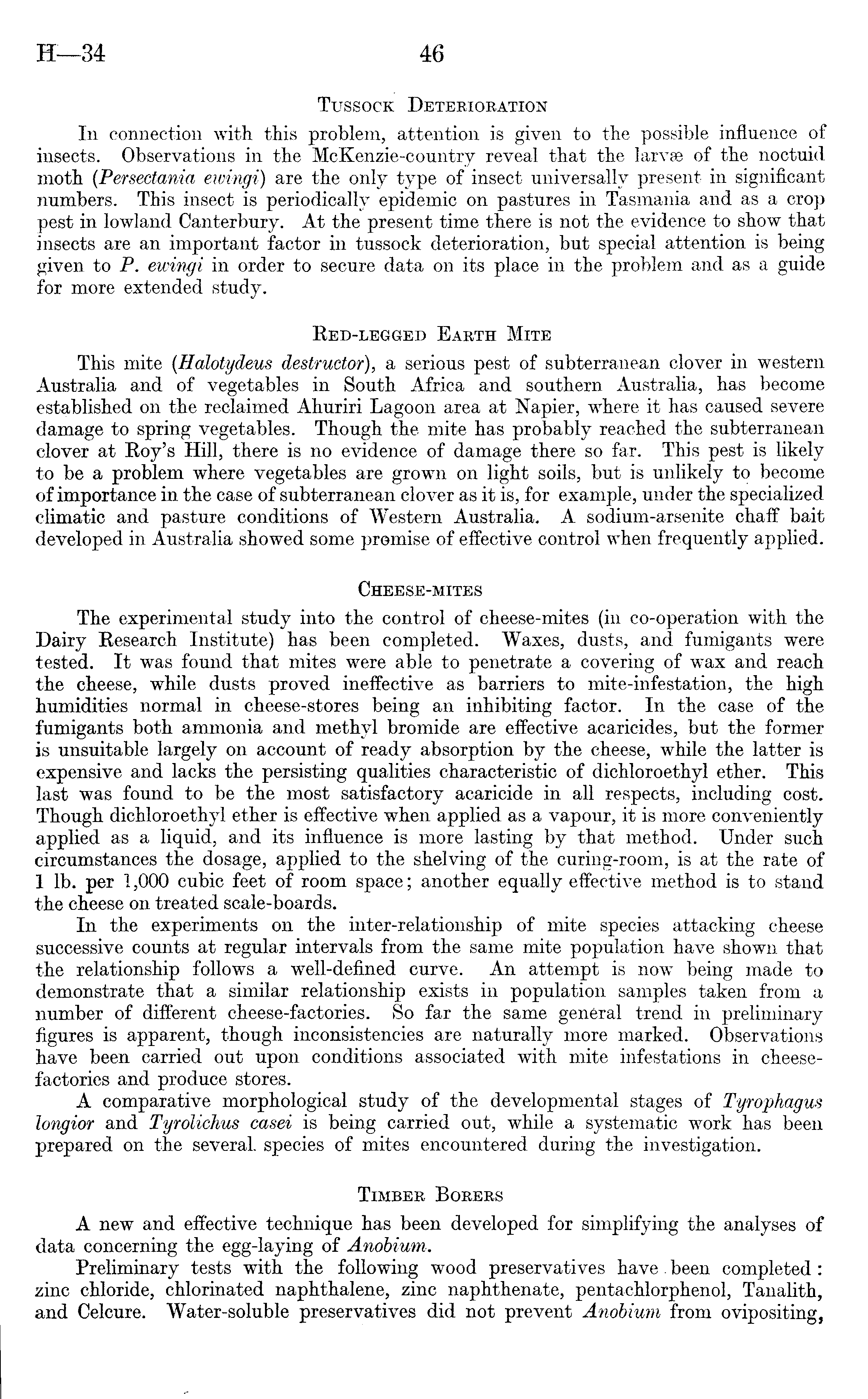 Tussock Deterioration In connection with this problem, attention is given to the possible influence of insects. Observations in the McKenzie-country reveal that the larvae of the noctuid moth (Persectania ewingi) are the only type of insect universally present in significant numbers. This insect is periodically epidemic on pastures in Tasmania and as a crop pest in lowland Canterbury. At the present time there is not the evidence to show that insects are an important factor in tussock deterioration, but special attention is being given to P. ewingi in order to secure data on its place in the problem and as a guide for more extended study. Red-legged Earth Mite This mite (Halotydeus destructor), a serious pest of subterranean clover in western Australia and of vegetables in South Africa and southern Australia, has become established on the reclaimed Ahuriri Lagoon area at Napier, where it has caused severe damage to spring vegetables. Though the mite has probably reached the subterranean clover at Roy's Hill, there is no evidence of damage there so far. This pest is likely to be a problem where vegetables are grown on light soils, but is unlikely to become of importance in the case of subterranean clover as it is, for example, under the specialized climatic and pasture conditions of Western Australia. A sodium-arsenite chaff bait developed in Australia showed some promise of effective control when frequently applied. Cheese-mites The experimental study into the control of cheese-mites (in co-operation with the Dairy Research Institute) has been completed. Waxes, dusts, and fumigants were tested. It was found that mites were able to penetrate a covering of wax and reach the cheese, while dusts proved ineffective as barriers to mite-infestation, the high humidities normal in cheese-stores being an inhibiting factor. In the case of the fumigants both ammonia and methyl bromide are effective acaricides, but the former is unsuitable largely on account of ready absorption by the cheese, while the latter is expensive and lacks the persisting qualities characteristic of dichloroethyl ether. This last was found to be the most satisfactory acaricide in all respects, including cost. Though dichloroethyl ether is effective when applied as a vapour, it is more conveniently applied as a liquid, and its influence is more lasting by that method. Under such circumstances the dosage, applied to the shelving of the curing-room, is at the rate of 1 lb. per 1,000 cubic feet of room space; another equally effective method is to stand the cheese on treated scale-boards. In the experiments on the inter-relationship of mite species attacking cheese successive counts at regular intervals from the same mite population have shown that the relationship follows a well-defined curve. An attempt is now being made to demonstrate that a similar relationship exists in population samples taken from a number of different cheese-factories. So far the same general trend in preliminary figures is apparent, though inconsistencies are naturally more marked. Observations have been carried out upon conditions associated with mite infestations in cheesefactories and produce stores. A comparative morphological study of the developmental stages of Tyrophagus longior and Tyrolichus casei is being carried out, while a systematic work has been prepared on the several, species of mites encountered during the investigation. Timber Borers A new and effective technique has been developed for simplifying the analyses of data concerning the egg-laying of Anobium. t Preliminary tests with the following wood preservatives have. been completed: zinc chloride, chlorinated naphthalene, zinc naphthenate, pentachlorphenol, Tanalith, and Celcure. Water-soluble preservatives did not prevent Anobium from ovipositing,