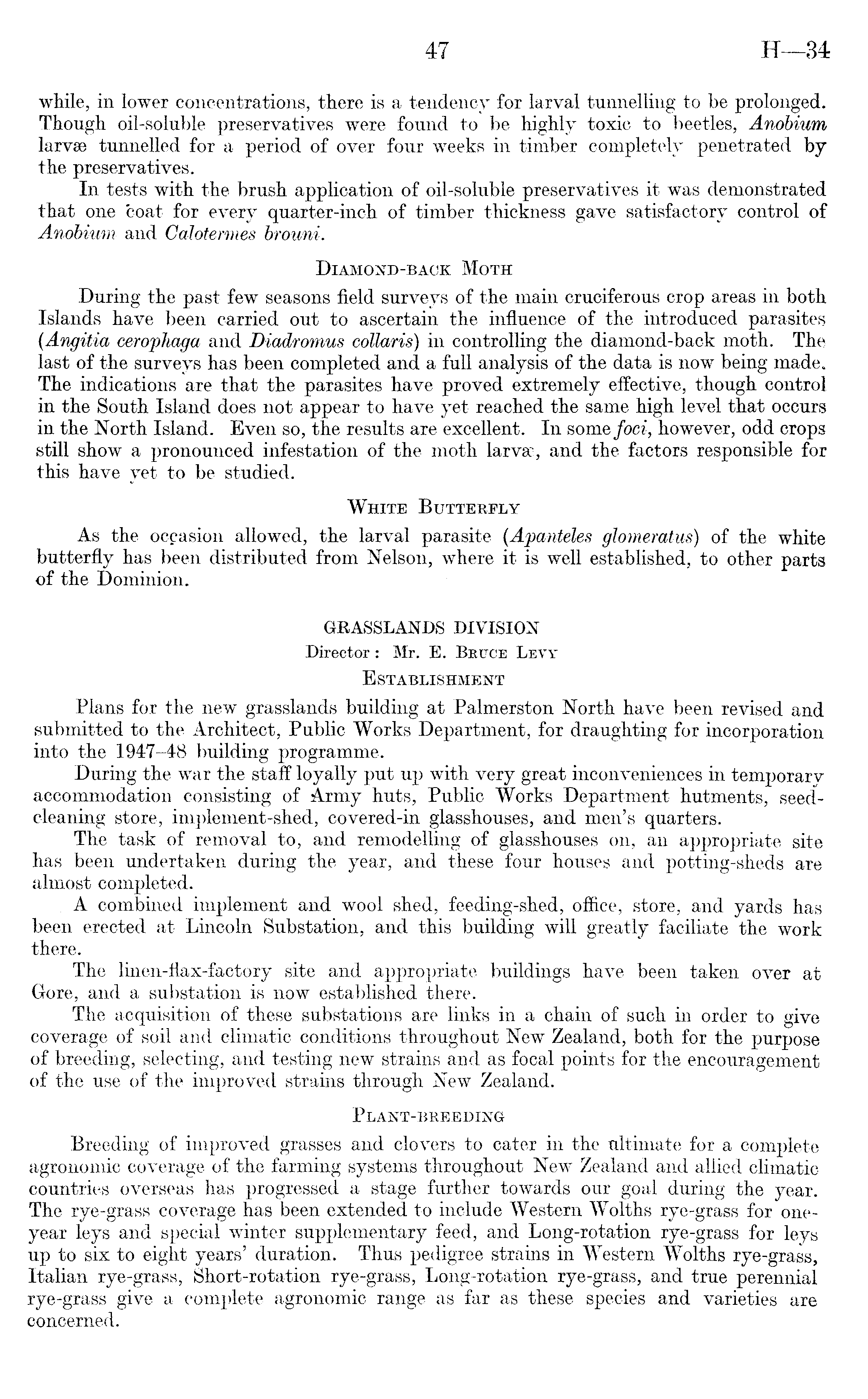 while, in lower concentrations, there is a tendency for larval tunnelling to be prolonged. Though oil-soluble preservatives were found to be highly toxic to beetles, Anobium larvse tunnelled for a period of over four weeks in timber completely penetrated by the preservatives. In tests with the brush application of oil-soluble preservatives it was demonstrated that one coat for every quarter-inch of timber thickness gave satisfactory control of Anobium and Calotermes brouni. Diamond-back Moth During the past few seasons field surveys of the main cruciferous crop areas in both Islands have been carried out to ascertain the influence of the introduced parasites (Angitia ceropJiaga and Diadromus collaris) in controlling the diamond-back moth. The last of the surveys has been completed and a full analysis of the data is now being made. The indications are that the parasites have proved extremely effective, though control in the South Island does not appear to have yet reached the same high level that occurs in the North Island. Even so, the results are excellent. In some foci, however, odd crops still show a pronounced infestation of the moth larva, and the factors responsible for this have yet to be studied. White Butterfly As the occasion allowed, the larval parasite (Apanteles glomeratus) of the white butterfly has been distributed from Nelson, where it is well established, to other parts of the Dominion. GRASSLANDS DIVISION Director: Mr. E. Bruce Levy Establishment Plans for the new grasslands building at Palmerston North have been revised and submitted to the Architect, Public Works Department, for draughting for incorporation into the 1947-48 building programme. During the war the staff loyally put up with very great inconveniences in temporary accommodation consisting of Army huts, Public Works Department hutments, seedcleaning store, implement-shed, covered-in glasshouses, and men's quarters. The task of removal to, and remodelling of glasshouses on, an appropriate site has been undertaken during the year, and these four, houses and potting-sheds are almost completed. A combined implement and wool shed, feeding-shed, office, store, and yards has been erected at Lincoln Substation, and this building will greatly faciliate the work there. The linen-flax-factory site and appropriate buildings have been taken over at Gore, and a substation is now established there. The acquisition of these substations are links in a chain of such in order to give coverage of soil and climatic conditions throughout New Zealand, both for the purpose of breeding, selecting, and testing new strains and as focal points for the encouragement of the use of the improved strains through New Zealand. Plant-breeding Breeding of improved grasses and clovers to cater in the ultimate for a complete agronomic coverage of the farming systems throughout New Zealand and allied climatic countries overseas has progressed a stage further towards our goal during the year. The rye-grass coverage has been extended to include Western Wolths rye-grass for oneyear leys and special winter supplementary feed, and Long-rotation rye-grass for leys up to six to eight years' duration. Thus pedigree strains in Western Wolths rye-grass, Italian rye-grass, Short-rotation rye-grass, Long-rotation rye-grass, and true perennial rye-grass give a complete agronomic range as far as these species and varieties are concerned.