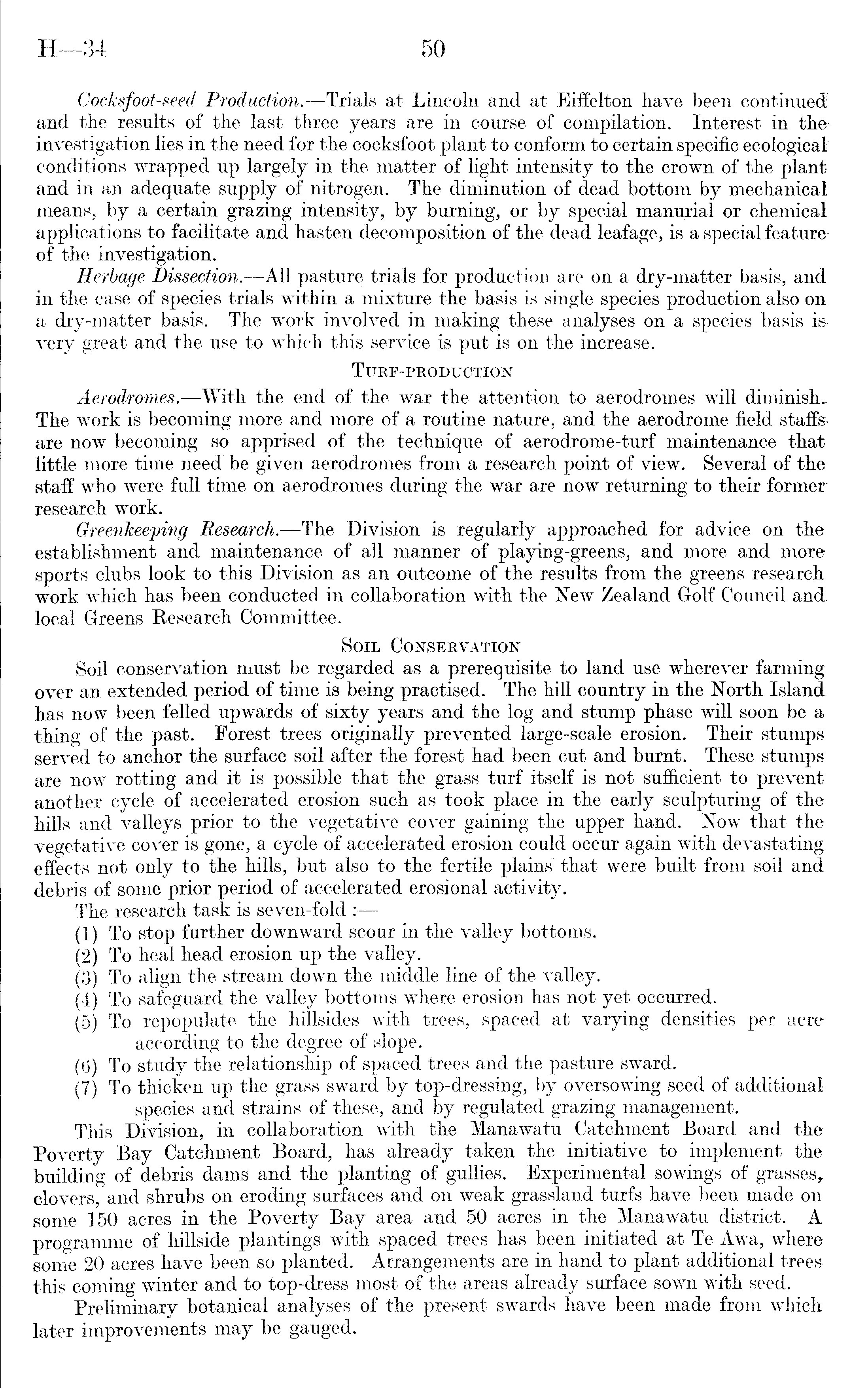 Cocksfoot-seed Production.—Trials at Lincoln and at Eiffelton have been continued and the results of the last three years are in course of compilation. Interest in theinvestigation lies in the need for the cocksfoot plant to conform to certain specific ecological conditions wrapped up largely in the matter of light intensity to the crown of the plant and in an adequate supply of nitrogen. The diminution of dead bottom by mechanical means, by a certain grazing intensity, by burning, or by special manurial or chemical applications to facilitate and hasten decomposition of the dead leafage, is a special feature of the investigation. Herbage Dissection. —All pasture trials for production are on a dry-matter basis, and in the case of species trials within a mixture the basis is single species production also on. a dry-matter basis. The work involved in making these analyses on a species basis is very great and the use to which this service is put is on the increase. Turf-production Aerodromes. —With the end of the war the attention to aerodromes will diminish.. The work is becoming more and more of a routine nature, and the aerodrome field staff®' are now becoming so apprised of the technique of aerodrome-turf maintenance that little more time need be given aerodromes from a research point of view. Several of the staff who were full time on aerodromes during the war are now returning to their former research work. Greenkeeping Research. —The Division is regularly approached for advice on the establishment and maintenance of all manner of playing-greens, and more and more sports clubs look to this Division as an outcome of the results from the greens research work which has been conducted in collaboration with the New Zealand Golf Council and local Greens Eesearch Committee. Soil Conservation Soil conservation must be regarded as a prerequisite to land use wherever farming over an extended period of time is being practised. The hill country in the North Island has now been felled upwards of sixty years and the log and stump phase will soon be a thing of the past. Forest trees originally prevented large-scale erosion. Their stumps served to anchor the surface soil after the forest had been cut and burnt. These stumps are now rotting and it is possible that the grass turf itself is not sufficient to prevent another cycle of accelerated erosion such as took place in the early sculpturing of the hills and valleys prior to the vegetative cover gaining the upper hand. Now that the vegetative cover is gone, a cycle of accelerated erosion could occur again with devastating effects not only to the hills, but also to the fertile plains that were built from soil and debris of some prior period of accelerated erosional activity. The research task is seven-fold : (1) To stop further downward scour in the valley bottoms. (2) To heal head erosion up the valley. (3) To align the stream down the middle line of the valley. (4) To safeguard the valley bottoms where erosion has not yet occurred. (5) To repopulate the hillsides with trees, spaced at varying densities per acre according to the degree of slope. (6) To study the relationship of spaced trees and the pasture sward. (7) To thicken up the grass sward by top-dressing, by oversowing seed of additional species and strains of these, and by regulated grazing management. This Division, in collaboration with the Manawatu Catchment Board and the Poverty Bay Catchment Board, has already taken the initiative to implement the building of debris dams and the planting of gullies. Experimental sowings of grasses, clovers, and shrubs on eroding surfaces and on weak grassland turfs have been made on some 150 acres in the Poverty Bay area and 50 acres in the Manawatu district. A programme of hillside plantings with spaced trees has been initiated at Te Awa, where some 20 acres have been so planted. Arrangements are in hand to plant additional trees this coming winter and to top-dress most of the areas already surface sown with seed. Preliminary botanical analyses of the present swards have been made from which later improvements may be gauged.