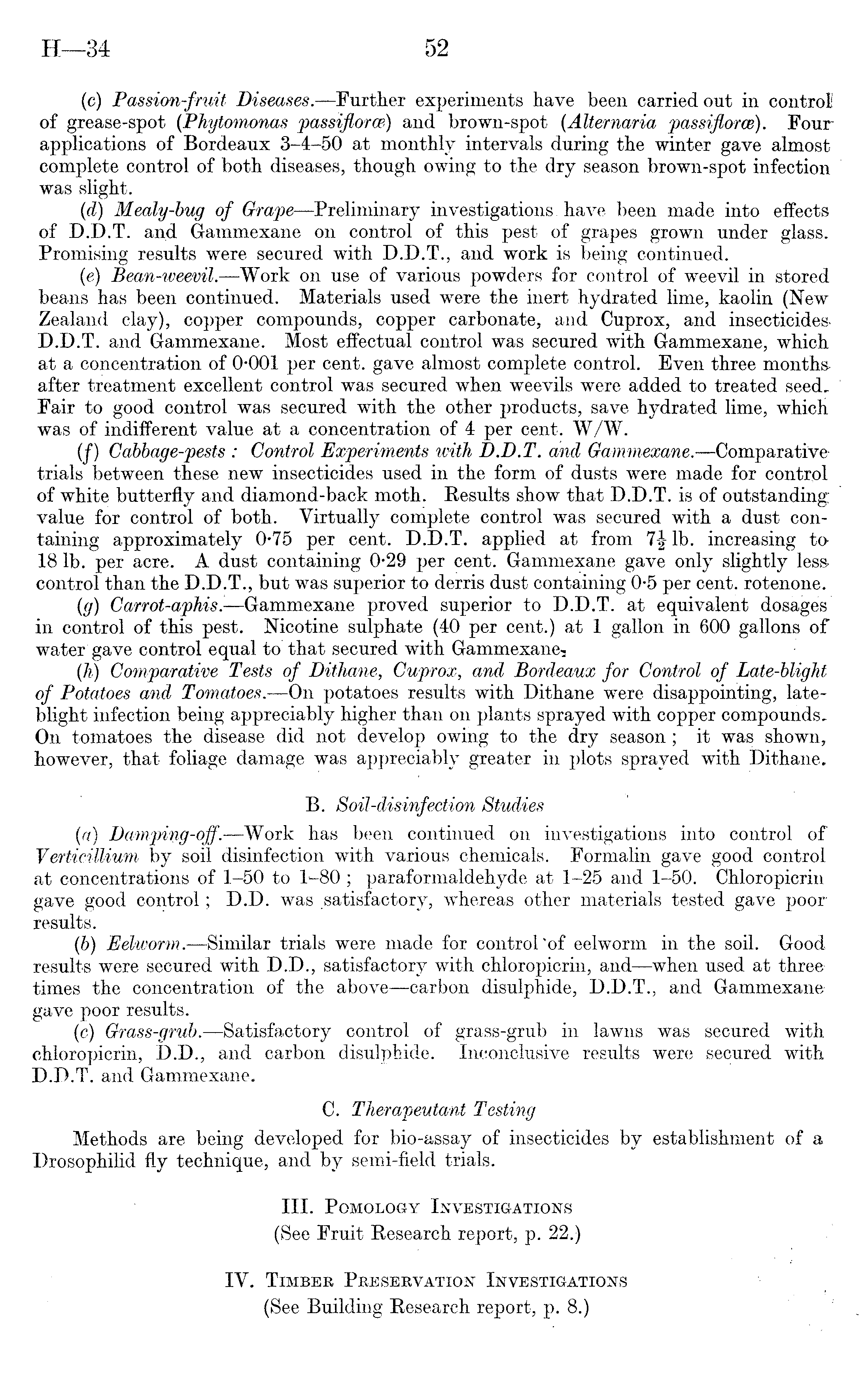 (c) Passion-fruit Diseases.— Further experiments have been carried out in control of grease-spot (Phytomonas passiflorce) and brown-spot (Alternaria passiflorw). Four applications of Bordeaux 3-4-50 at monthly intervals during the winter gave almost complete control of both diseases, though owing to the dry season brown-spot infection was slight. (d) Mealy-bug of Grape —Preliminary investigations have been made into effects of D.D.T. and Gammexane on control of this pest of grapes grown under glass. Promising results were secured with D.D.T., and work is being continued. (e) Bean-iveeviL—Woxk on use of various powders for control of weevil in stored beans has been continued. Materials used were the inert hydrated lime, kaolin (New Zealand clay), copper compounds, copper carbonate, and Cuprox, and insecticides. D.D.T. and Gammexane. Most effectual control was secured with Gammexane, which at a concentration of 0-001 per cent, gave almost complete control. Even three monthsafter treatment excellent control was secured when weevils were added to treated seed. Fair to good control was secured with the other products, save hydrated lime, which was of indifferent value at a concentration of 4 per cent. W/W. (f) Cabbage-pests : Control Experiments with D.D.T. and Gammexane.—Comparativetrials between these new insecticides used in the form of dusts were made for control of white butterfly and diamond-back moth. Eesults show that D.D.T. is of outstanding; value for control of both. Virtually complete control was secured with a dust containing approximately 0*75 per cent. D.D.T. applied at from lb. increasing to 18 lb. per acre. A dust containing 0-29 per cent. Gammexane gave only slightly lesscontrol than the D.D.T., but was superior to derris dust containing 0-5 per cent, rotenone. (g) Carrot-aphis. —Gammexane proved superior to D.D.T. at equivalent dosages in control of this pest. Nicotine sulphate (40 per cent.) at 1 gallon in 600 gallons of water gave control equal to that secured with Gammexane, (h) Comparative Tests of Dithane, Cuprox, and Bordeaux for Control of Late-blight of Potatoes and Tomatoes. —On potatoes results with Dithane were disappointing, lateblight infection being appreciably higher than on plants sprayed with copper compounds. On tomatoes the disease did not develop owing to the dry season ; it was shown, however, that foliage damage was appreciably greater in plots sprayed with Dithane. B. Soil-disinfection Studies (a) Damping-off. —Work has been continued on investigations into control of Verticillium by soil disinfection with various chemicals. Formalin gave good control at concentrations of 1-50 to 1-80 ; paraformaldehyde at 1-25 and 1-50. Chloropicrin gave good control; D.D. was satisfactory, whereas other materials tested gave poor results. (b) Eelworm. —Similar trials were made for control'of eelworm in the soil. Good results were secured with D.D., satisfactory with chloropicrin, and —when used at three times the concentration of the above —carbon disulphide, D.D.T., and Gammexane gave poor results. (c) Grass-grub. —Satisfactory control of grass-grub in lawns was secured with chloropicrin, D.D., and carbon disulphide. Inconclusive results were secured with D.D.T. and Gammexane. C. Therapeutant Testing Methods are being developed for bio-assay of insecticides by establishment of a Drosophilid fly technique, and by semi-field trials. 111. Pomology Investigations (See Fruit Research report, p. 22.) IV. Timber Preservation Investigations (See Building Research report, p. 8.)