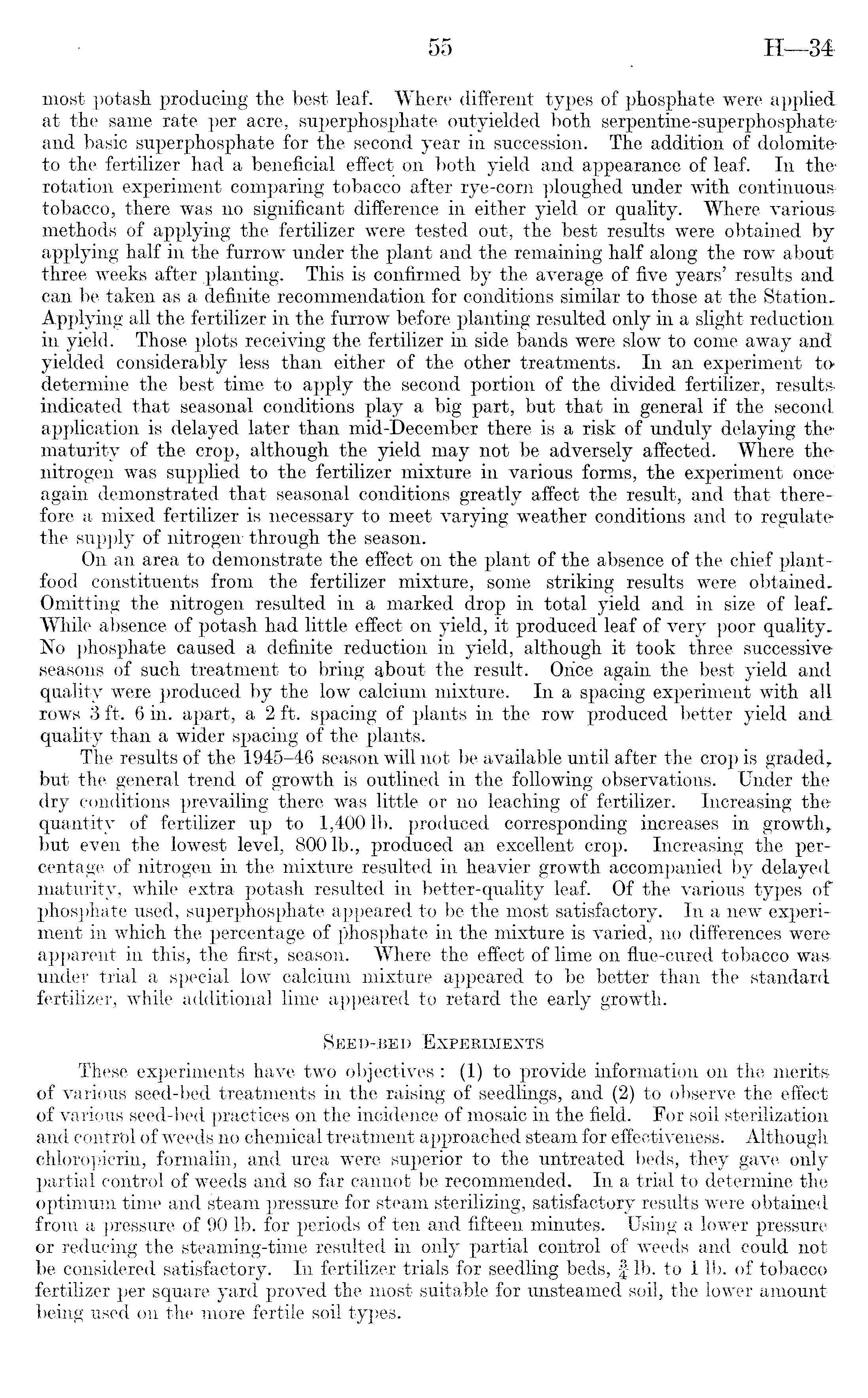 most potash producing the best leaf. Where different types of phosphate were applied at the same rate per acre, superphosphate outyielded both serpentine-superphosphate-and basic superphosphate for the second year in succession. The addition of dolomiteto the fertilizer had a beneficial effect on both yield and appearance of leaf. In therotation experiment comparing tobacco after rye-corn ploughed under with continuoustobacco, there was no significant difference in either yield or quality. Where variousmethods of applying the fertilizer were tested out, the best results were obtained by applying half in the furrow under the plant and the remaining half along the row about three weeks after planting. This is confirmed by the average of five years' results and can be taken as a definite recommendation for conditions similar to those at the StationApplying all the fertilizer in the furrow before planting resulted only in a slight reduction in yield. Those plots receiving the fertilizer in side bands were slow to come away and yielded considerably less than either of the other treatments. In an experiment todetermine the best time to apply the second portion of the divided fertilizer, resultsindicated that seasonal conditions play a big part, but that in general if the second application is delayed later than mid-December there is a risk of unduly delaying the maturity of the crop, although the yield may not be adversely affected. Where the nitrogen was supplied to the fertilizer mixture in various forms, the experiment once again demonstrated that seasonal conditions greatly affect the result, and that therefore a mixed fertilizer is necessary to meet varying weather conditions and to regulate the supply of nitrogen- through the season. On an area to demonstrate the effect on the plant of the absence of the chief plantfood constituents from the fertilizer mixture, some striking results were obtained. Omitting the nitrogen resulted in a marked drop in total yield and in size of leafWhile absence of potash had little effect on yield, it produced leaf of very poor qualityNo phosphate caused a definite reduction in yield, although it took three successive seasons of such treatment to bring about the result. Once again the best yield and quality were produced by the low calcium mixture. In a spacing experiment with all rows 3 ft. 6 in. apart, a 2 ft. spacing of plants in the row produced better yield and quality than a wider spacing of the plants. The results of the 1945-46 season will not be available until after the crop is graded,. but the general trend of growth is outlined in the following observations. Under the dry conditions prevailing there was little or no leaching of fertilizer. Increasing the quantity of fertilizer up to 1,400 lb. produced corresponding increases in growth,, but even the lowest level, 800 lb., produced an excellent crop. Increasing the percentage of nitrogen in the mixture resulted in heavier growth accompanied by delayed maturity, while extra potash resulted in better-quality leaf. Of the various types of phosphate used, superphosphate appeared to be the most satisfactory. In a new experiment in which the percentage of phosphate in the mixture is varied, no differences were apparent in this, the first, season. Where the effect of lime on flue-cured tobacco wasunder trial a special low calcium mixture appeared to be better than the standard fertilizer, while additional lime appeared to retard the early growth. Seed-bed Experiments These experiments have two objectives : (1) to provide information on the merits of various seed-bed treatments in the raising of seedlings, and (2) to observe the effect of various seed-bed practices on the incidence of mosaic in the field. For soil sterilization and control of weeds no chemical treatment approached steam for effectiveness. Although chloropicrin, formalin, and urea were superior to the untreated beds, they gave only partial control of weeds and so far cannot be recommended. In a trial to determine the optimum time and steam pressure for steam sterilizing, satisfactory results were obtained from a pressure of 90 lb. for periods of ten and fifteen minutes. Using a lower pressure or reducing the steaming-time resulted in only partial control of weeds and could not be considered satisfactory. In fertilizer trials for seedling beds, § lb. to 1 lb. of tobacco fertilizer per square yard proved the most suitable for unsteamed soil, the lower amount being used on the more fertile soil types.