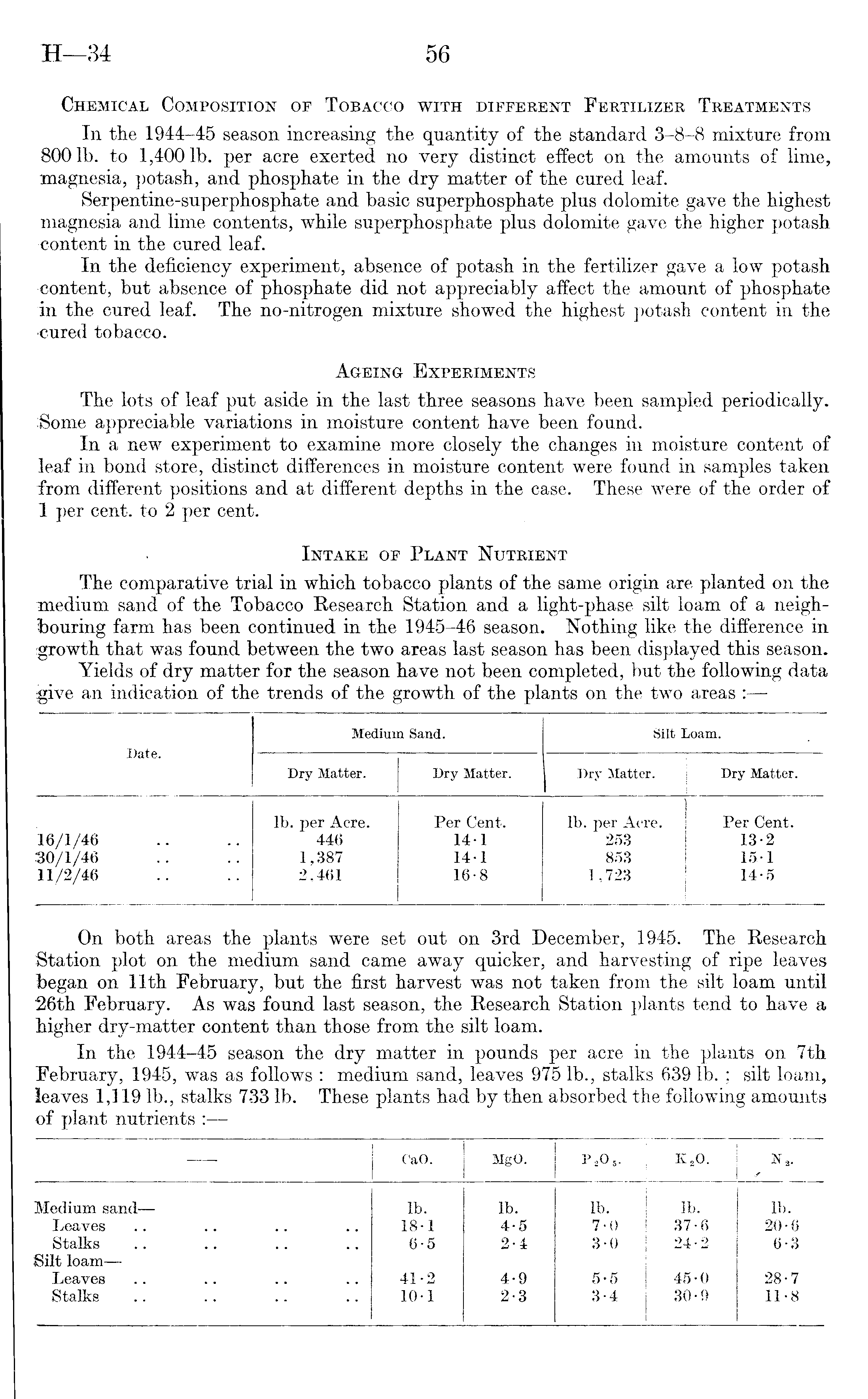 On both areas the plants were set out on 3rd December, 1945. The Kesearch Station plot on the medium sand came away quicker, and harvesting of ripe leaves began on 11th February, but the first harvest was not taken from the silt loam until 26th February. As was found last season, the Eesearch Station plants tend to have a higher dry-matter content than those from the silt loam.