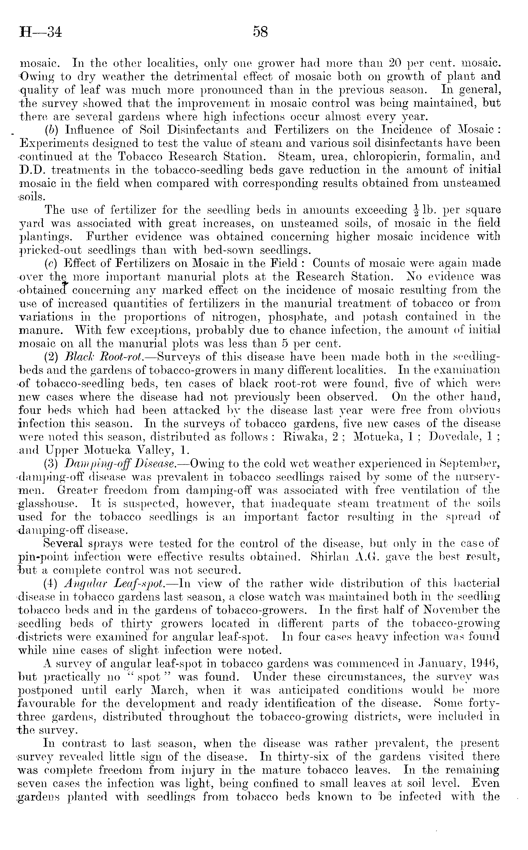 mosaic. In the other localities, only one grower had more than 20 per cent, mosaic. Owing to dry weather the detrimental effect of mosaic both on growth of plant and •quality of leaf was much more pronounced than in the previous season. In general, "the survey showed that the improvement in mosaic control was being maintained, but there are several gardens where high infections occur almost every year. (b) Influence of Soil Disinfectants and Fertilizers on the Incidence of Mosaic : Experiments designed to test the value of steam and various soil disinfectants have been ■continued at the Tobacco Research Station. Steam, urea, chloropicrin, formalin, and D.D. treatments in the tobacco-seedling beds gave reduction in the amount of initial mosaic in the field when compared with corresponding results obtained from unsteamed «oils. The use of fertilizer for the seedling beds in amounts exceeding Jib. per square yard was associated with great increases, on unsteamed soils, of mosaic in the field plantings. Further evidence was obtained concerning higher mosaic incidence with pricked-out seedlings than with bed-sown seedlings. (c) Effect of Fertilizers on Mosaic in the Field : Counts of mosaic were again made over the more important manurial plots at the Research Station. No evidence was •obtained concerning any marked effect on the incidence of mosaic resulting from the use of increased quantities of fertilizers in the manurial treatment of tobacco or from variations in the proportions of nitrogen, phosphate, and potash contained in the manure. With few exceptions, probably due to chance infection, the amount of initial mosaic on all the manurial plots was less than 5 per cent. (2) Black Root-rot. —Surveys of this disease have been made both in the seedlingbeds and the gardens of tobacco-growers in many different localities. In the examination •of tobacco-seedling beds, ten cases of black root-rot were found, five of which were new cases where the disease had not previously been observed. On the other hand, four beds which had been attacked by the disease last year were free from obvious infection this season. In the surveys of tobacco gardens, five new cases of the disease were noted this season, distributed as follows : Riwaka, 2 ; Motueka, 1 ; Dovedale, 1 ; and Upper Motueka Valley, 1. (3) Dam ping-off Disease. —Owing to the cold wet weather experienced in September, ■damping-off disease was prevalent in tobacco seedlings raised by some of the nurserymen. Greater freedom from damping-off was associated with free ventilation of the ■glasshouse. It is suspected, however, that inadequate steam treatment of the soils used for the tobacco seedlings is an important factor resulting in the spread of •damping-off disease. Several sprays were tested for the control of the disease, but only in the case of pin-point infection were effective results obtained. Shirlan A.G. gave the best result, "but a complete control was not secured. (4) Angular Leaf-sjpot.—hi view of the rather wide distribution of this bacterial ■disease in tobacco gardens last season, a close watch was maintained both in the seedling tobacco beds arid in the gardens of tobacco-growers. In the first half of November the seedling beds of thirty growers located in different parts of the tobacco-growing ■districts were examined for angular leaf-spot. In four cases heavy infection was found while nine cases of slight infection were noted. A survey of angular leaf-spot in tobacco gardens was commenced in January, 1946, but practically no " spot " was found. Under these circumstances, the survey was postponed until early March, when it was anticipated conditions would be more favourable for the development and ready identification of the disease. Some fortythree gardens, distributed throughout the tobacco-growing districts, were included in the survey. In contrast to last season, when the disease was rather prevalent, the present -survey revealed little sign of the disease. In thirty-six of the gardens visited there was complete freedom from injury in the mature tobacco leaves. In the remaining seven cases the infection was light, being confined to small leaves at soil level. Even gardens planted with seedlings from tobacco beds known to 'be infected with the