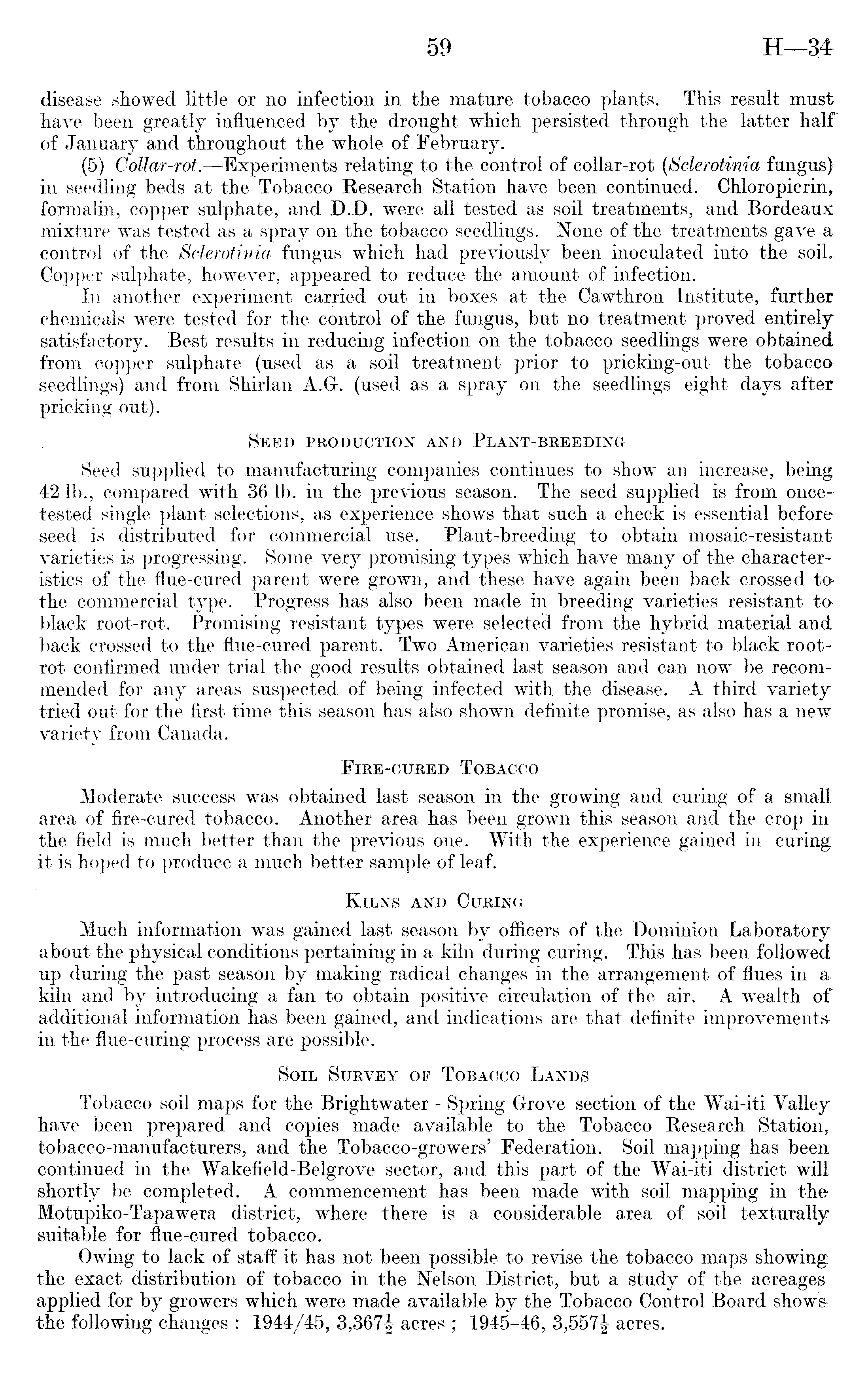 disease showed little or no infection in the mature tobacco plants. This result must have been greatly influenced by the drought which persisted through the latter half of January and throughout the whole of February. (5) Collar-rot. —Experiments relating to the control of collar-rot (Sclerotinia fungus) in seedling beds at the Tobacco Research Station have been continued. Chloropicrin, formalin, copper sulphate, and D.D. were all tested as soil treatments, and Bordeaux mixture was tested as a spray on the tobacco seedlings. None of the treatments gave a control of the Sclerotinia fungus which had previously been inoculated into the soilCopper sulphate, however, appeared to reduce the amount of infection. I)i another experiment carried out in boxes at the Cawthron Institute, further chemicals were tested for the control of the fungus, but no treatment proved entirely satisfactory. Best results in reducing infection on the tobacco seedlings were obtained from copper sulphate (used as a soil treatment prior to pricking-out the tobacco seedlings) and from Shirlan A.G. (used as a spray on the seedlings eight days after pricking out). Seed production and Plant-breeding Seed supplied to manufacturing companies continues to show an increase, being 42 lb., compared with 36 lb. in the previous season. The seed supplied is from oncetested single plant selections, as experience shows that such a check is essential before seed is distributed for commercial use. Plant-breeding to obtain mosaic-resistant varieties is progressing. Some very promising types which have many of the characteristics of the flue-cured parent were grown, and these have again been back crossed tothe commercial type. Progress has also been made in breeding varieties resistant to black root-rot. Promising resistant types were selected from the hybrid material and back crossed to the flue-cured parent. Two American varieties resistant to black rootrot confirmed under trial the good results obtained last season and can now be recommended for any areas suspected of being infected with the disease. A third variety tried out for the first time this season has also shown definite promise, as also has a new variety from Canada. Fire-cured Tobacco Moderate success was obtained last season in the growing and curing of a small area of fire-cured tobacco. Another area has been grown this season and the crop in the field is much better than the previous one. With the experience gained in curing it is hoped to produce a much better sample of leaf. Kilns and Curing Much information was gained last season by officers of the Dominion Laboratory about the physical conditions pertaining in a kiln during curing. This has been followed up during the past season by making radical changes in the arrangement of flues in a kiln and by introducing a fan to obtain positive circulation of the air. A wealth of additional information has been gained, and indications are that definite improvementsin the flue-curing process are possible. Soil Survey of Tobacco Lands Tobacco soil maps for the Brightwater - Spring Grove section of the Wai-iti Valley have been prepared and copies made available to the Tobacco Research Station,, tobacco-manufacturers, and the Tobacco-growers' Federation. Soil mapping has been continued in the Wakefield-Belgrove sector, and this part of the Wai-iti district will shortly be completed. A commencement has been made with soil mapping in the-Motupiko-Tapawera district, where there is a considerable area of soil texturally suitable for flue-cured tobacco. Owing to lack of staff it has not been possible to revise the tobacco maps showing the exact distribution of tobacco in the Nelson District, but a study of the acreages applied for by growers which were made available by the Tobacco Control Board shows, the following changes : 1944/45, 3,367| acres ; 1945-46, 3,557| acres.