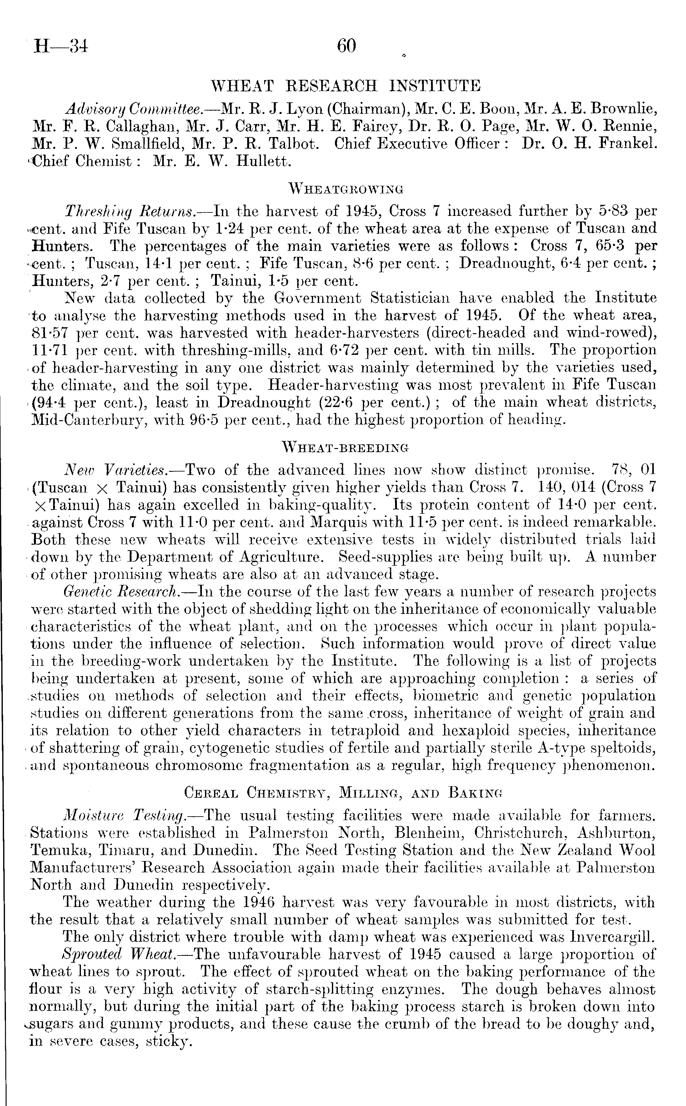 WHEAT RESEARCH INSTITUTE Advisory Committee. —Mr. R. J. Lyon (Chairman), Mr. C. E. Boon, Mr. A. E. Brownlie, Mr. F. R. Callaghan, Mr. J. Carr, Mr. H. E. Fairey, Dr. R. 0. Page, Mr. W. 0. Rennie, Mr. P. W. Smallfield, Mr. P. R. Talbot, Chief Executive Officer : Dr. 0. H. Frankel. 'Chief Chemist: Mr. E. W. Hullett. Wheatgrowing Threshing Returns. —ln the harvest of 1945, Cross 7 increased further by 5-83 per •cent, and Fife Tuscan by 1-24 per cent, of the wheat area at the expense of Tuscan and Hunters. The percentages of the main varieties were as follows : Cross 7, 65-3 per -cent. ; Tuscan, 14-1 per cent. ; Fife Tuscan, 8-6 per cent. ; Dreadnought, 6-4 per cent. ; Hunters, 2-7 per cent. ; Tainui, 1-5 per cent. New data collected by the Government Statistician have enabled the Institute to analyse the harvesting methods used in the harvest of 1945. Of the wheat area, 81-57 per cent, was harvested with header-harvesters (direct-headed and wind-rowed), 11-71 per cent, with threshing-mills, and 6-72 per cent, with tin mills. The proportion •of header-harvesting in any one district was mainly determined by the varieties used, the climate, and the soil type. Header-harvesting was most prevalent in Fife Tuscan (94-4 per cent.), least in Dreadnought (22-6 per cent.) ; of the main wheat districts, Mid-Canterbury, with 96-5 per cent., had the highest proportion of heading. Wheat-breeding New Varieties. —Two of the advanced lines now show distinct promise. 78, 01 (Tuscan x Tainui) has consistently given higher yields than Cross 7. 140, 014 (Cross 7 X Tainui) has again excelled in baking-quality. Its protein content of 14-0 per cent, against Cross 7 with 11-0 per cent, and Marquis with 11-5 per cent, is indeed remarkable. Both these new wheats will receive extensive tests in widely distributed trials laid down by the Department of Agriculture. Seed-supplies are being built up. A number .of other promising wheats are also at an advanced stage. Genetic Research. —ln the course of the last few years a number of research projects were started with the object of shedding light on the inheritance of economically valuable > characteristics of the wheat plant, and on the processes which occur in plant populations under the influence of selection. Such information would prove of direct value in the breeding-work undertaken by the Institute. The following is a list of projects being undertaken at present, some of which are approaching completion : a series of -studies on methods of selection and their effects, biometric and genetic population studies on different generations from the same cross, inheritance of weight of grain and its relation to other yield characters in tetraploid and hexaploid species, inheritance • of shattering of grain, cytogenetic studies of fertile and partially sterile A-type speltoids, . and spontaneous chromosome fragmentation as a regular, high frequency phenomenon. Cereal Chemistry, Milling, and Baking Moisture Testing.—The usual testing facilities were made available for farmers. Stations were established in Palmerston North, Blenheim, Christchurch, Ashburton, Temuka, Timaru, and Dunedin. The Seed Testing Station and the New Zealand Wool Manufacturers' Research Association again made their facilities available at Palmerston North and Dunedin respectively. The weather during the 1946 harvest was very favourable in most districts, with the result that a relatively small number of wheat samples was submitted for test. The only district where trouble with damp wheat was experienced was Invercargill. Sprouted Wheat. —The unfavourable harvest of 1945 caused a large proportion of wheat lines to sprout. The effect of sprouted wheat on the baking performance of the flour is a very high activity of starch-splitting enzymes. The dough behaves almost normally, but during the initial part of the baking process starch is broken down into and gummy products, and these cause the crumb of the bread to be doughy and, in severe cases, sticky.