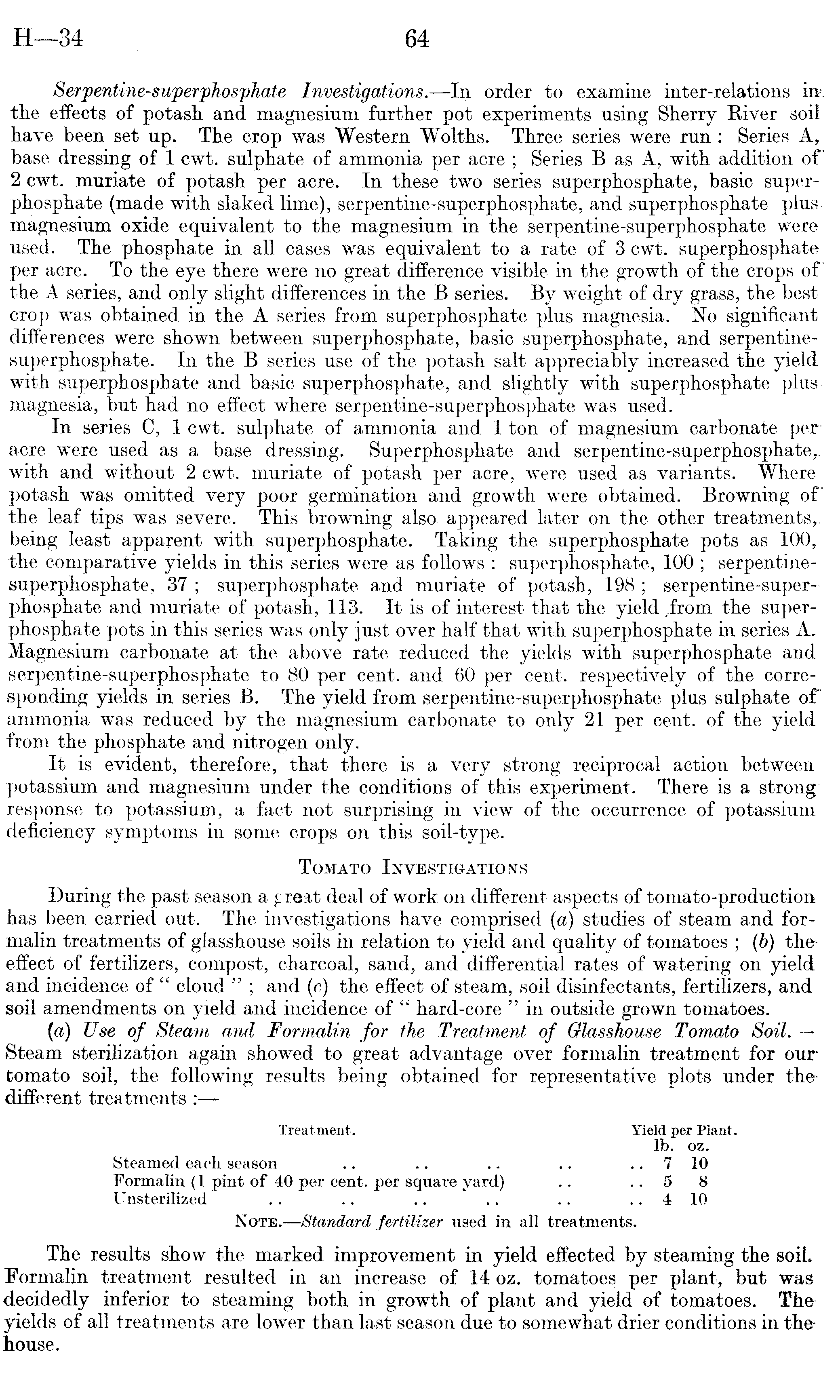 Serpentine-superphosphate Investigations.—ln order to examine inter-relations in the effects of potash, and magnesium further pot experiments using Sherry River soil have been set up. The crop was Western Wolths. Three series were run: Series A, base dressing of 1 cwt. sulphate of ammonia per acre ; Series B as A, with addition of 2 cwt. muriate of potash per acre. In these two series superphosphate, basic superphosphate (made with slaked lime), serpentine-superphosphate, and superphosphate plusmagnesium oxide equivalent to the magnesium in the serpentine-superphosphate were used. The phosphate in all cases was equivalent to a rate of 3 cwt. superphosphate per acre. To the eye there were no great difference visible in the growth of the crops of the A series, and only slight differences in the B series. By weight of dry grass, the best crop was obtained in the A series from superphosphate plus magnesia. No significant differences were shown between superphosphate, basic superphosphate, and serpentinesuperphosphate. In the B series use of the potash salt appreciably increased the yield with superphosphate and basic superphosphate, and slightly with superphosphate plusmagnesia, but had no effect where serpentine-superphosphate was used. In series C, 1 cwt. sulphate of ammonia and 1 ton of magnesium carbonate per acre were used as a base dressing. Superphosphate and serpentine-superphosphate,, with and without 2 cwt. muriate of potash per acre, were used as variants. Where potash was omitted very poor germination and growth were obtained. Browning of the leaf tips was severe. This browning also appeared later on the other treatments,, being least apparent with superphosphate. Taking the superphosphate pots as 100, the comparative yields in this series were as follows : superphosphate, 100 ; serpentinesuperphosphate, 37 ; superphosphate and muriate of potash, 198 ; serpentine-super-phosphate and muriate of potash, 113. It is of interest that the yield .from the superphosphate pots in this series was only just over half that with superphosphate in series A. Magnesium carbonate at the above rate reduced the yields with superphosphate and serpentine-superphosphate to 80 per cent, and 60 per cent, respectively of the corresponding yields in series B. The yield from serpentine-superphosphate plus sulphate of ammonia was reduced by the magnesium carbonate to only 21 per cent, of the yield from the phosphate and nitrogen only. It is evident, therefore, that there is a very strong reciprocal action between potassium and magnesium under the conditions of this experiment. There is a strong; response to potassium, a fact not surprising in view of the occurrence of potassium deficiency symptoms in some crops on this soil-type. Tomato Investigations During the past season a great deal of work on different aspects of tomato-production has been carried out. The investigations have comprised (a) studies of steam and formalin treatments of glasshouse soils in relation to yield and quality of tomatoes ; (b) theeffect of fertilizers, compost, charcoal, sand, and differential rates of watering on yield and incidence of " cloud " ; and (c) the effect of steam, soil disinfectants, fertilizers, and soil amendments on yield and incidence of " hard-core " in outside grown tomatoes. (a) Use of Steam and Formalin for the Treatment of Glasshouse Tomato Soil.— Steam sterilization again showed to great advantage over formalin treatment for our tomato soil, the following results being obtained for representative plots under thedifferent treatments : Treatment. Yield per Plant. lb. oz. Steamed each season .. .. .. .. 7 10 Formalin (1 pint of 40 per cent, per square yard) .. ..58 Unsterilized .. .. .. .. .. .. 4 10 Note.—Standard fertilizer used in all treatments. The results show the marked improvement in yield effected by steaming the soil. Formalin treatment resulted in an increase of 14 oz. tomatoes per plant, but was decidedly inferior to steaming both in growth of plant and yield of tomatoes. The yields of all treatments are lower than last season due to somewhat drier conditions in thehouse.