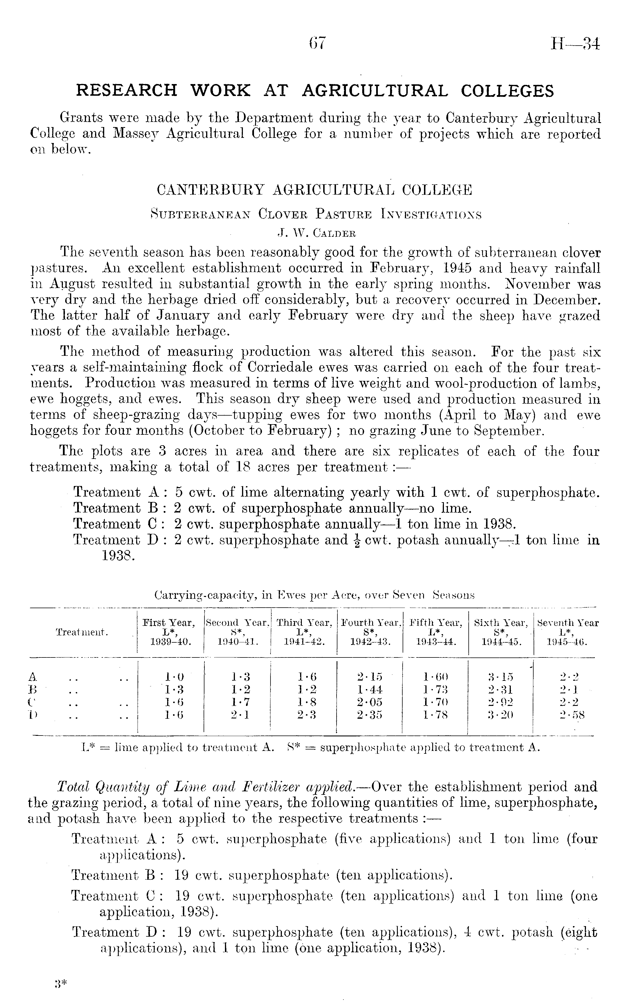 RESEARCH WORK AT AGRICULTURAL COLLEGES Grants were made by the Department during the year to Canterbury Agricultural College and Massey Agricultural College for a number of projects which are reported on below. CANTERBURY AGRICULTURAL COLLEGE Subterranean Clover Pasture Investigations J. W. Calder The seventh season has been reasonably good for the growth of subterranean clover pastures. An excellent establishment occurred in February, 1945 and heavy rainfall in August resulted in substantial growth in the early spring months. November was very dry and the herbage dried off considerably, but a recovery occurred in December. The latter half of January and early February were dry and the sheep have grazed most of the available herbage. The method of measuring production was altered this season. For the past six years a self-maintaining flock of Corriedale ewes was carried on each of the four treatments. Production was measured in terms of live weight and wool-production of lambs, ewe hoggets, and ewes. This season dry sheep were used and production measured in terms of sheep-grazing days —tupping ewes for two months (April to May) and ewe hoggets for four months (October to February) ; no grazing June to September. The plots are 3 acres in area and there are six replicates of each of the four treatments, making a total of 18 acres per treatment: — Treatment A : 5 cwt. of lime alternating yearly with 1 cwt. of superphosphate. Treatment B : 2 cwt. of superphosphate annually—no lime. Treatment C: 2 cwt. superphosphate annually —1 ton lime in 1938. Treatment D : 2 cwt. superphosphate and \ cwt. potash annually—l ton lime in 1938.