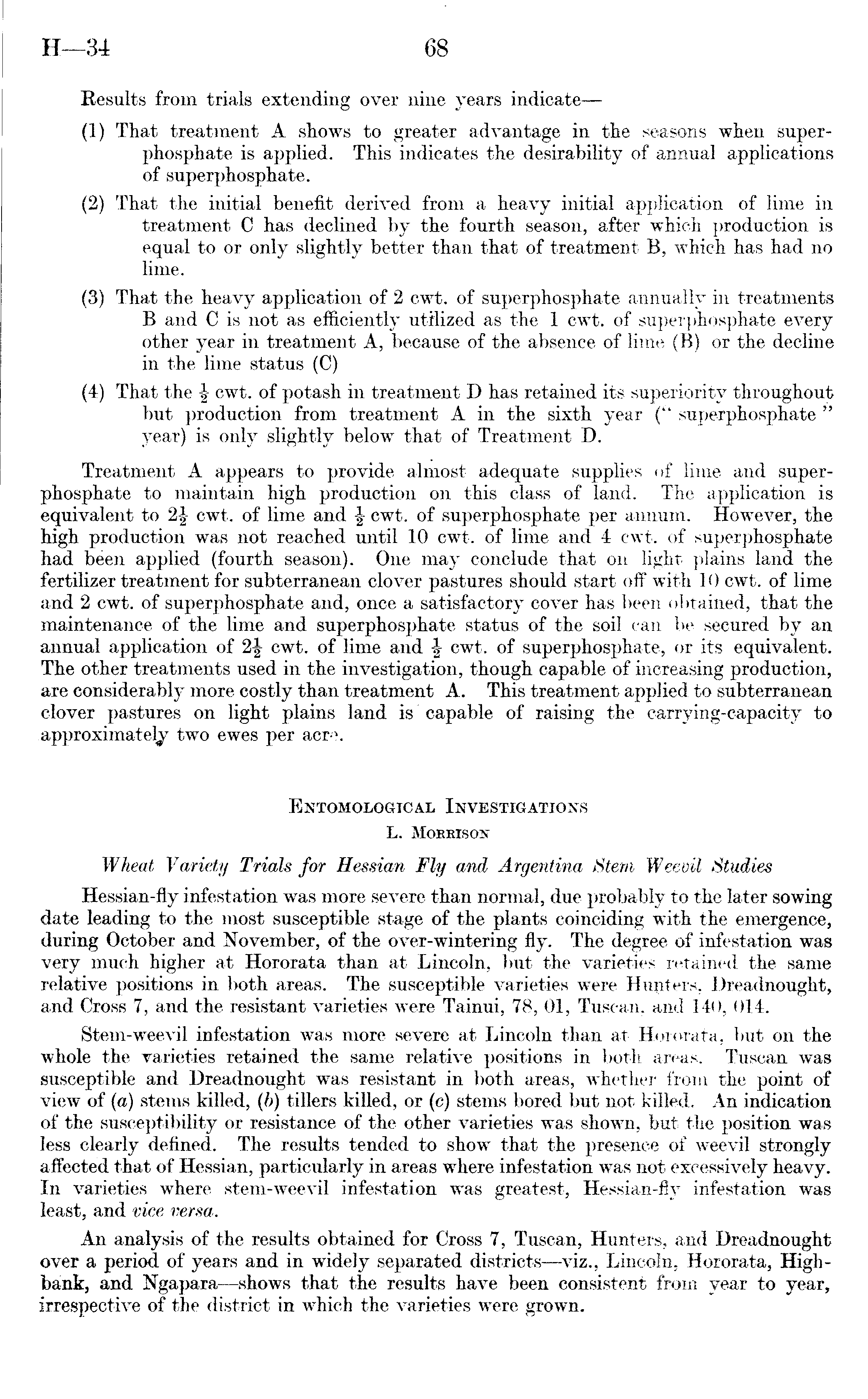 Results from trials extending over nine years indicate—(l) That treatment A shows to greater advantage in the seasons when superphosphate is applied. This indicates the desirability of annual applications of superphosphate. (2) That the initial benefit derived from a heavy initial application of lime in treatment C has declined by the fourth season, after which production is equal to or only slightly better than that of treatment B, which has had no lime. (3) That the heavy application of 2 cwt. of superphosphate annually in treatments B and C is not as efficiently utilized as the 1 cwt. of superphosphate every other year in treatment A, because of the absence of lime (B) or the decline in the lime status (C) (4) That the \ cwt. of potash in treatment D has retained its superiority throughout but production from treatment A in the sixth year (" superphosphate " year) is only slightly below that of Treatment D. Treatment A appears to provide almost adequate supplies of lime and superphosphate to maintain high production on this class of land. The application is equivalent to 1\ cwt. of lime and \ cwt. of superphosphate per annum. However, the high production was not reached until 10 cwt. of lime and 4 cwt. of superphosphate had been applied (fourth season). One may conclude that on light plains land the fertilizer treatment for subterranean clover pastures should start off with 10 cwt. of lime and 2 cwt. of superphosphate and, once a satisfactory cover has been obtained, that the maintenance of the lime and superphosphate status of the soil can be secured by an annual application of cwt. of lime and \ cwt. of superphosphate, or its equivalent. The other treatments used in the investigation, though capable of increasing production, are considerably more costly than treatment A. This treatment applied to subterranean clover pastures on light plains land is ' capable of raising the carrying-capacity to .approximately two ewes per acre. Entomological Investigations L. Morrison Wheat Variety Trials for Hessian Fly and Argentina Stem Weevil Studies Hessian-fly infestation was more severe than normal, due probably to the later sowing date leading to the most susceptible stage of the plants coinciding with the emergence, during October and November, of the over-wintering fly. The degree of infestation was very much higher at Hororata than at Lincoln, but the varieties retained the same relative positions in both areas. The susceptible varieties were Hunters. Dreadnought, and Cross 7, and the resistant varieties were Tainui, 78, 01, Tuscan, and 140, 014. Stem-weevil infestation was more severe at Lincoln than at Hororata, but on the whole the varieties retained the same relative positions in both areas. Tuscan was susceptible and Dreadnought was resistant in both areas, whether from the point of view of (a) stems killed, (b) tillers killed, or (c) stems bored but not killed. An indication of the susceptibility or resistance of the other varieties was shown, but the position was less clearly defined. The results tended to show that the presence of weevil strongly affected that of Hessian, particularly in areas where infestation was not excessively heavy. In varieties where stem-weevil infestation was greatest, Hessian-fly infestation was least, and vice versa. An analysis of the results obtained for Cross 7, Tuscan, Hunters, and Dreadnought over a period of years and in widely separated districts —viz., Lincoln, Hororata, Highbank, and Ngapara—shows that the results have been consistent from year to year, irrespective of the district in which the varieties were grown.