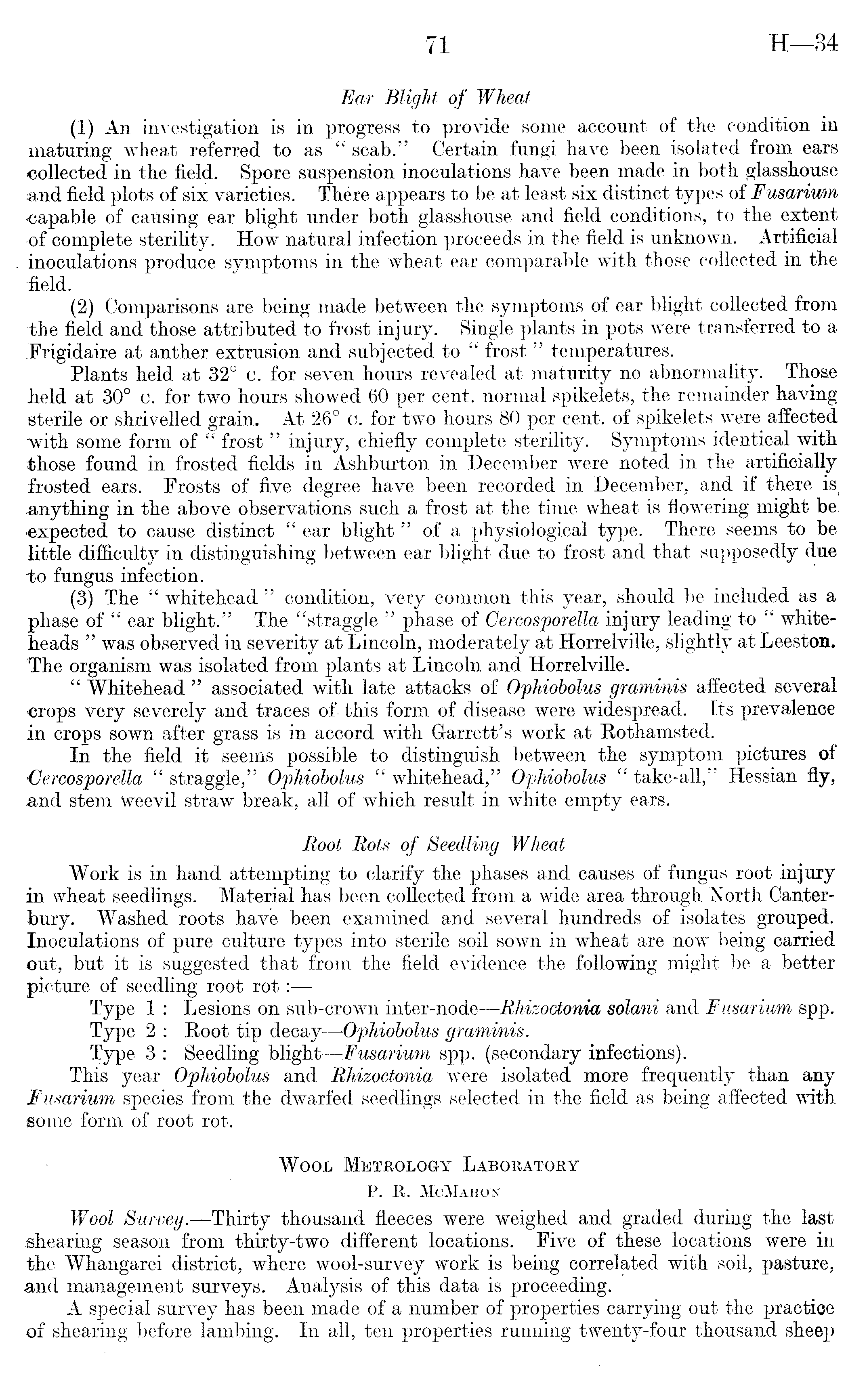 Ear Blight of Wheat (1) An investigation is in progress to provide some account of the condition in maturing wheat referred to as " scab." Certain fungi have been isolated from ears collected in the field. Spore suspension inoculations have been made in both glasshouse and field plots of six varieties. There appears to be at least six distinct types of Fusarium •capable of causing ear blight under both glasshouse and field conditions, to the extent of complete sterility. How natural infection proceeds in the field is unknown. Artificial inoculations produce symptoms in the wheat ear comparable with those collected in the fleld. (2) Comparisons are being made between the symptoms of ear blight collected from the field and those attributed to frost injury. Single plants in pots were transferred to a Frigidaire at anther extrusion and subjected to " frost " temperatures. Plants held at 32° c. for seven hours revealed at maturity no abnormality. Those held at 30° c. for two hours showed 60 per cent, normal spikelets, the remainder having sterile or shrivelled grain. At 26° c. for two hours 80 per cent, of spikelets were affected with some form of " frost " injury, chiefly complete sterility. Symptoms identical with those found in frosted fields in Ashburton in December were noted in the artificially frosted ears. Frosts of five degree have been recorded in December, and if there is i anything in the above observations such a frost at the time wheat is flowering might be. ■expected to cause distinct " ear blight " of a physiological type. There seems to be little difficulty in distinguishing between ear blight due to frost and that supposedly due to fungus infection. (3) The " whitehead " condition, very common this year, should be included as a phase of " ear blight." The "straggle " phase of Cercosporella injury leading to " whiteheads " was observed in severity at Lincoln, moderately at Horrelville, slightly at Leeston. The organism was isolated from plants at Lincoln and Horrelville. " Whitehead " associated with late attacks of Ophiobolus graminis affected several ■crops very severely and traces of. this form of disease were widespread. Its prevalence in crops sown after grass is in accord with Garrett's work at Rothamsted. In the field it seems possible to distinguish between the symptom pictures of ■Cercosporella " straggle," Ophiobolus " whitehead," Ophiobolus " take-all," Hessian fly, and stem weevil straw break, all of which result in white empty ears. Root Rots of Seedling Wheat Work is in hand attempting to clarify the phases and causes of fungus root injury in wheat seedlings. Material has been collected from a wide area through North Canterbury. Washed roots have been examined and several hundreds of isolates grouped. Inoculations of pure culture types into sterile soil sown in wheat are now being carried out, but it is suggested that from the field evidence the following might be a better picture of seedling root rot: — Type 1 : Lesions on sub-crown inter-node —Rhizoctonia solani and Fusarium spp. Type 2 : Root tip decay —Ophiobolus graminis. Type 3 : Seedling blight—Fusarium spp. (secondary infections). This year Ophiobolus and Rhizoctonia were isolated more frequently than any Fusarium species from the dwarfed seedlings selected in the field as being affected with some form of root rot. Wool Metrology Laboratory p. R. McMahon Wool Survey.—Thirty thousand fleeces were weighed and graded during the last shearing season from thirty-two different locations. Five of these locations were in the Whangarei district, where wool-survey work is being correlated with soil, pasture, and management surveys. Analysis of this data is proceeding. A special survey has been made of a number of properties carrying out the practice of shearing before lambing. In all, ten properties running twenty-four thousand sheep