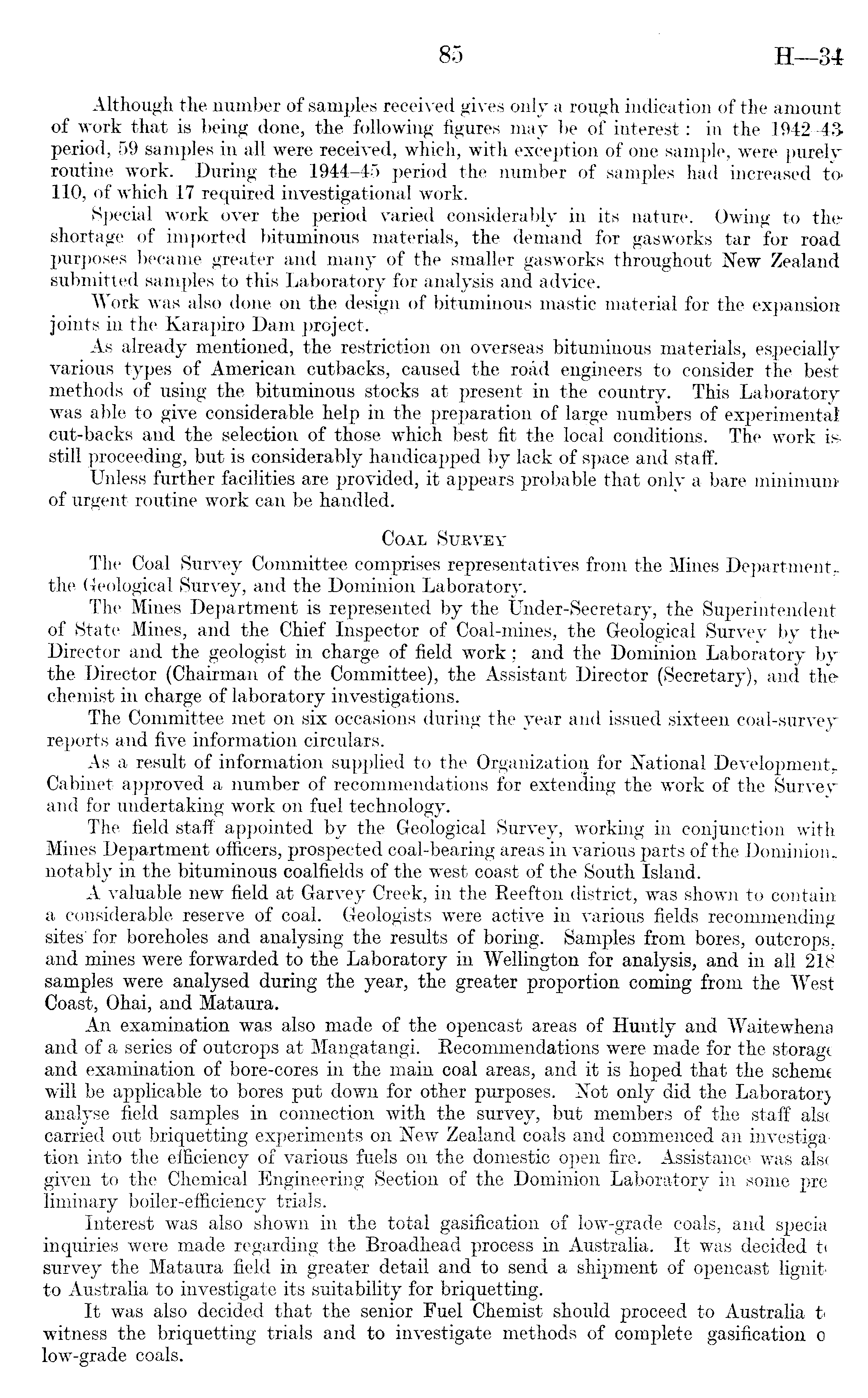 Although the number of samples received gives only a rough indication of the amount of work that is being done, the following figures may be of interest : in the 1942-43. period, 59 samples in all were received, which, with exception of one sample, were purely routine work. During the 1944-45 period the number of samples had increased to--110, of which 17 required investigational work. Special work over the period varied considerably in its nature. Owing to the shortage of imported bituminous materials, the demand for gasworks tar for road purposes became greater and many of the smaller gasworks throughout New Zealand submitted samples to this Laboratory for analysis and advice. Work was also done on the design of bituminous mastic material for the expansion joints in the Karapiro Dam project. As already mentioned, the restriction on overseas bituminous materials, especially various types of American cutbacks, caused the road engineers to consider the best methods of using the bituminous stocks at present in the country. This Laboratory was able to give considerable help in the preparation of large numbers of experimental cut-backs and the selection of those which best fit the local conditions. The work isstill proceeding, but is considerably handicapped by lack of space and staff. Unless further facilities are provided, it appears probable that only a bare minimum of urgent routine work can be handled. Coal Survey The Coal Survey Committee comprises representatives from the Mines Department,, the Geological Survey, and the Dominion Laboratory. The Mines Department is represented by the Under-Secretary, the Superintendent of State Mines, and the Chief Inspector of Coal-mines, the Geological Survey by the Director and the geologist in charge of field work; and the Dominion Laboratory by the Director (Chairman of the Committee), the Assistant Director (Secretary), and the chemist in charge of laboratory investigations. The Committee met on six occasions during the year and issued sixteen coal-survey reports and five information circulars. As a result of information supplied to the Organization for National Development,. Cabinet approved a number of recommendations for extending the work of the Survey and for undertaking work on fuel technology. The field staff appointed by the Geological Survey, working in conjunction with Mines Department officers, prospected coal-bearing areas in various parts of the Dominion. notably in the bituminous coalfields of the west coast of the South Island. A valuable new field at Garvey Creek, in the Eeefton district, was shown to contain a considerable reserve of coal. Geologists were active in various fields recommending sites' for boreholes and analysing the results of boring. Samples from bores, outcrops, and mines were forwarded to the Laboratory in Wellington for analysis, and in all 218 samples were analysed during the year, the greater proportion coming from the West Coast, Ohai, and Mataura. An examination was also made of the opencast areas of Huntly and Waitewhena and of a series of outcrops at Mangatangi. Recommendations were made for the storage and examination of bore-cores in the main coal areas, and it is hoped that the scheme will be applicable to bores put down for other purposes. Not only did the Laboratory analyse field samples in connection with the survey, but members of the staff alsc carried out briquetting experiments on New Zealand coals and commenced an investiga tion into the efficiency of various fuels on the domestic open fire. Assistance was als< given to the Chemical Engineering Section of the Dominion Laboratory in some pre liminary boiler-efficiency trials. Interest was also shown in the total gasification of low-grade coals, and specia inquiries were made regarding the Broadhead process in Australia. It was decided t< survey the Mataura field in greater detail and to send a shipment of opencast lignit to Australia to investigate its suitability for briquetting. It was also decided that the senior Fuel Chemist should proceed to Australia t witness the briquetting trials and to investigate methods of complete gasification o low-grade coals.