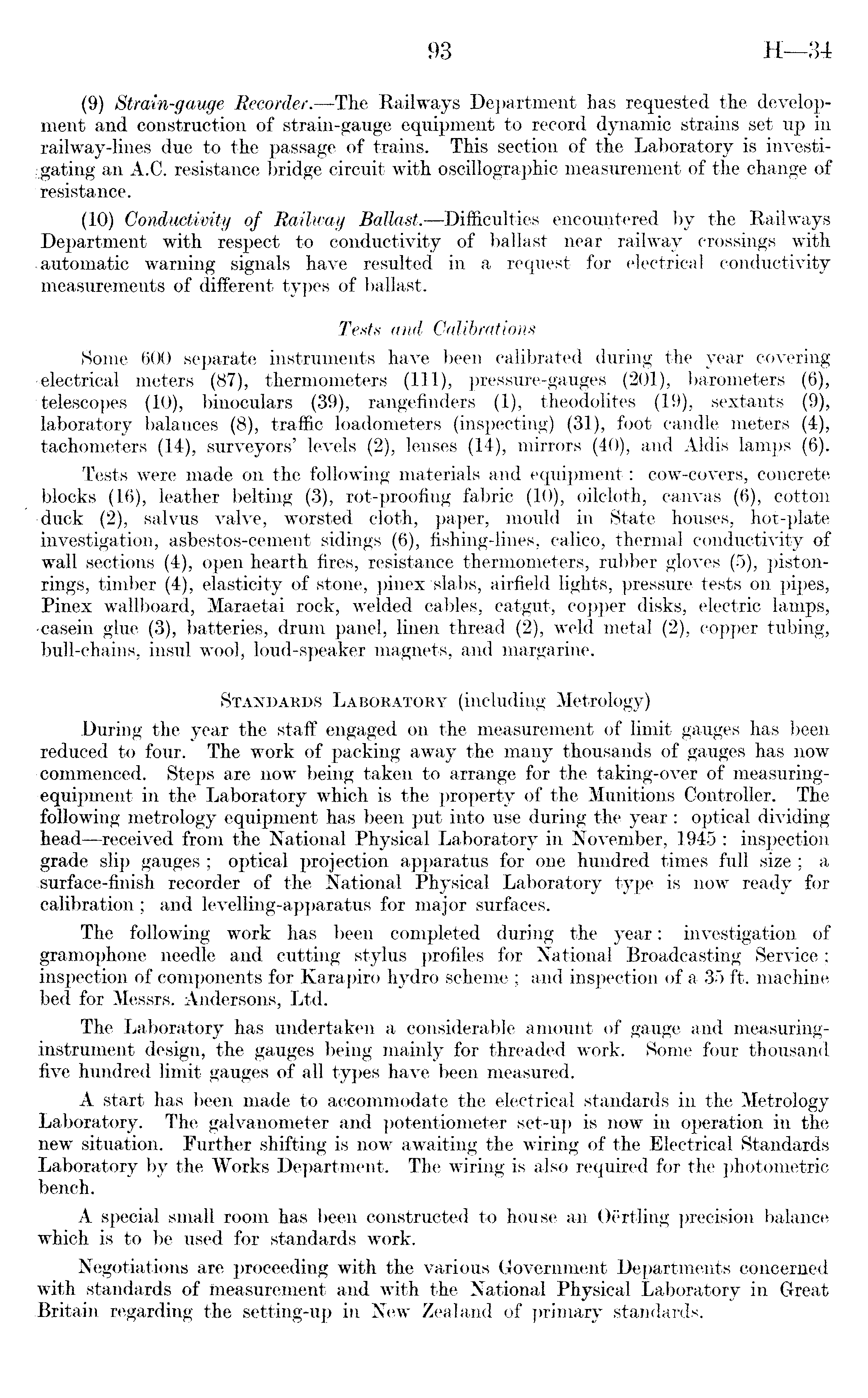 (9) Strain-gauge Recorder.—The Eailways Department has requested the development and construction of strain-gauge equipment to record dynamic strains set up in railway-lines due to the passage of trains. This section of the Laboratory is investigating an A.C. resistance bridge circuit with oscillographic measurement of the change of resistance. (10) Conductivity of Railway Ballast. —Difficulties encountered by the Eailways Department with respect to conductivity of ballast near railway crossings with .automatic warning signals have resulted in a request for electrical conductivity measurements of different types of ballast. Tests and Calibrations Some 600 separate instruments have been calibrated during the year covering electrical meters (87), thermometers (111), pressure-gauges (201), barometers (6), telescopes (10), binoculars (39), rangefmders (1), theodolites (19), sextants (9), laboratory balances (8), traffic loadometers (inspecting) (31), foot candle meters (4), tachometers (14), surveyors' levels (2), lenses (14), mirrors (40), and Aldis lamps (6). Tests were made on the following materials and equipment: cow-covers, concrete blocks (16), leather belting (3), rot-proofing fabric (10), oilcloth, canvas (6), cotton duck (2), salvus valve, worsted cloth, paper, mould in State houses, hot-plate investigation, asbestos-cement sidings (6), fishing-lines, calico, thermal conductivity of wall sections (4), open hearth fires, resistance thermometers, rubber gloves (5), pistonrings, timber (4), elasticity of stone, pinex slabs, airfield lights, pressure tests on pipes, Pinex wallboard, Maraetai rock, welded cables, catgut, copper disks, electric lamps, ■casein glue (3), batteries, drum panel, linen thread (2), weld metal (2), copper tubing, bull-chains, insul wool, loud-speaker magnets, and margarine. Standards Laboratory (including Metrology) During the year the staff engaged on the measurement of limit gauges has been reduced to four. The work of packing away the many thousands of gauges has now commenced. Steps are now being taken to arrange for the taking-over of measuringequipment in the Laboratory which is the property of the Munitions Controller. The following metrology equipment has been put into use during the year : optical dividing head —received from the National Physical Laboratory in November, 1945 : inspection grade slip gauges ; optical projection apparatus for one hundred times full size ; a surface-finish recorder of the National Physical Laboratory type is now ready for calibration ; and leveiling-apparatus for major surfaces. The following work has been completed during the year: investigation of gramophone needle and cutting stylus profiles for National Broadcasting Service; inspection of components for Karapiro hydro scheme ; and inspection of a 35 ft. machine bed for Messrs. Andersons, Ltd. The Laboratory has undertaken a considerable amount of gauge and measuringinstrument design, the gauges being mainly for threaded work. Some four thousand five hundred limit gauges of all types have been measured. A start has been made to accommodate the electrical standards in the Metrology Laboratory. The galvanometer and potentiometer set-up is now in operation in the new situation. Further shifting is now awaiting the wiring of the Electrical Standards Laboratory by the Works Department. The wiring is also required for the photometric bench. A special small room has been constructed to house an Oertling precision balance which is to be used for standards work. Negotiations are proceeding with the various Government Departments concerned with standards of measurement and with the National Physical Laboratory in Great Britain regarding the setting-up in New Zealand of primary standards.