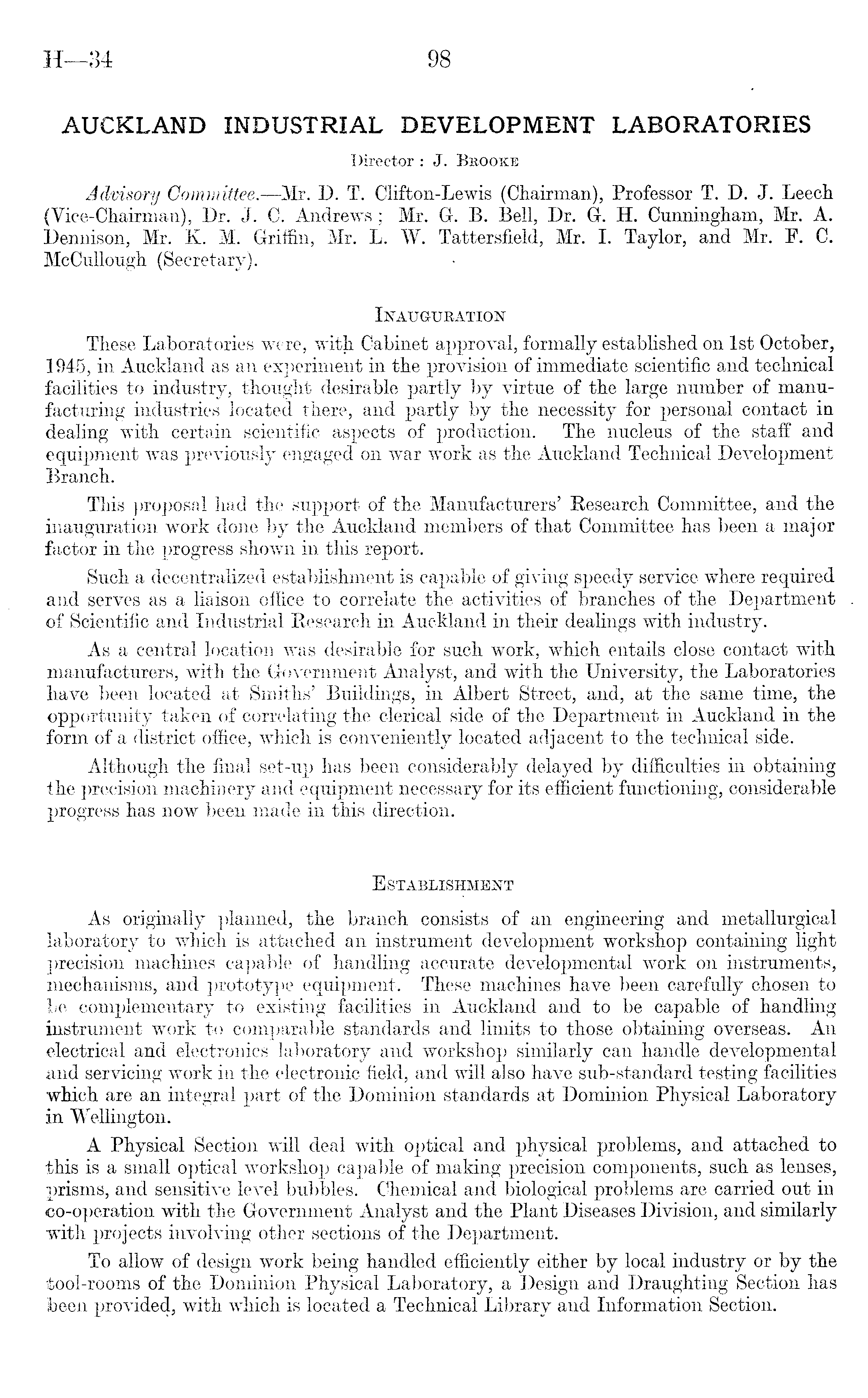 AUCKLAND INDUSTRIAL DEVELOPMENT LABORATORIES Director : J. Brooke Advisory Committee. —Mr. D. T. Clifton-Lewis (Chairman), Professor T. D. J. Leech (Vice-Chairnian), Dr. J. C. Andrews ; Mr. G. B. Bell, Dr. G. H. Cunningham, Mr. A. Dennison, Mr. K. M. Griffin, Mr. L. W. Tattersfield, Mr. I. Taylor, and Mr. P. C. McCullough (Secretary). Inauguration These Laboratories were, with Cabinet approval, formally established on Ist October, 1945, in Auckland as an experiment in the provision of immediate scientific and technical facilities to industry, thought desirable partly by virtue of the large number of manufacturing industries located there, and partly by the necessity for personal contact in dealing with certain scientific aspects of production. The nucleus of the staff and equipment was previously engaged on war work as the Auckland Technical Development Branch. This proposal had the support of the Manufacturers' Eesearch Committee, and the inauguration work done by the Auckland members of that Committee has been a major factor in the progress shown in this report. Such a decentralized establishment is capable of giving speedy service where required and serves as a liaison office to correlate the activities of branches of the Department of Scientific and Industrial Research in Auckland in their dealings with industry. As a central location was desirable for such work, which entails close contact with manufacturers, with the Government Analyst, and with the University, the Laboratories have been located at Smiths' Buildings, in Albert Street, and, at the same time, the opportunity taken of correlating the clerical side of the Department in Auckland in the form of a district office, which is conveniently located adjacent to the technical side. Although the final set-up has been considerably delayed by difficulties in obtaining the precision machinery and equipment necessary for its efficient functioning, considerable progress has now been made in this direction. Establishment As originally planned, the branch consists of an engineering and metallurgical laboratory to which is attached an instrument development workshop containing light precision machines capable of handling accurate developmental work on instruments, mechanisms, and prototype equipment. These machines have been carefully chosen to be complementary to existing facilities in Auckland and to be capable of handling instrument work to comparable standards and limits to those obtaining overseas. An electrical and electronics laboratory and workshop similarly can handle developmental and servicing work in the electronic field, and will also have sub-standard testing facilities which are an integral part of the Dominion standards at Dominion Physical Laboratory in Wellington. A Physical Section will deal with optical and physical problems, and attached to this is a small optical workshop capable of making precision components, such as lenses, prisms, and sensitive level bubbles. Chemical and biological problems are carried out in co-operation with the Government Analyst and the Plant Diseases Division, and similarly with projects involving other sections of the Department. To allow of design work being handled efficiently either by local industry or by the tool-rooms of the Dominion Physical Laboratory, a Design and Draughting Section has been provided, with which is located a Technical Library and Information Section.
