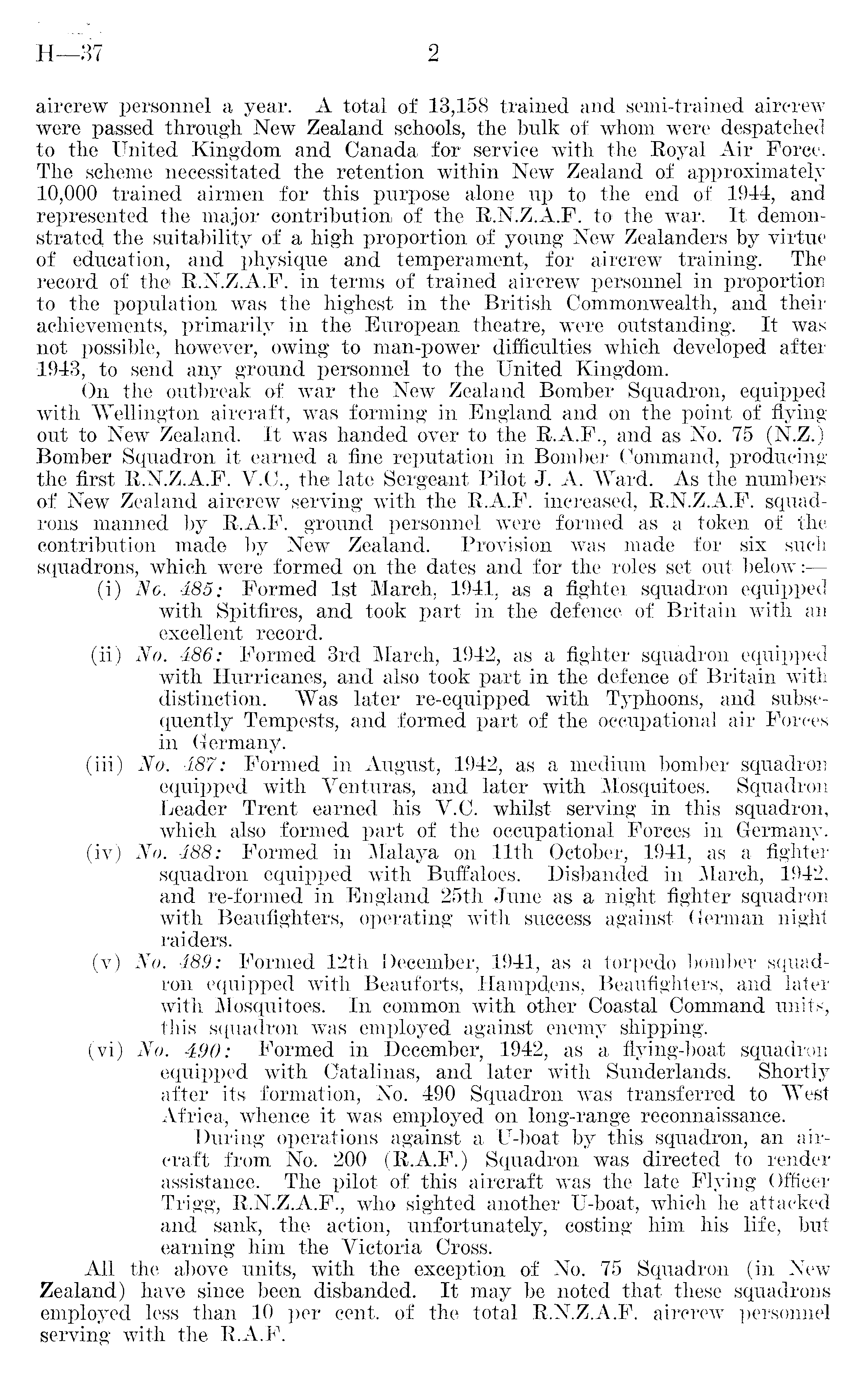 aircrew personnel a year. A total of 13,158 trained and semi-trained aircrew were passed through. New Zealand schools, the bulk of whom were despatched to the United Kingdom and Canada for service with the Royal Air Force. The scheme necessitated the retention within New Zealand of approximately 10,000 trained airmen for this purpose alone up to the end of 1944, and represented the major contribution, of the R.N.Z.A.F. to the war. It demonstrated the suitability of a high proportion of young New Zealanders by virtue of education, and physique and temperament, for aircrew training. The record of the R.N.Z.A.F. in terms of trained aircrew personnel in proportion to the population was the highest in the British Commonwealth, and their achievements, primarily in the European theatre, were outstanding. It was not possible, however, owing to man-power difficulties which developed after 1943, to send any ground personnel to the United Kingdom. On the outbreak of war the New Zealand Bomber Squadron, equipped with "Wellington aircraft, was forming in England and on the point of flying out to New Zealand. It was handed over to the R.A.F., and as No. 75 (N.Z.) Bomber Squadron it earned a fine reputation in Bomber Command, producing the first R.N.Z.A.F. Y.C., the late Sergeant Pilot J. A. Ward. As the numbers of New Zealand aircrew serving with the R.A.F. increased, R.N.Z.A.F. squadrons manned by R.A.F. ground personnel were formed as a token of the contribution made by New Zealand. Provision was made for six such squadrons, which were formed on the dates and for the roles set out below: — (i) No. 485: Formed Ist March, 1941, as a fighter squadron equipped with Spitfires, and took part in the defence of Britain with an excellent record. (ii) No. 486: Formed 3rd March, 1942, as a fighter squadron equipped with Hurricanes, and also took part in the defence of Britain with distinction. Was later re-equipped with Typhoons, and subsequently Tempests, and formed part of the occupational air Forces in Germany. (iii) No. 487: Formed in August, 1942, as a medium bomber squadron equipped with Venturas, and later with Mosquitoes. Squadron Leader Trent earned his Y.C. whilst serving in this squadron, which also formed part of the occupational Forces in Germany. (iv) No. 488: Formed in Malaya on 11th October, 1941, as a fighter squadron equipped with Buffaloes. Disbanded in March, 1942, and re-formed in England 25th June as a night fighter squadron with Beaufighters, operating with success against German night raiders. (v) No. 489: Formed 12th December, 1941, as a torpedo bomber squadron equipped with Beauforts, Hampdens, Beaufighters, and later with Mosquitoes. In common with other Coastal Command units, this squadron was employed against enemy shipping. (vi) No. 490: Formed in December, 1942, as a flying-boat squadron equipped with Catalinas, and later with Sunderlands. Shortly after its formation, No. 490 Squadron was transferred to West Africa, whence it was employed on long-range reconnaissance. During operations against a U-boat by this squadron, an aircraft from No. 200 (R.A.F.) Squadron was directed to render assistance. The pilot of this aircraft was the late Flying Officer Trigg, R.N.Z.A.F., who sighted another U-boat, which he attacked and sank, the action, unfortunately, costing him his life, but earning him the Victoria Cross. All the above units, with the exception of No. 75 Squadron (in New Zealand) have since been disbanded. It may be noted that these squadrons employed less than 10 per cent, of the total R.N.Z.A.F. aircrew personnel serving with the R.A.F.