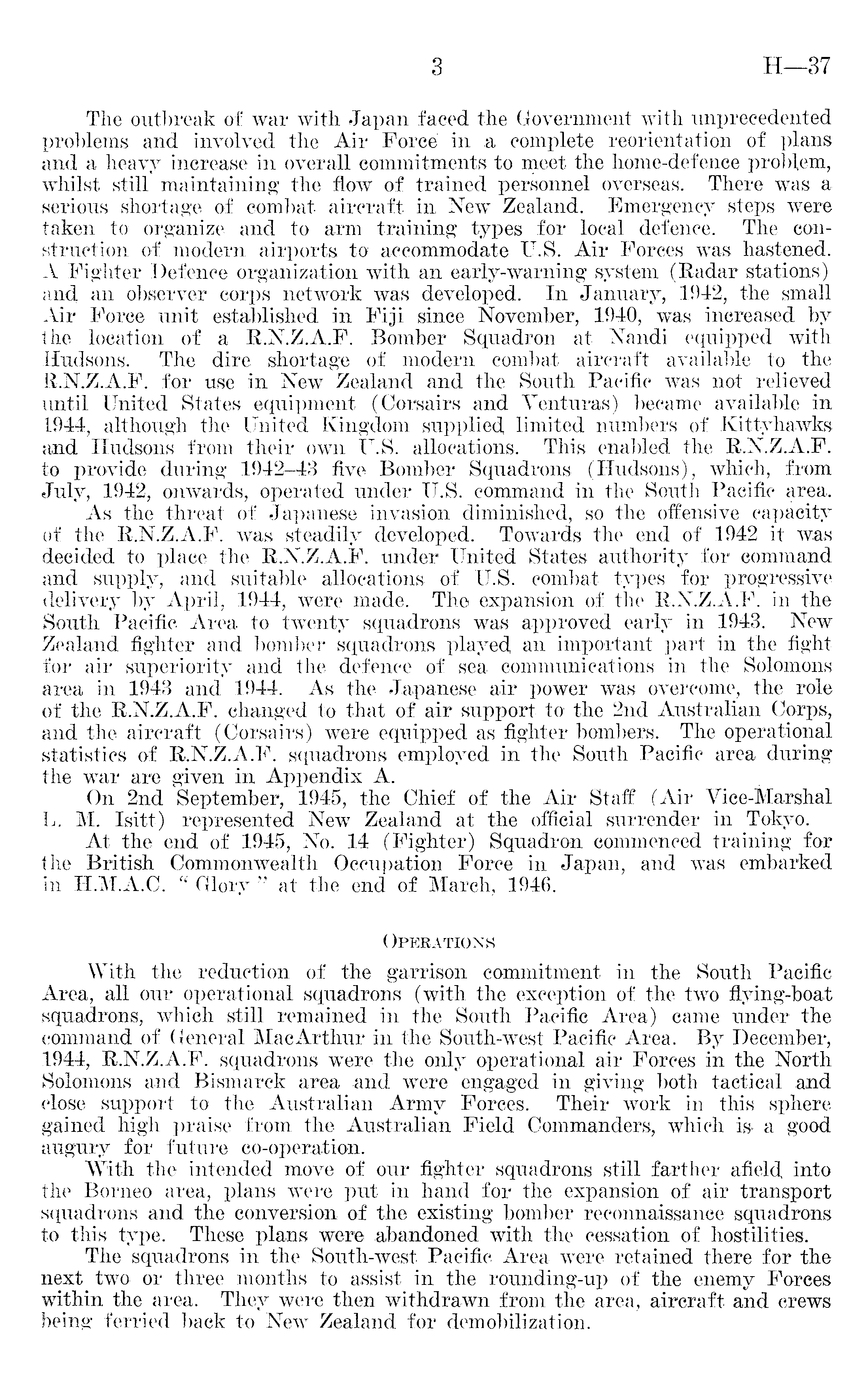 The outbreak of war with. Japan faced the Government with unprecedented problems and involved the Air Force in a complete reorientation of plans and a heavy increase in overall commitments to meet the home-defence problem, whilst still maintaining the flow of trained personnel overseas. There was a serious shortage of combat aircraft in New Zealand. Emergency steps were taken to organize and to arm training types for local defence. The construction of modern airports to accommodate U.S. Air Forces was hastened. A Fighter Defence organization with an early-warning system (Radar stations) and, an observer corps network was developed. In January, 1942, the small Air Force unit established in Fiji since November, 1940, was increased by the location of a R.N.Z.A.F. Bomber Squadron at Nandi equipped with Hudsons. The dire shortage of modern combat aircraft available to the R.N.Z.A.F. for use in New Zealand and the South Pacific was not relieved until United States equipment (Corsairs and Venturas) became available in 1944, although the United Kingdom supplied, limited numbers of Kittyhawks and Hudsons from their own U.S. allocations. This enabled the R.N.Z.A.F. to provide during 1942-43 five Bomber Squadrons (Hudsons), which, from July, 1942, onwards, operated under U.S. command in the South Pacific area. As the threat of Japanese invasion diminished, so the offensive capacity of the R.N.Z.A.F. was steadily developed. Towards the end of 1942 it was decided to place the R.N.Z.A.F. under United States authority for command and supply, and suitable allocations of U.S. combat types for progressive delivery by April, 1944, were made. The expansion of the R.N.Z.A.F. in the South Pacific Area to twenty squadrons was approved early in 1943. New Zealand fighter and bomber squadrons played, an important part in the fight for air superiority and the defence of sea communications in the Solomons area in 1943 and 1944. As the Japanese air power was overcome, the role of the R.N.Z.A.F. changed to that of air support to the 2nd Australian Corps, and the aircraft (Corsairs) were equipped as fighter bombers. The operational statistics of R.N.Z.A.F. squadrons employed in the South Pacific area during the war are given in Appendix A. On 2nd September, 1945, the Chief of the Air Staff (Air Vice-Marshal L. M. Isitt) represented New Zealand at the official surrender in Tokyo. At the end of 1945, No. 14 (Fighter) Squadron commenced training for the British Commonwealth Occupation Force in Japan, and was embarked in H.M.A.C. " Glory " at the end of March, 1946. Operations With the reduction of the garrison commitment in the South Pacific Area, all our operational squadrons (with the exception of the two flying-boat squadrons, which still remained in the South Pacific Area) came under the command of General Mac Arthur in the South-west Pacific Area. By December, 1944, R.N.Z.A.F. squadrons were the only operational air Forces in the North Solomons and Bismarck area and were engaged in giving both tactical and close support to the Australian Army Forces. Their work in this sphere gained high praise from the Australian Field Commanders, which is- a good augury for future co-operation. With the intended move of our figliter squadrons still farther afield, into the Borneo area, plans were put in hand for the expansion of air transport squadrons and the conversion of the existing bomber reconnaissance squadrons to this type. These plans were abandoned with the cessation of hostilities. The squadrons in the South-west Pacific Area were retained there for the next two or three months to assist in the rounding-up of the enemy Forces within the area. They were then withdrawn from the area, aircraft and crews being ferried back to New Zealand for demobilization.
