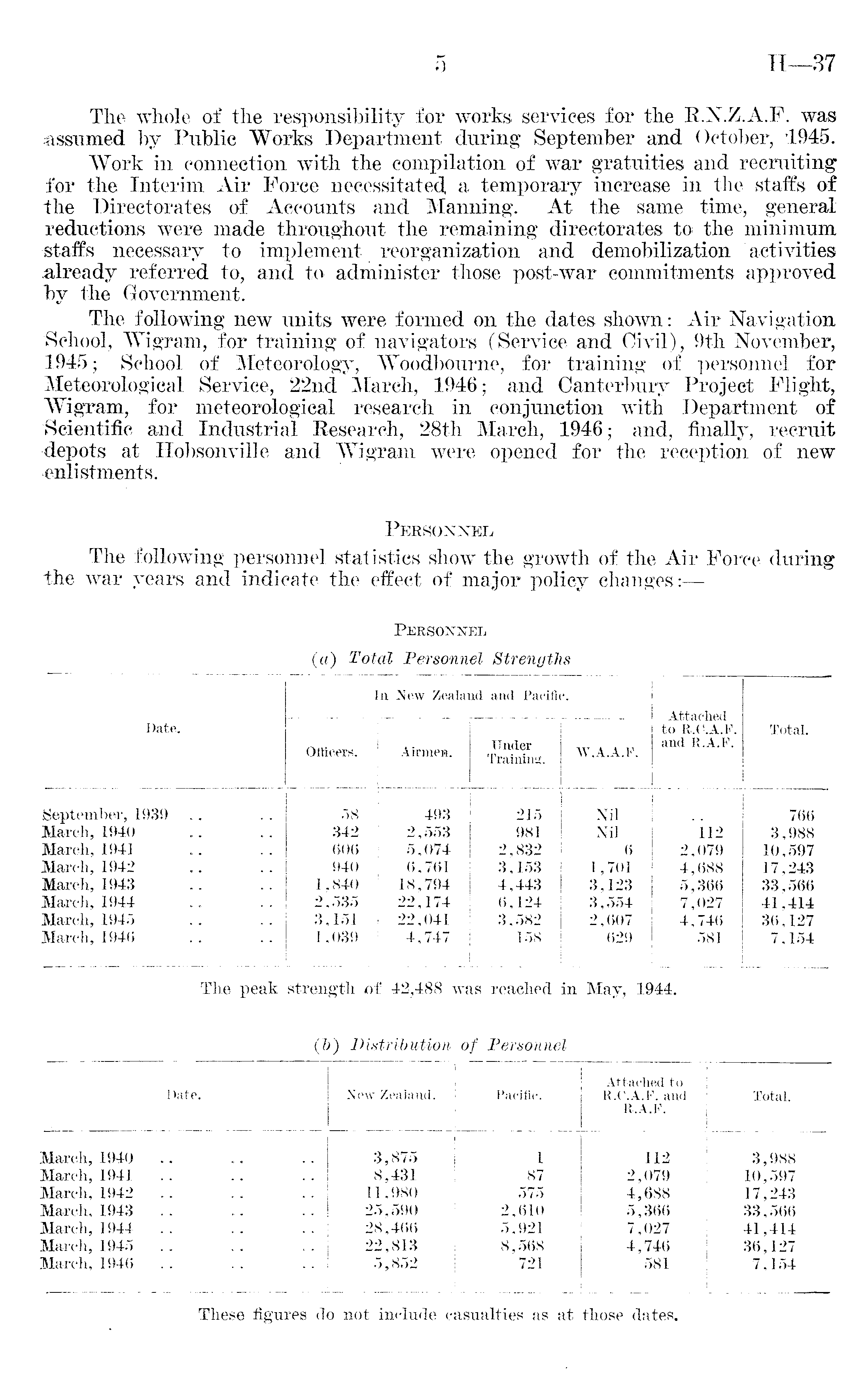 Date. Officers. n New Zealai Airmen. id and Pacifli Under Training. W.A.A.F. Attached to R.C.A.F. and R.A.F. Total. September, 1939 58 493 215 Nil 766 March, 1940 342 2,553 981 Nil ii2 3,988 March, 1941 606 5,074 2,832 6 2,079 10,597 March, 1942 940 6,761 3,153 1,701 4,688 17,243 March, 1943 1,840 18,794 4,443 3,123 5,366 33,566 March, 1944 2,535 22,174 6,124 3,554 7,027 41,414 March, 1945 3,151 22,041 3,582 2,607 4,746 36,127 March, 1946 1,039 4,747 158 629 581 7,154 The peak strength of 42,488 was reached in May, 1944.