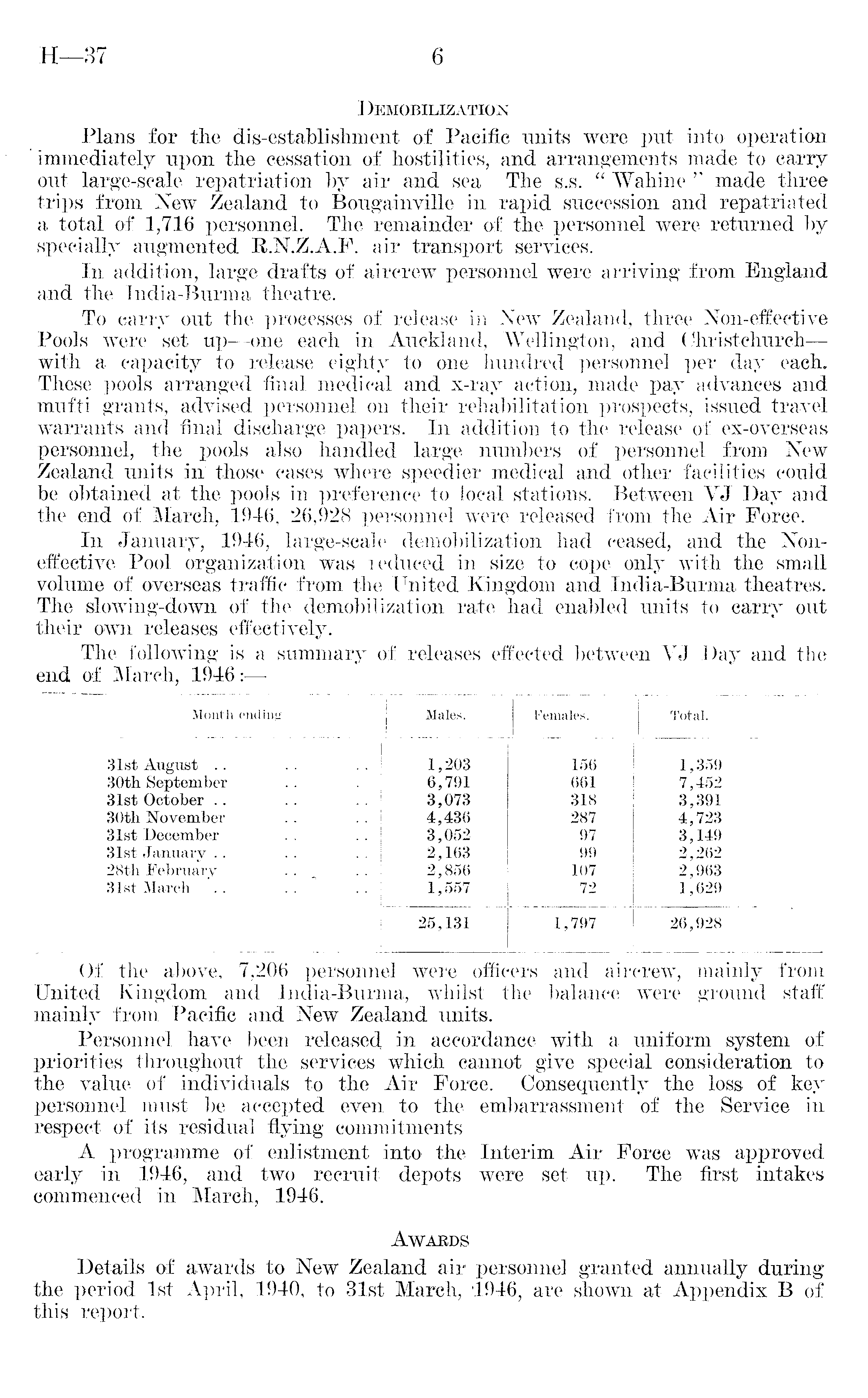 Plans for the dis-establishment of Pacific units were put into operation immediately upon the cessation of hostilities, and arrangements made to carry out large-scale repatriation by air and sea The s.s. " Wahine " made three trips from New Zealand to Bougainville in rapid succession and repatriated a total of 1,716 personnel. The remainder of the personnel were returned by specially augmented R.N.Z.A.F. air transport services. In addition, large drafts of aircrew personnel were arriving from England and the India-Burma theatre. To carry out the processes of release in New Zealand, three Non-effective Pools were set up—one each in Auckland, Wellington, and Christchurch—with a capacity to release eighty to one hundred personnel per day each. These pools arranged final medical and x-ray action, made pay advances and mufti grants, advised personnel on their rehabilitation prospects, issued travel warrants and final discharge papers. In addition to the release of ex-overseas personnel, the pools also handled large numbers of personnel from New Zealand units in those cases where speedier medical and other facilities could be obtained at the pools in preference to local stations. Between VJ Day and the end of March, 1946, 26,928 personnel were released from the Air Force. In January, 1946, large-scale demobilization had ceased, and the Noneffective Pool organization was reduced in size to cope only with the small volume of overseas traffic from the United Kingdom and India-Burma theatres. The slowing-down v of the demobilization rate had enabled units to carry out their own releases The following is a. summary of releases effected between VJ Day and the end of March, 1946: