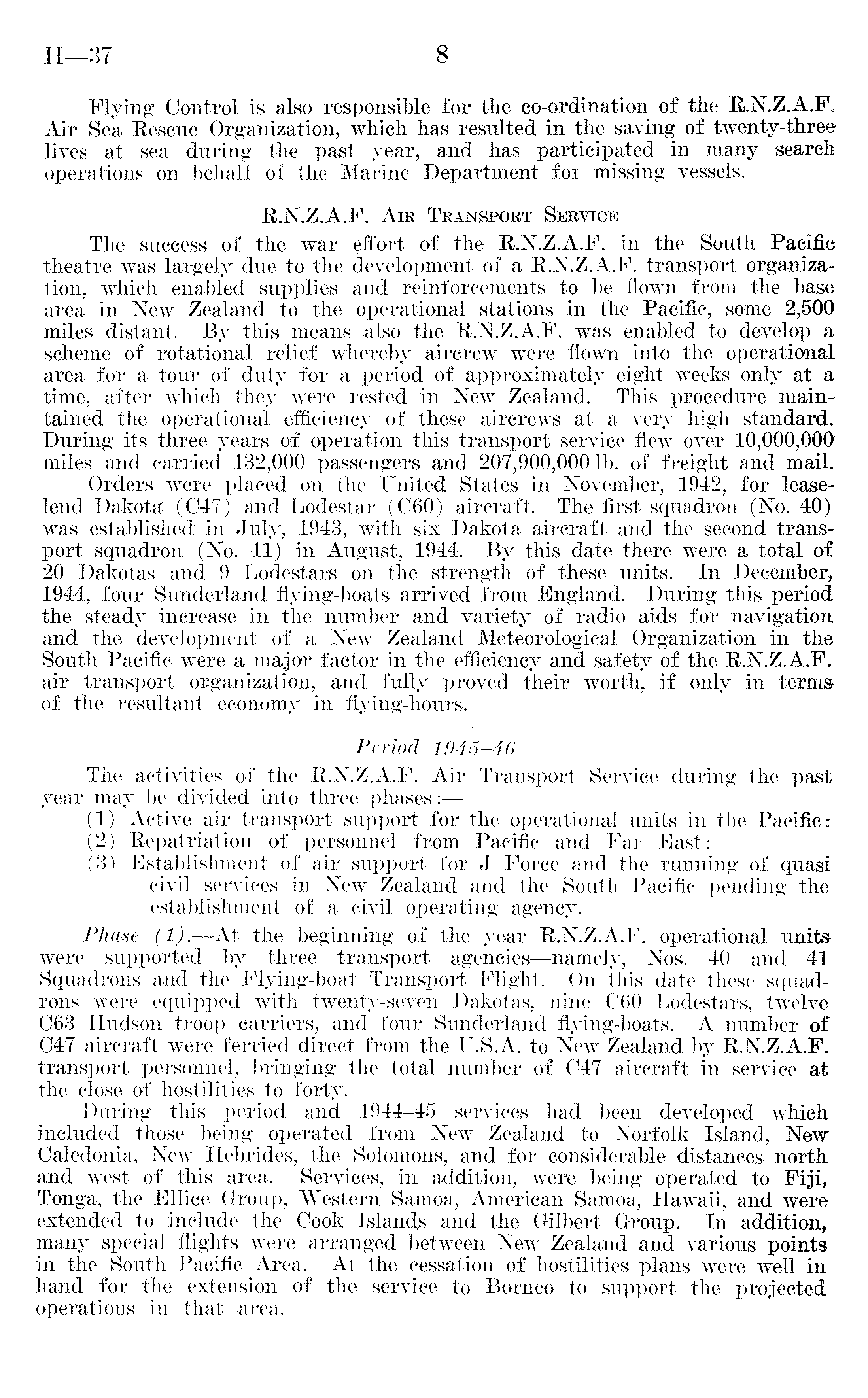 Flying Control is also responsible for the co-ordination of the R.N.Z.A.F, Air Sea Rescue Organization, which has resulted in the saying of twenty-three lives at sea during the past year, and has participated in many search operations on behalf of the Marine Department foi missing vessels. R.N.Z.A.F. Air Transport Service The success of the war effort of the R.N.Z.A.F. in the South Pacific theatre was largely due to the development of a R.N.Z.A.F. transport organization, which enabled supplies and reinforcements to be flown from the base area in New Zealand to the operational stations in the Pacific, some 2,500 miles distant. By this means also the R.N.Z.A.F. was enabled to develop a scheme of rotational relief whereby aircrew were flown into the operational area for a tour of duty for a period of approximately eight weeks only at a time, after which they were rested in New Zealand. This procedure maintained the operational efficiency of these aircrews at a very high standard. During its three years of operation this transport service flew over 10,000,000 miles and carried 132,000 passengers and 207,900,0001b. of freight and mail. Orders were placed on the United States in November, 1942, for leaselend Dakota (C 47) and Lodestar (C6O) aircraft. The first squadron (No. 40) was established in July, 1943, with six Dakota aircraft and the second transport squadron (No. 41) in August, 1944. By this date there were a total of 20 Dakotas and 9 Lodestars on the strength of these units. In December, 1944, four Sunderland flying-boats arrived from England. During this period the steady increase in the number and variety of radio aids for navigation and the development of a New Zealand Meteorological Organization in the South Pacific were a major factor in the efficiency and safety of the R.N.Z.A.F. air transport organization, and fully proved their worth, if only in terms of the resultant economy in flying-hours. Period 1945-46 The activities of the R.N.Z.A.F. Air Transport Service during the past year may be divided into three phases : (1) Active air transport support for the operational units in the Pacific: (2) Repatriation of personnel from Pacific and Far East: (3) Establishment of air support for J Force and the running of quasi civil services in New Zealand and the South Pacific pending the establishment of a civil operating agency. Phase (1). —At the beginning of the year R.N.Z.A.F. operational units were supported by three transport agencies—namely, Nos. 40 and 41 Squadrons and the Flying-boat Transport Flight. On this date these squadrons were equipped with twenty-seven Dakotas, nine C6O Lodestars, twelve C 63 Hudson troop carriers, and four Sunderland flying-boats. A number of C 47 aircraft were ferried direct from the U.S.A. to New Zealand by R.N.Z.A.F. transport personnel, bringing the total number of C 47 aircraft in service at the close of hostilities to forty. During this period and 1944—45 services had been developed which included those being operated from New Zealand to Norfolk Island, New Caledonia, New Hebrides, the Solomons, and for considerable distances north and west of this area. Services, in addition, were being operated to Fiji, Tonga, the Ellice Group, Western Samoa, American Samoa, Hawaii, and were extended to include the Cook Islands and the Gilbert Group. In addition, many special flights were arranged between New Zealand and various points in the South Pacific Area. At the cessation of hostilities plans were well in hand for the extension of the service to Borneo to support the projected operations in that area.