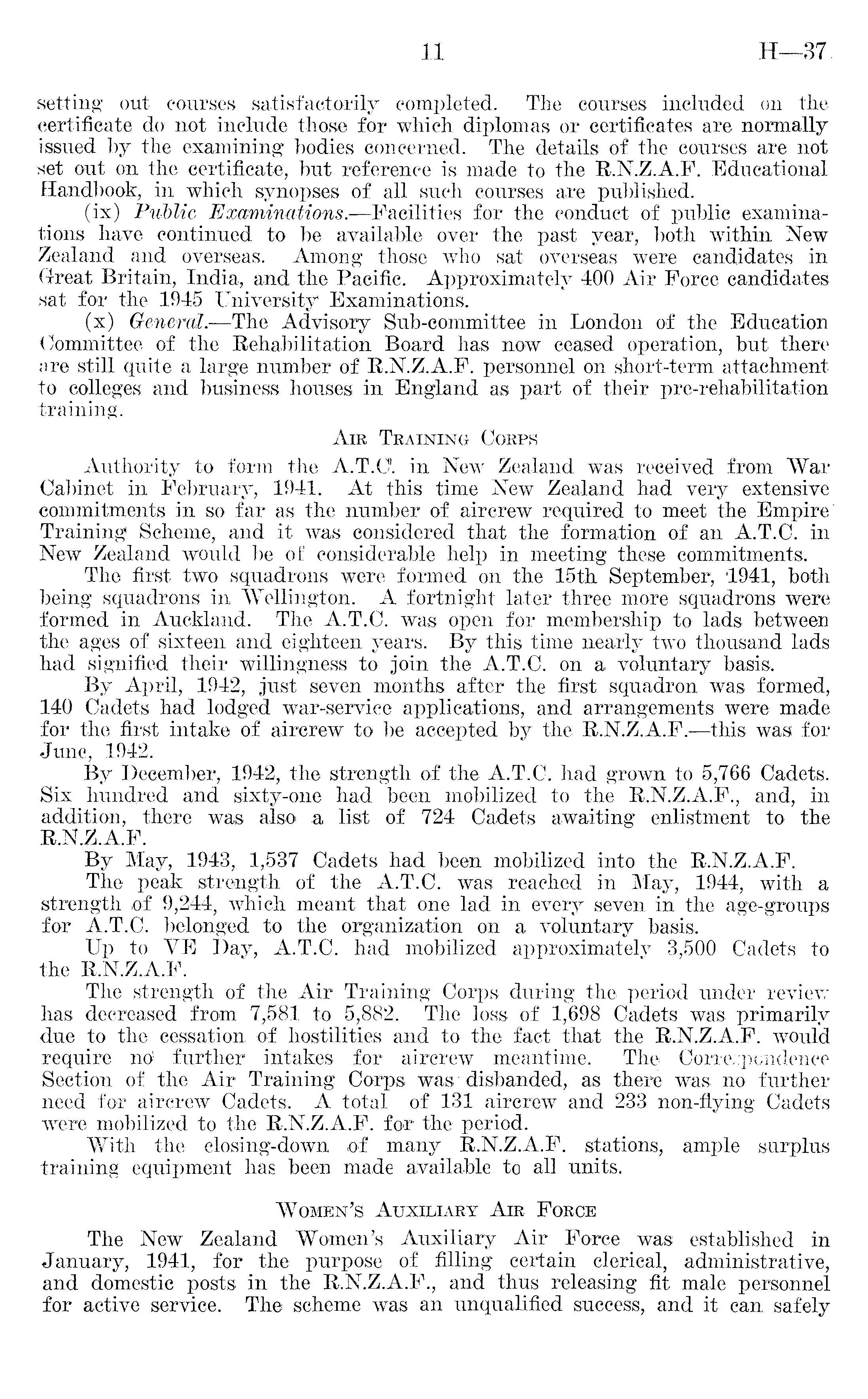 setting out courses satisfactorily completed. The courses included on the certificate do not include those for which diplomas or certificates are normally issued by the examining l bodies concerned. The details of the courses are not set out on the certificate, but reference is made to the R.N.Z.A.F. Educational Handbook, in which synopses of all such courses are published. (ix) Public Examinations. —Facilities for the conduct of public examinations have continued to be available over the past year, both within New Zealand and overseas. Among those who sat overseas were candidates in Great Britain, India, and the Pacific. Approximately 400 Air Force candidates sat for the 1945 University Examinations. (x) General.—The Advisory Sub-committee in London of the Education Committee of the Rehabilitation Board has now ceased operation, but there are still quite a large number of R.N.Z.A.F. personnel on short-term attachment to colleges and business houses in England as part of their pre-rehabilitation training. Aik Training Corps Authority to form the A.T.O. in New Zealand was received from "War Cabinet in February, 1941. At this time New Zealand had very extensive commitments in so far as the number of aircrew required to meet the Empire Training Scheme, and it was considered that the formation of an A.T.C. in New Zealand would be of considerable help in meeting these commitments. The first two squadrons were formed on the 15th September, 1941, both being squadrons in Wellington. A fortnight later three more squadrons were formed in Auckland. The A.T.C. was open for membership to lads between the ages of sixteen and eighteen years. By this time nearly two thousand lads had signified their willingness to join the A.T.C. on a voluntary basis. By April, 1942, just seven months after the first squadron was formed, 140 Cadets had lodged war-service applications, and arrangements were made for the first intake of aircrew to be accepted by the R.N.Z.A.F. —this was for June, 1942. By December, 1942, the strength of the A.T.C. had grown to 5,766 Cadets. Six hundred and sixty-one had been mobilized to the R.N.Z.A.F., and, in addition, there was also a list of 724 Cadets awaiting enlistment to the R.N.Z.A.F. By May, 1943, 1,537 Cadets had been mobilized into the R.N.Z.A.F. The peak strength of the A.T.C. was reached in May, 1944, with a strength of 9,244, which meant that one lad in every seven in the age-groups for A.T.C. belonged to the organization on a voluntary basis. Up to VE Day, A.T.C. had mobilized approximately 3,500 Cadets to the R.N.Z.A.F. The strength of the Air Training Corps during the period under review has decreased from 7,581 to 5,882. The loss of 1,698 Cadets was primarily due to the cessation of hostilities and to the fact that the R.N.Z.A.F. would require noi further intakes for aircrew meantime. The Correspondence Section of the Air Training Corps was disbanded, as there was no further need for aircrew Cadets. A total of 131 aircrew and 233 non-flying Cadets were mobilized to the R.N.Z.A.F. for the period. With the closing-down of many R.N.Z.A.F. stations, ample surplus training equipment has been made available to all units. Women's Auxiliary Air Force The New Zealand Women's Auxiliary Air Force was established in January, 1941, for the purpose of filling certain clerical, administrative, and domestic posts in the R.N.Z.A.F., and thus releasing fit male personnel for active service. The scheme was an unqualified success, and it can safely