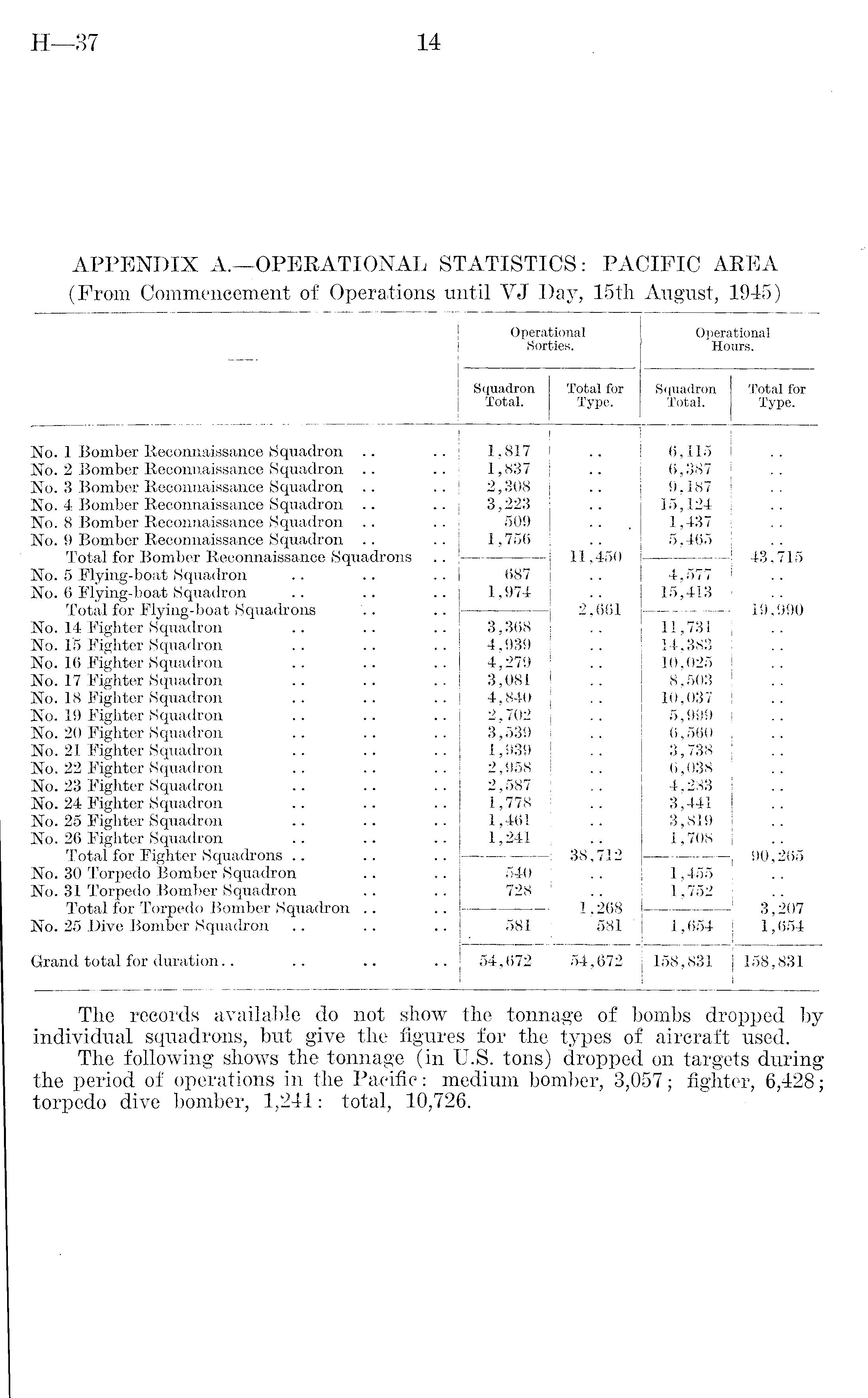(From Commencement of Operations until VJ Day, 15th August, 1945) — Operational Sorties. Operational Hours. Squadron Total. Total for Type. Squadron Total. Total for Type. No. 1 Bomber Reconnaissance Squadron .. No. 2 Bomber Reconnaissance Squadron No. 3 Bomber Reconnaissance Squadron No. 4 Bomber Reconnaissance Squadron No. 8 Bomber Reconnaissance Squadron No. 9 Bomber Reconnaissance Squadron Total for Bomber Reconnaissance Squadrons No. 5 Flying-boat Squadron No. 6 Flying-boat Squadron Total for Flying-boat Squadrons No- 14 Fighter Squadron No. IS Fighter Squadron No. 16 Fighter Squadron No. 17 Fighter Squadron No. 18 Fighter Squadron No. 19 Fighter Squadron No. 20 Fighter Squadron No. 21 Fighter Squadron No. 22 Fighter Squadron No. 23 Fighter Squadron No. 24 Fighter Squadron No. 25 Fighter Squadron No. 26 Fighter Squadron Total for Fighter Squadrons No. 30 Torpedo Bomber Squadron No. 31 Torpedo Bomber Squadron Total for Torpedo Bomber Squadron No. 25 Dive Bomber Squadron Grand total for duration 1,817 1,837 2,308 3,223 509 1,756 2,661 38 * 712 1 *268 581 6,115 6,387 9,187 15,124 1,437 5,465 43,715 | 19,990 90,265 3,207 1,654 687 1,974 4,577 15,413 3,368 4,939 4,279 3,081 4,840 2,702 3,539 1,939 2,958 2,587 1,778 1,461 1,241 11,731 14,383 10,025 8,503 10,037 5,999 6,560 3,738 6,038 4,283 3,441 3,819 1,708 540 728 1,455 1,752 581 1,654 54,672 | 54,672 158,831 158,831