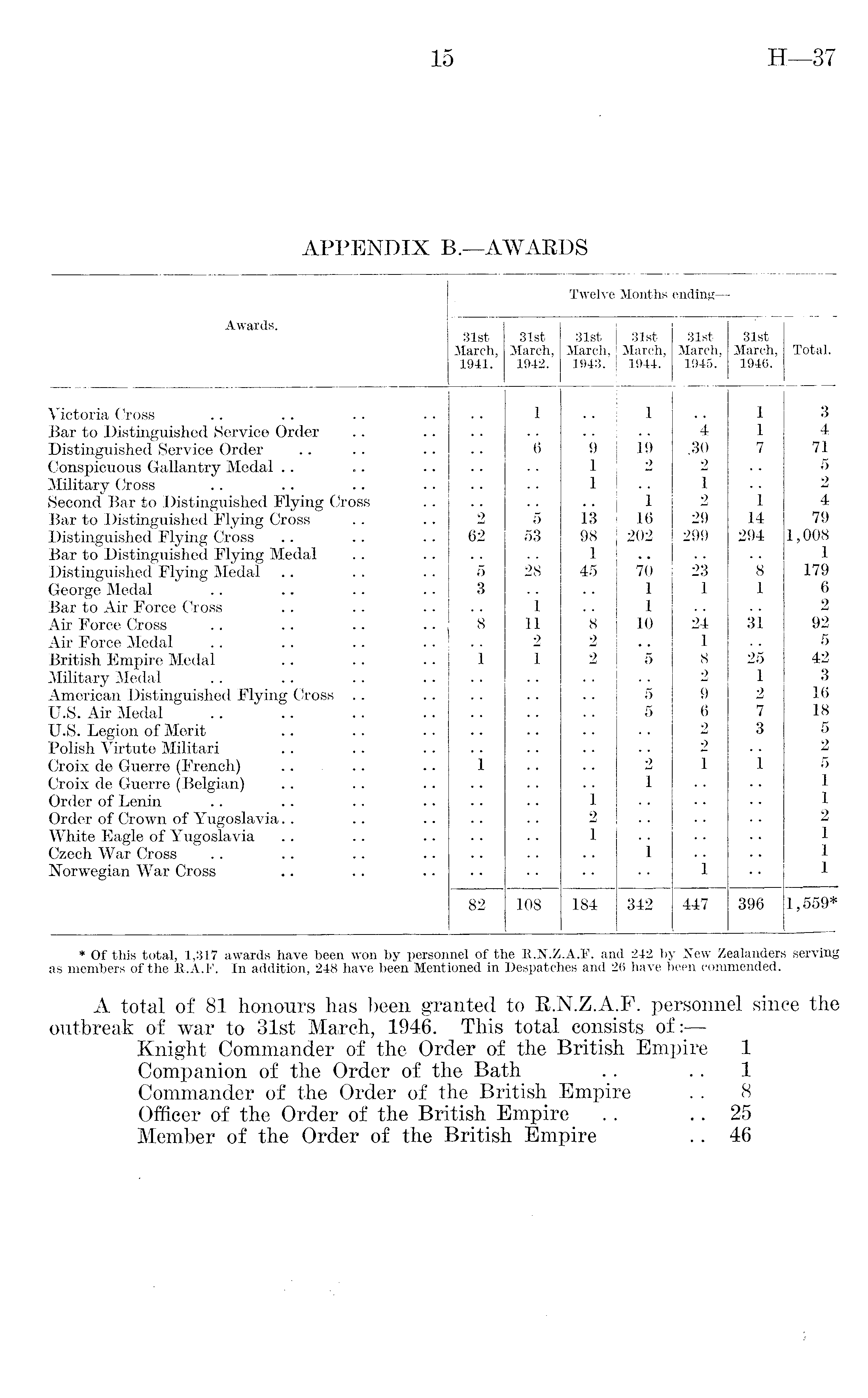 A total of 81 honours has been granted to R.N.Z.A.F. personnel since the outbreak of war to 31st March, 1946. This total consists of:— Knight Commander of the Order of the British Empire 1 Companion of the Order of the Bath .. .. 1 Commander of the Order of the British Empire . . 8 Officer of the Order of the British Empire .. .. 25 Member of the Order of the British Empire .. 46