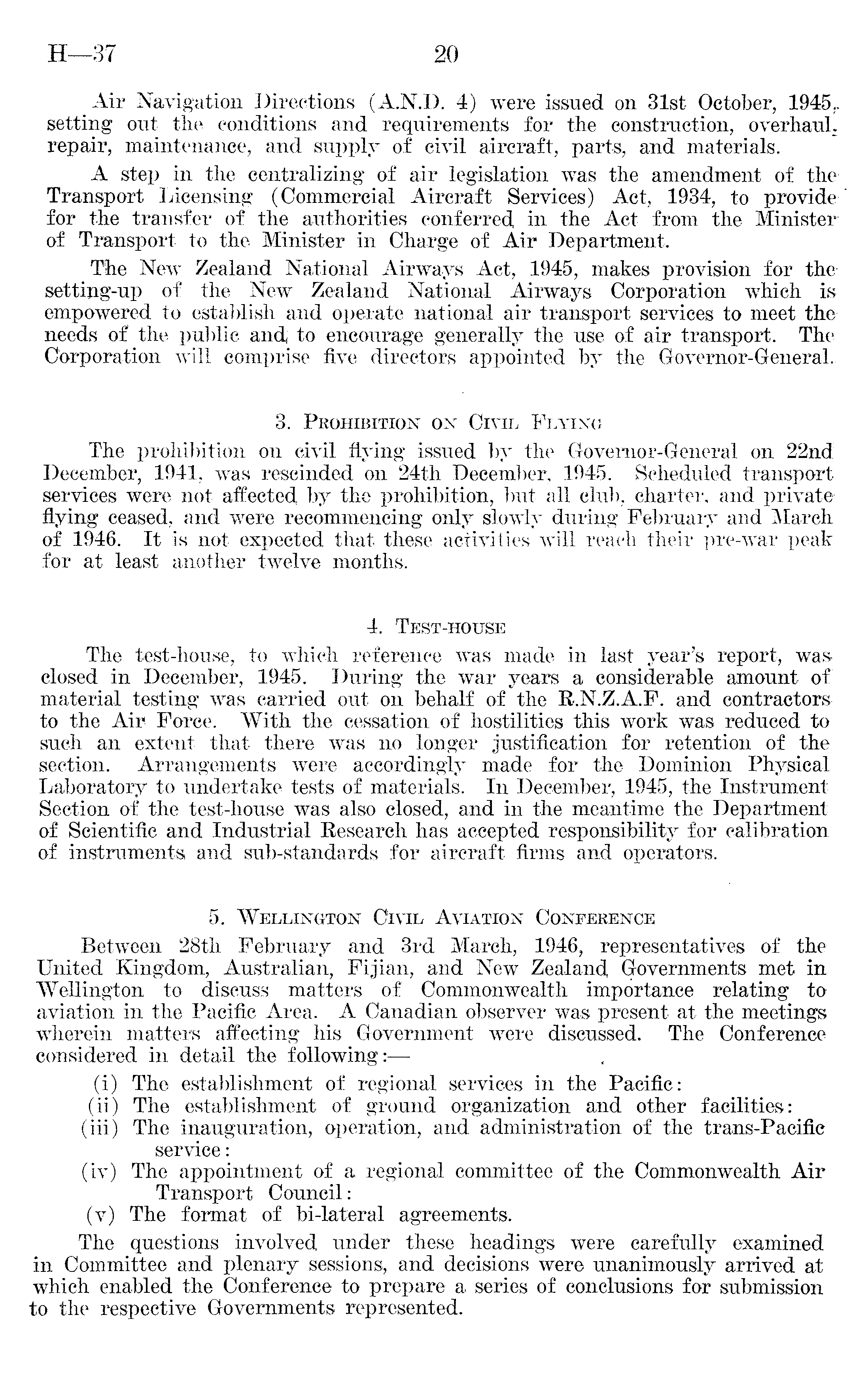 Air Navigation Directions (A.N.D. 4) were issued on 31st October, 1945 r setting out. the conditions and requirements for the construction, overhaul, repair, maintenance, and supply of civil aircraft, parts, and materials, A step in the centralizing of air legislation was the amendment of the Transport Licensing (Commercial Aircraft Services) Act, 1934, to provide for the transfer of the authorities conferred in the Act from the Minister of Transport to the Minister in Charge of Air Department. The New Zealand National Airways Act, 1945, makes provision for the setting-up of the New Zealand National Airways Corporation which is empowered to establish and operate national air transport services to meet the needs of the public and to encourage generally the use of air transport. The Corporation will comprise five directors appointed by the Governor-General. 3. Prohibition on Civil Flying The prohibition on civil flying issued by the Governor-General on 22nd December, 1941, was rescinded on 24th December, 1945. Scheduled transport services were not affected, by the prohibition, but all club, charter, and private flying ceased, and were recommencing only slowly during February and March of 1946. It is not expected that these activities will reach their pre-war peak for at least another twelve months. 4. Test-house The test-house, to which reference was made in last year's report, was closed in December, 1945. During the war years a considerable amount of material testing was carried out on behalf of the R.N.Z.A.F. and contractors to the Air Force. "With the cessation of hostilities this work was reduced to such an extent that there was no longer justification for retention of the section. Arrangements were accordingly made for the Dominion Physical Laboratory to undertake tests of materials. In December, 1945, the Instrument Section of the test-house was also closed, and in the meantime the Department of Scientific and Industrial Research has accepted responsibility for calibration of instruments and sub-standards for aircraft firms and operators. 5. Wellington Civil Aviation Conference Between 28th February and 3rd March, 1946, representatives of the United Kingdom, Australian, Fijian, and New Zealand, Governments met in Wellington to discuss matters of Commonwealth importance relating to aviation in the Pacific Area. A Canadian observer was present at the meetings wherein matters affecting his Government were discussed. The Conference considered in detail the following:— (i) The establishment of regional services in the Pacific: (ii) The establishment of ground organization and other facilities: (iii) The inauguration, operation, and administration of the trans-Pacific service: (iv) The appointment of a regional committee of the Commonwealth Air Transport Council: (v) The format of bi-lateral agreements. The questions involved, under these headings were carefully examined in Committee and plenary sessions, and decisions were unanimously arrived at which enabled the Conference to prepare a series of conclusions for submission to the respective Governments represented.