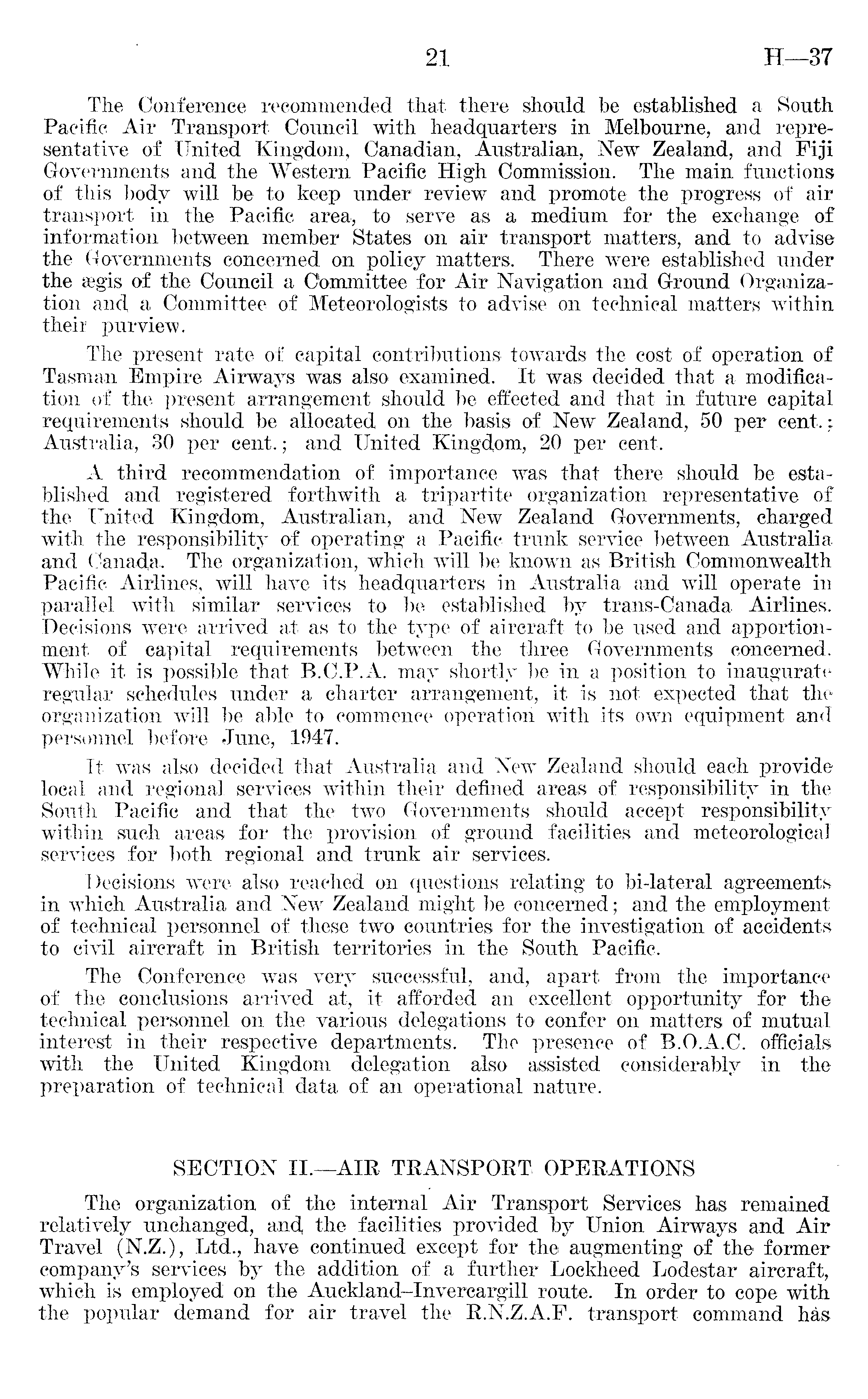 The Conference recommended that there should be established a South Pacific Air Transport Council with headquarters in Melbourne, and representative of United Kingdom, Canadian, Australian, New Zealand, and Fiji Governments and the Western Pacific High Commission. The main functions of this body will be to keep under review and promote the progress of air transport in the Pacific area, to serve as a medium for the exchange of information between member States on air transport matters, and to advise the Governments concerned on policy matters. There were established under the segis of the Council a Committee for Air Navigation and Ground Organization and, a Committee of Meteorologists to advise on technical matters within their purview. The present rate of capital contributions, towards the cost of operation of Tasman Empire Airways was also examined. It was decided that a modification of the present arrangement should be effected and that in future capital requirements should be allocated on the basis of New Zealand, 50 per cent.; Australia, 30 per cent.; and United Kingdom, 20 per cent. A third recommendation of importance was that there should be established and registered forthwith a tripartite organization representative of the United Kingdom, Australian, and New Zealand Governments, charged with the responsibility of operating a Pacific trunk service between Australia and Canad,a, The organization, which will be known as British Commonwealth Pacific Airlines, will have its headquarters in Australia and will operate in parallel with similar services to be established by trans-Canada. Airlines, Decisions were arrived at as to the type of aircraft to be used and apportionment of capital requirements between the three Governments concerned. While it is possible that B.C.P.A. may shortly be in a position to inaugurate regular schedules under a charter arrangement, it is not expected that the organization will be able to commence operation with its own equipment and personnel before June, 1947. It was also decided that Australia and New Zealand should each provide local and regional services within their defined areas of responsibility in the South Pacific and that the two Governments should accept responsibility within such areas for the provision of ground facilities and meteorological services for both regional and trunk air services. Decisions were also reached on questions relating to bi-lateral agreements in which Australia and New Zealand might be concerned; and the employment of technical personnel of these two countries for the investigation of accidents to civil aircraft in British territories in the South Pacific. The Conference was very successful, and, apart from the importance of the conclusions arrived at, it afforded an excellent opportunity for the technical personnel on the various delegations to confer on matters of mutual interest in their respective departments. The presence of 8.0.A.C. officials with the United Kingdom delegation also assisted considerably in the preparation of technical data of an operational nature. SECTION lI.—AIR TRANSPORT OPERATIONS The organization of the internal Air Transport Services has remained relatively unchanged, and the facilities provided by Union Airways and Air Travel (N.Z.), Ltd., have continued except for the augmenting of the former company's services by the addition of a further Lockheed Lodestar aircraft, which is employed on the Auckland-Invercargill route. In order to cope with the popular demand for air travel the R.N.Z.A.F. transport command has