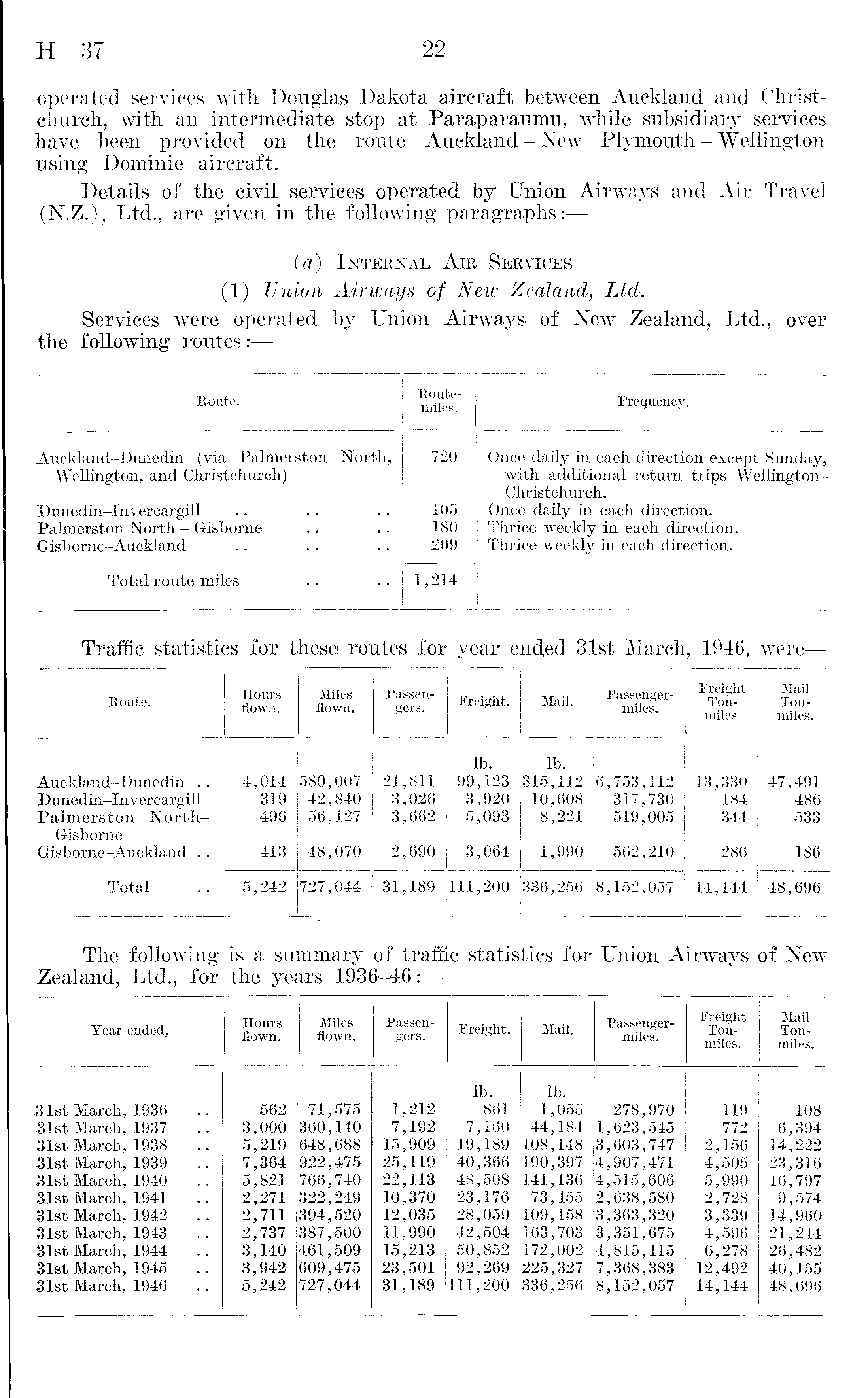 The following is a summary of traffic statistics for Union Airways of New Zealand, Ltd., for the years 1936-46: