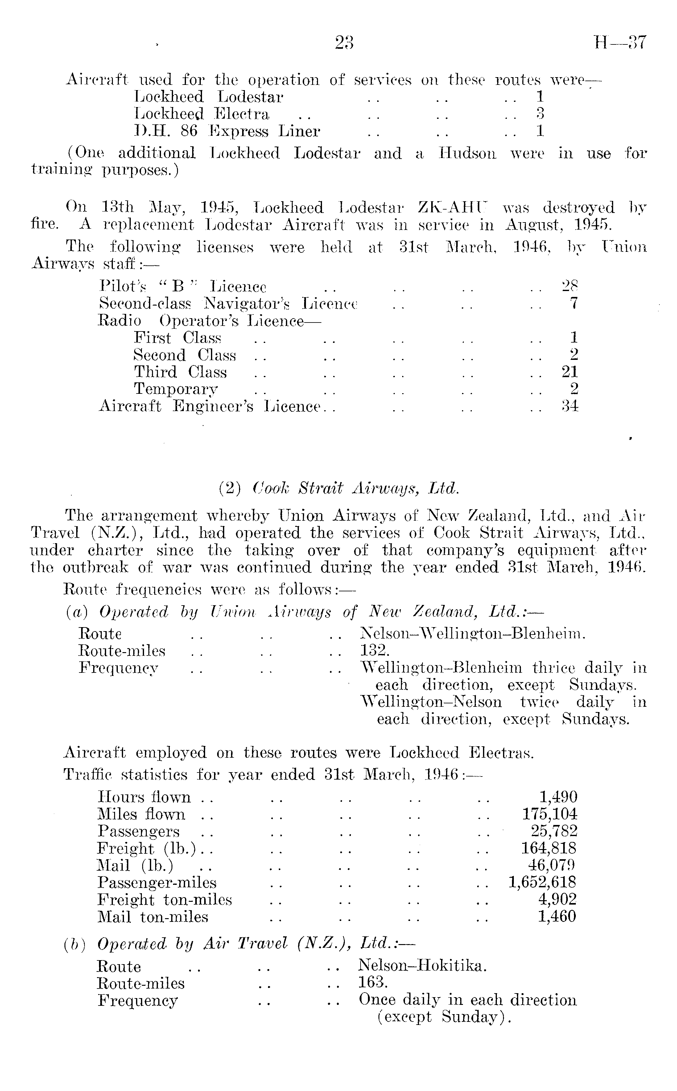 Aircraft used for the operation of services on these routes were— Lockheed Lodestar . . . . . . 1 Lockheed Electra . . . . . . 3 D.H. 86 Express Liner . . . . 1 (One additional Lockheed Lodestar and a Hudson were in use for training purposes.) On 13th May, 1945, Lockheed Lodestar ZK-AHU was destroyed by fire. A replacement Lodestar Aircraft was in service in August, 1945. The following licenses were held at 31st- March, 1946, by Union Airways staff:— Pilot's " B Licence .. .. .. 28 Second-class Navigator's Licence . . . . 7 Radio Operator's Licence— First Class . . . . . . . . 1 Second Class . . .. . . . . 2 Third Class . . . . . . . . 21 Temporary . . . . . . . . 2 Aircraft Engineer's Licence. . . . . . 34 (2) Cook Strait Airways, Ltd. The arrangement whereby Union Airways of New Zealand, Ltd., and Air Travel (N.Z.), Ltd., had operated the services of Cook Strait Airways, Ltd., under charter since the taking over of that company's equipment after the outbreak of war was continued during the year ended 31st March, 1946. Route frequencies were as follows : (a) Operated by Union Airwaays of New Zealand, Ltd.:— Route . . . . . . Nelson-Wellington-Blenheim. Route-miles . . . . . . 132. Frequency . . . . . . Wellington-Blenheim thrice daily in each direction, except Sundays. Wellington-Nelson twice daily in each direction, except Sundays. Aircraft employed on these routes were Lockheed Electras. Traffic statistics for year ended 31st March, 1946: Hours flown . . .. . . . . . . 1,490 Miles flown . . . . .. . . . . 175,104 Passengers . . . . .. . . . . 25,782 Freight (lb.). . .. . . . . .. 164,818 Mail (lb.) .. .. .. .. .. 46,079 Passenger-miles • • • • • • • . 1,652,618 Freight ton-miles . . .. . . .. 4,902 Mail ton-miles . . . . . . .. 1,460 (b) Operated by Air Travel (N.Z.), Ltd.:— Route .. •. • • Nelson-Hokitika. Route-miles .. .. 163. Frequency .. .. Once daily in each direction (except Sunday).