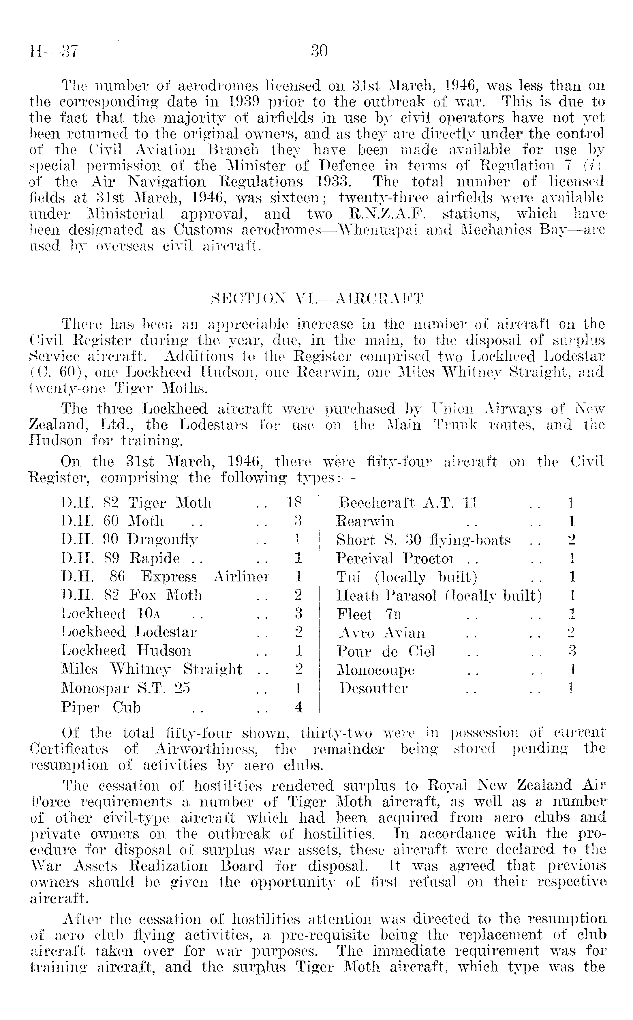 The number of aerodromes licensed on 31st March, 1946, was less than on the corresponding date in 1939 prior to the outbreak of war. This is due to the fact that the majority of airfields in use by civil operators have not yet been returned to the original owners, and as they are directly under the control of the Civil Aviation Branch they have been made available for use by special permission of the Minister of Defence in terms of Regulation 7 (i) of the Air Navigation Regulations 1933. The total number of licensed fields at 31st March, 1946, was sixteen; twenty-three airfields were available under Ministerial approval, and two R.N.Z.A.F. stations, which have been designated as Customs aerodromes—Whenuapai and Mechanics Bay—are used by overseas civil aircraft. SECTION VI.—AIRCRAFT There has been an appreciable increase in the number of aircraft on the Civil Register during the year, due, in the main, to the disposal of surplus Service aircraft. Additions to the Register comprised two Lockheed Lodestar (C. 60), one Lockheed Hudson, one Rearwin, one Miles Whitney Straight, and twenty-one Tiger Moths. The three Lockheed aircraft were purchased by Union Airways of New Zealand, Ltd., the Lodestars for use on the Main Trunk routes, and the Hudson for training. On' the 31st March, 1946, there were fifty-four aircraft on the Civil Register, comprising the following types:— D.H. 82 Tiger Moth . . 18 Beechcraft A.T. 11 1 D.H. 60 Moth .. . . 3 Rearwin . . . . 1 D.H. 90 Dragonfly . . 1 Short S. 30 flying-boats . . 2 D.H. 89 Rapide .. .. 1 PercivaJ Proctor .. . . 1 D.H. 86 Express Airliner 1 Tui (locally built) .. 1 D.H. 82 Fox Moth . . 2 Heath Parasol (locally built) 1 Lockheed 10a . . . . 3 Fleet 7b .. 1 Lockheed Lodestar . . 2 Avro Avian .. .. 2 Lockheed Hudson . . 1 Pour de Ciel . . .. 3 Miles Whitney Straight .. 2 Monocoupe . . . . 1 Monospar S.T. 25 1 Desoutter .. .. 1 Piper Cub . . . . 4 Of the total fifty-four shown, thirty-two were in possession of current Certificates of Airworthiness, the remainder being stored pending the resumption of activities by aero clubs. The cessation of hostilities rendered surplus to Royal New Zealand Air Force requirements a number of Tiger Moth aircraft, as well as a number of other civil-type aircraft which had been acquired from aero clubs and private owners on the outbreak of hostilities. In accordance with the procedure for disposal of surplus war assets, these aircraft were declared to the War Assets Realization Board for disposal. It was agreed that previous owners should be given the opportunity of first refusal on their respective aircraft. After the cessation of hostilities attention was directed to the resumption of aero club flying activities, a pre-requisite being the replacement of club aircraft taken over for war purposes. The immediate requirement was for training aircraft, and the surplus Tiger Moth aircraft, which type was the
