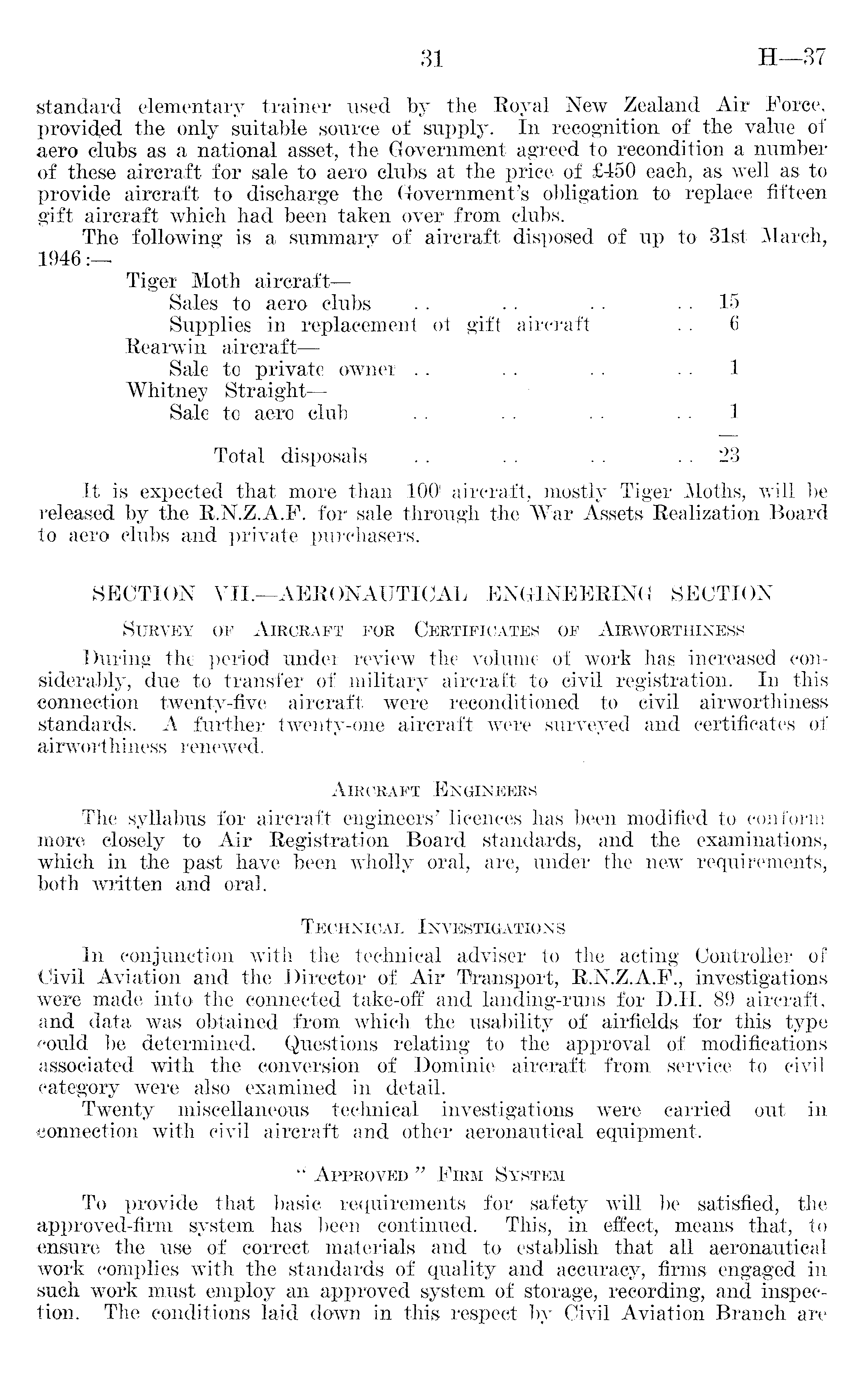 standard elementary trainer used by the Royal New Zealand Air Force, provided the only suitable source of supply. In recognition of the value of aero clubs as a national asset, the Government agreed to recondition a number of these aircraft for sale to aero clubs at the price of £450 each, as well as to provide aircraft to discharge the Government's obligation to replace fifteen gift aircraft which had been taken over from clubs. The following is a summary of aircraft disposed of up to 31st March, 1946:—• Tiger Moth aircraftSales to aero clubs . . . . . . 15 Supplies in replacement of gift aircraft . . 6 Rearwin aircraft— Sale to private owner . . . . . . 1 "Whitney Straight— Sale to aero club . . . . 1 Total disposals . . . . . . 23 It is expected that more than 100 aircraft, mostly Tiger Moths, will be released by the R.N.Z.A.F. for sale through the War Assets Realization Board to aero clubs and private purchasers. SECTION VII.—AERONAUTICAL ENGINEERING SECTION Survey of Aircraft for Certificates of Airworthiness During the period under review the volume of work has increased considerably, due to transfer of military aircraft to civil registration. In this connection twenty-five aircraft were reconditioned to civil airworthiness standards. A further twenty-one aircraft were surveyed and certificates of airworthiness renewed. Aircraft Engineers The syllabus for aircraft engineers' licences has been modified to conform more closely to Air Registration Board standards, and the examinations, which in the past have been wholly oral, are, under the new requirements, both written and oral. Technical Investigations In conjunction with the technical adviser to the acting Controller of Civil Aviation and the Director of Air Transport, R.N.Z.A.F., investigations were made into the connected take-off and landing-runs for D.H. 89 aircraft, and data was obtained from which the usability of airfields for this type could be determined. Questions relating to the approval of modifications associated with the conversion of Dominie aircraft from service to civil category were also examined in detail. Twenty miscellaneous technical investigations were carried out in connection with civil aircraft and other aeronautical equipment. " Approved " Firm System To provide that basic requirements for safety will be satisfied, the approved-firm system has been continued. This, in effect, means that, to ensure the use of correct materials and to establish that all aeronautical work complies with the standards of quality and accuracy, firms engaged in such work must employ an approved system of storage, recording, and inspection. The conditions laid down in this respect by Civil Aviation Branch are
