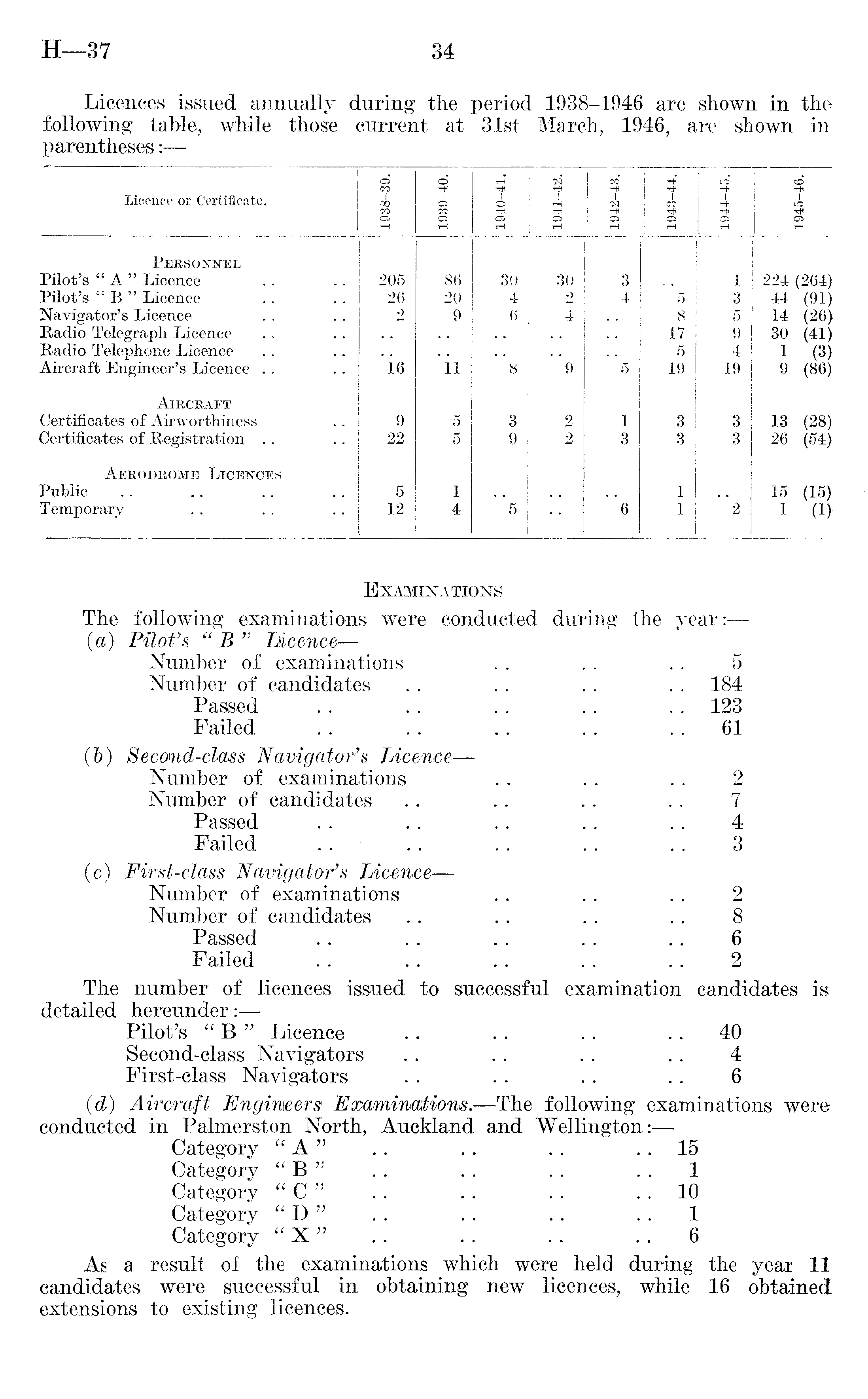 Examinations The following examinations were conducted during the year:— O) Pilot's " B " Licence— Number of examinations . . . . . . 5 Number of candidates . . . . . . . . 184 Passed . . . . . . . . . . 123 Failed . . . . .. .. 61 (&) Second-class Navigator's Licence — Number of examinations . . . . . . 2 Number of candidates . . . . . . . . 7 Passed .. . . .. . . . . 4 Failed .. .. .. .. .. 3 (c) First-class Navigator's Licence— Number of examinations .. . . . . 2 Number of candidates . . .. . . .. 8 Passed .. .. .. .. .. 6 Failed . . . . . . . . . . 2 The number of licences issued to successful examination candidates is detailed hereunder:— Pilot's " B " Licence .. . . . . . . 40 Second-class Navigators . . .. . . . . 4 First-class Navigators .. .. .. .. 6 (d) Aircraft Engineers Exami/rmtions. —The following examinations were conducted in Palmerston North, Auckland and Wellington : Category "A " . . .. .. .. 15 Category " B " . . . . . . 1 Category "C " .. .. .. . . 10 Category "D" .. .. .. ..1 Category "X" .. .. .. ..6 As a result of the examinations which were held during the year 11 candidates were successful in obtaining new licences, while 16 obtained extensions to existing licences.