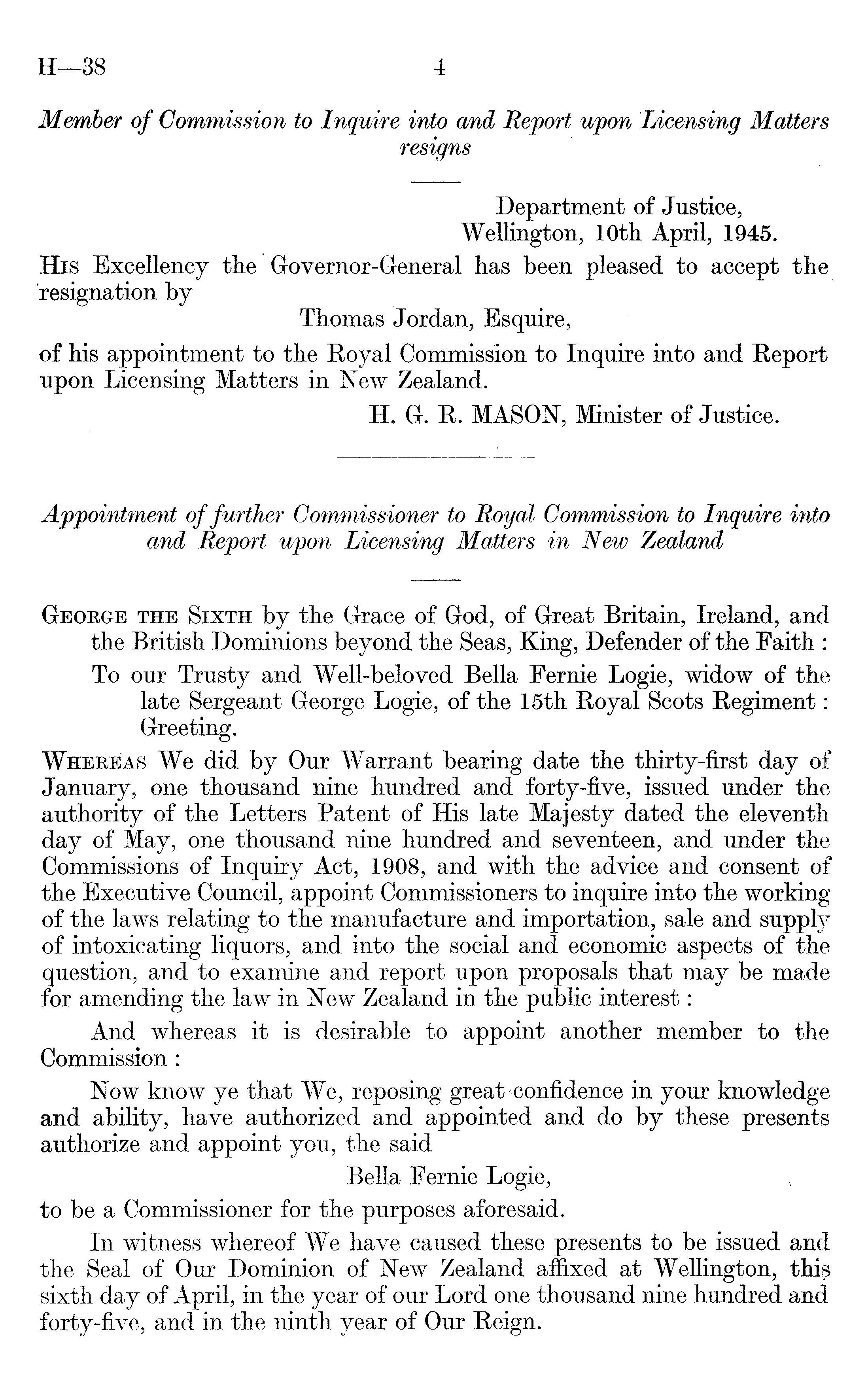 Appointment of further Commissioner to Royal Commission to Inquire into and Report upon Licensing Matters in New Zealand George the Sixth by the Grace of God, of Great Britain, Ireland, and the British Dominions beyond the Seas, King, Defender of the Faith : To our Trusty and Well-beloved Bella Fernie Logie, widow of the late Sergeant George Logie, of the 15th Royal Scots Regiment: Greeting. Whereas We did by Our Warrant bearing date the thirty-first day of January, one thousand nine hundred and forty-five, issued under the authority of the Letters Patent of His late Majesty dated the eleventh day of May, one thousand nine hundred and seventeen, and under the Commissions of Inquiry Act, 1908, and with the advice and consent of the Executive Council, appoint Commissioners to inquire into the working of the laws relating to the manufacture and importation, sale and supply of intoxicating liquors, and into the social and economic aspects of the question, and to examine and report upon proposals that may be made for amending the law in New Zealand in the public interest: And whereas it is desirable to appoint another member to the Commission: Now know ye that We, reposing great' Confidence in your knowledge and ability, have authorized and appointed and do by these presents authorize and appoint you, the said Bella Fernie Logie, to be a Commissioner for the purposes aforesaid. In witness whereof We have caused these presents to be issued and the Seal of Our Dominion of New Zealand affixed at Wellington, this sixth day of April, in the year of our Lord one thousand nine hundred and forty-five, and in the ninth year of Our Reign.