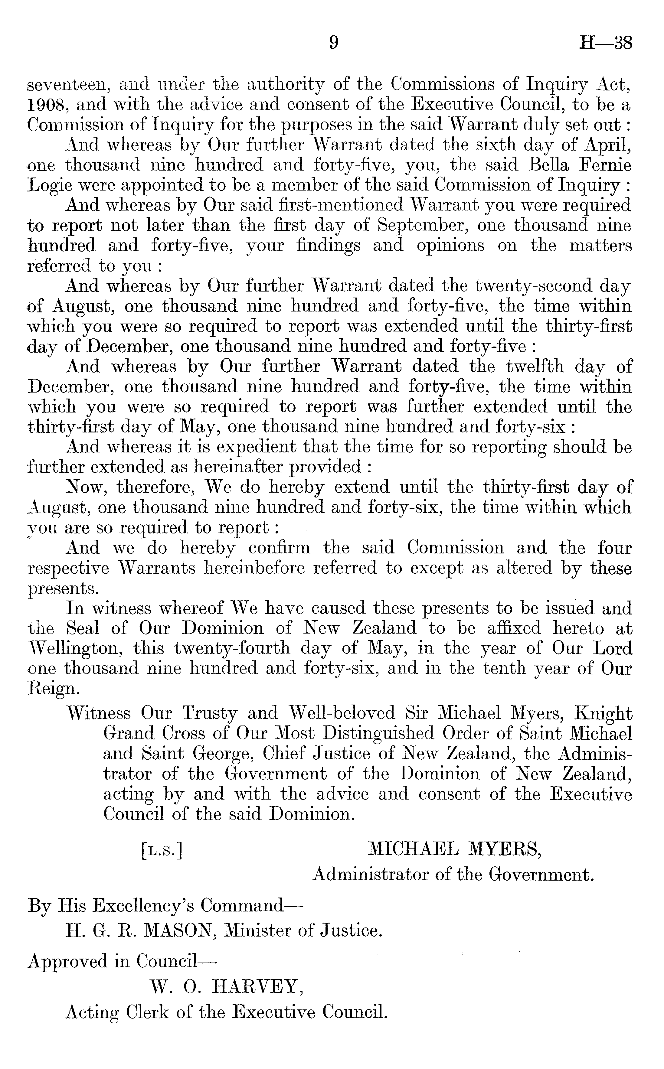 seventeen, and under the authority of the Commissions of Inquiry Act, 1908, and with the advice and consent of the Executive Council, to be a Commission of Inquiry for the purposes in the said Warrant duly set out: And whereas by Our further Warrant dated the sixth day of April, one thousand nine hundred and forty-five, you, the said Bella Fernie Logie were appointed to be a member of the said Commission of Inquiry : And whereas by Our said first-mentioned Warrant you were required to report not later than the first day of September, one thousand nine hundred and forty-five, your findings and opinions on the matters referred to you : And whereas by Our further Warrant dated the twenty-second day of August, one thousand nine hundred and forty-five, the time within which you were so required to report was extended until the thirty-first day of December, one thousand nine hundred and forty-five : And whereas by Our further Warrant dated the twelfth day of December, one thousand nine hundred and forty-five, the time within which you were so required to report was further extended until the thirty-first day of May, one thousand nine hundred and forty-six : And whereas it is expedient that the time for so reporting should be further extended as hereinafter provided : Now, therefore, We do hereby extend until the thirty-first day of August, one thousand nine hundred and forty-six, the time within which you are so required to report: And we do hereby confirm the said Commission and the four respective Warrants hereinbefore referred to except as altered by these presents. In witness whereof We have caused these presents to be issued and the Seal of Our Dominion of New Zealand to be affixed hereto at Wellington, this twenty-fourth day of May, in the year of Our Lord one thousand nine hundred and forty-six, and in the tenth year of Our Reign. Witness Our Trusty and Well-beloved Sir Michael Myers, Knight Grand Cross of Our Most Distinguished Order of Saint Michael and Saint George, Chief Justice of New Zealand, the Administrator of the Government of the Dominion of New Zealand, acting by and with the advice and consent of the Executive Council of the said Dominion. [l.S.] MICHAEL MYERS, Administrator of the Government. By His Excellency's Command — H. G. R. MASON, Minister of Justice. Approved in Council— W. 0. HARVEY, Acting Clerk of the Executive Council.