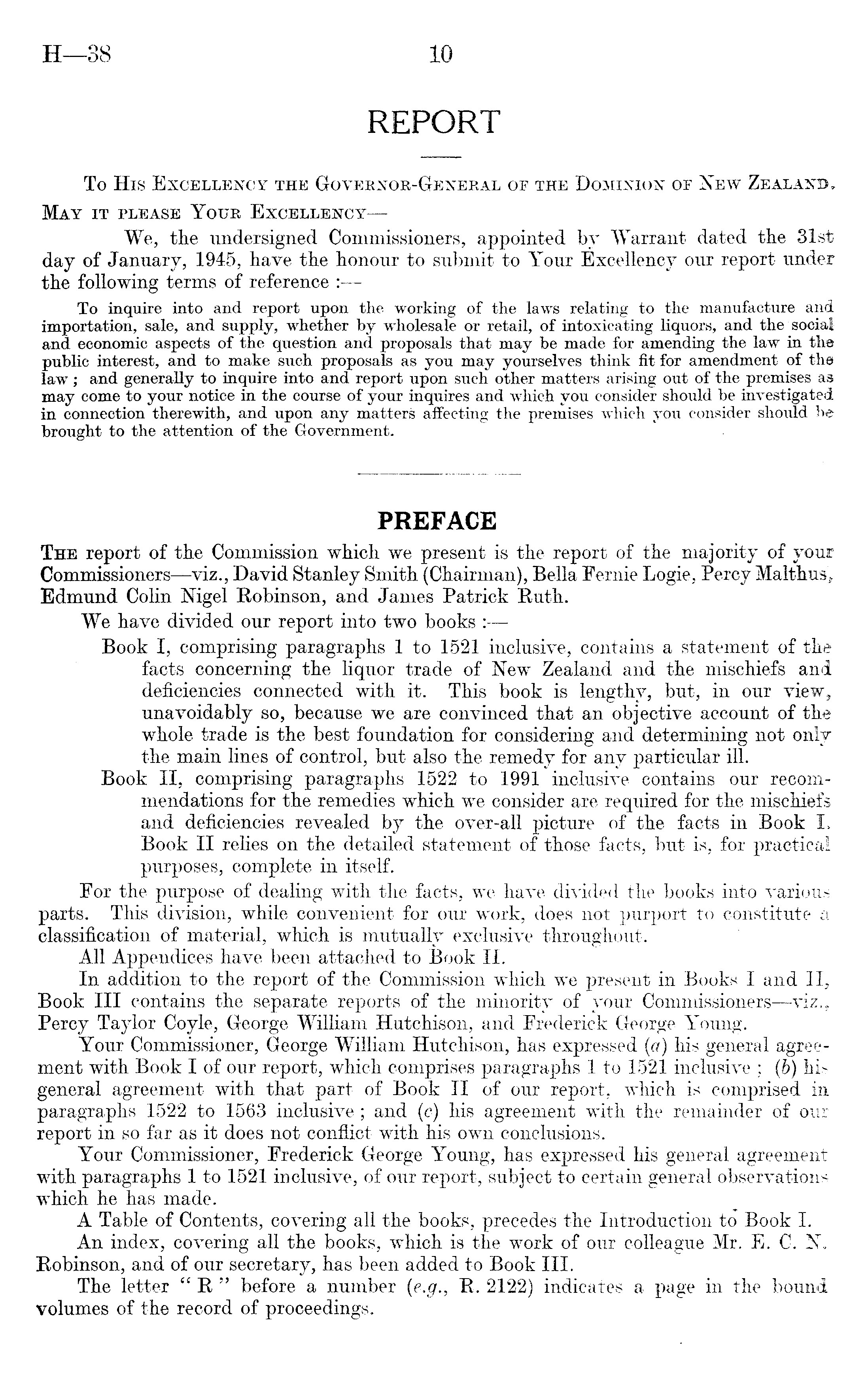 To His Excellency the Governor-General op the Dominion of New Zealand. May it please Your Excellency— We, the undersigned Commissioners, appointed by Warrant dated the 31st day of January, 1945, have the honour to submit to Your Excellency our report under the following terms of reference : To inquire into and report upon the working of the laws relating to the manufacture and importation, sale, and supply, whether by wholesale or retail, of intoxicating liquors, and the social and economic aspects of the question and proposals that may be made for amending the law in the public interest, and to make such proposals as you may yourselves think fit for amendment of the law ; and generally to inquire into and report upon such other matters arising out of the premises as may come to your notice in the course of your inquires and which you consider should be investigated in connection therewith, and upon any matters affecting the premises which you consider should be brought to the attention of the Government.